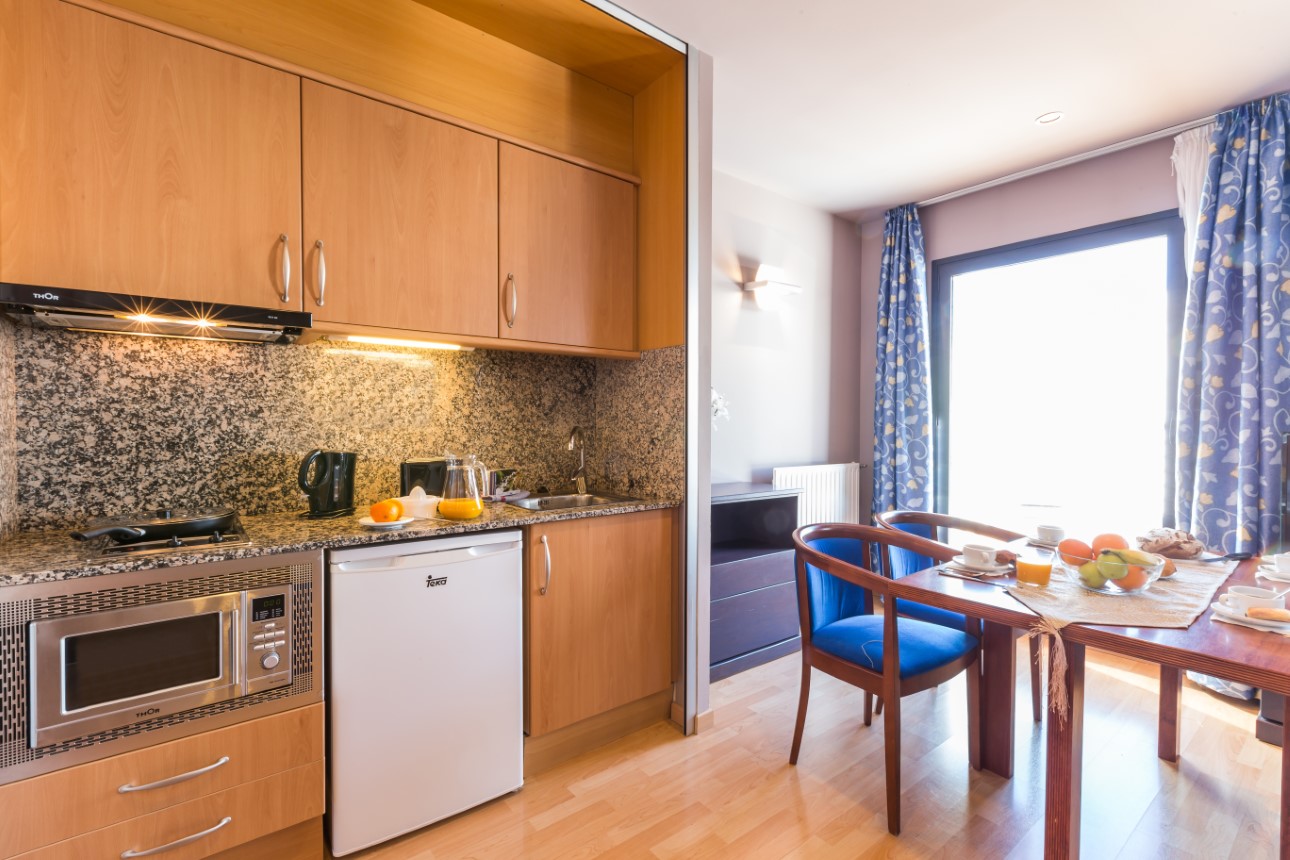 - Keuken: Volledig uitgeruste open kitchenette, geïntegreerd in de woonkamer