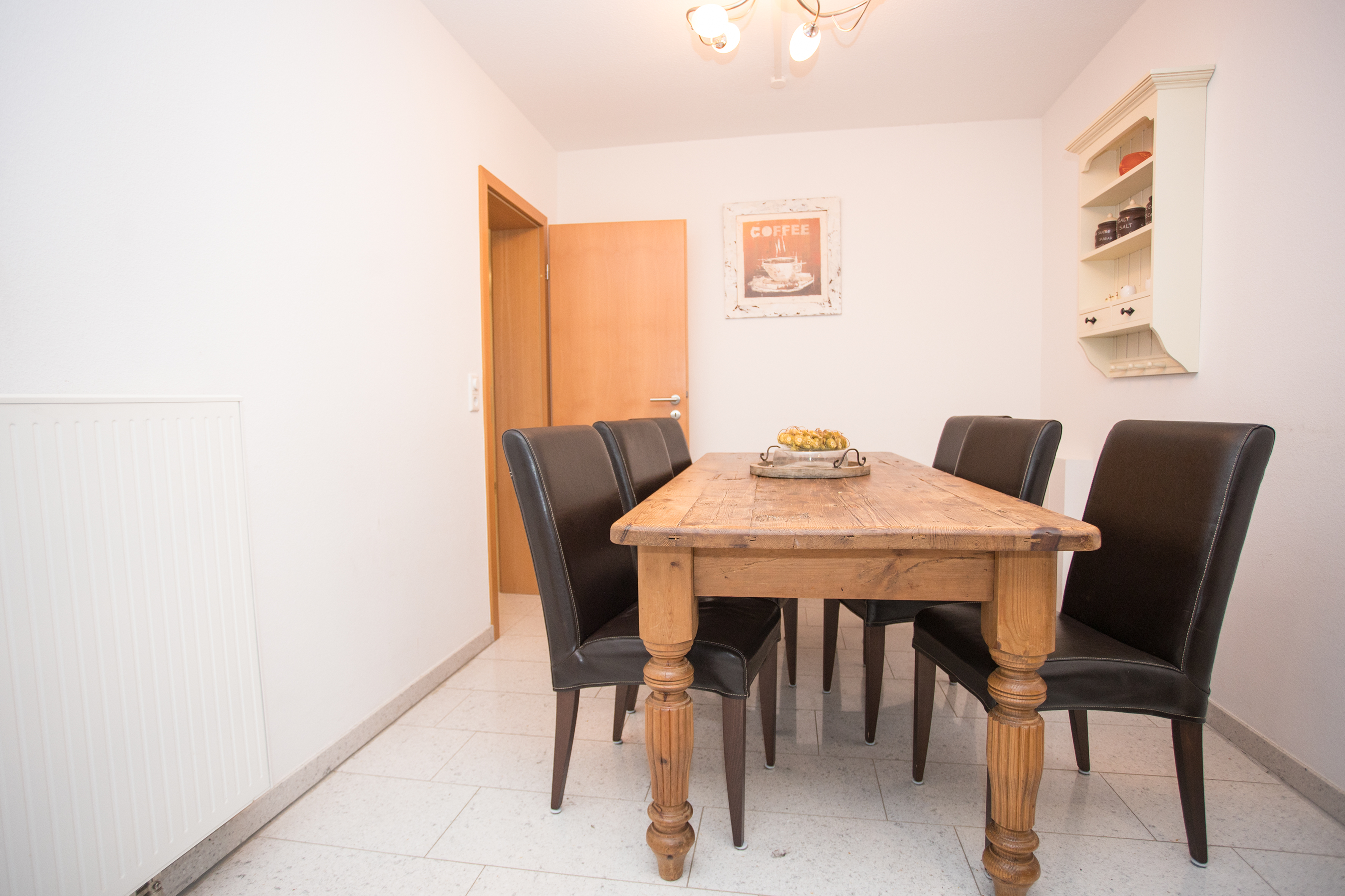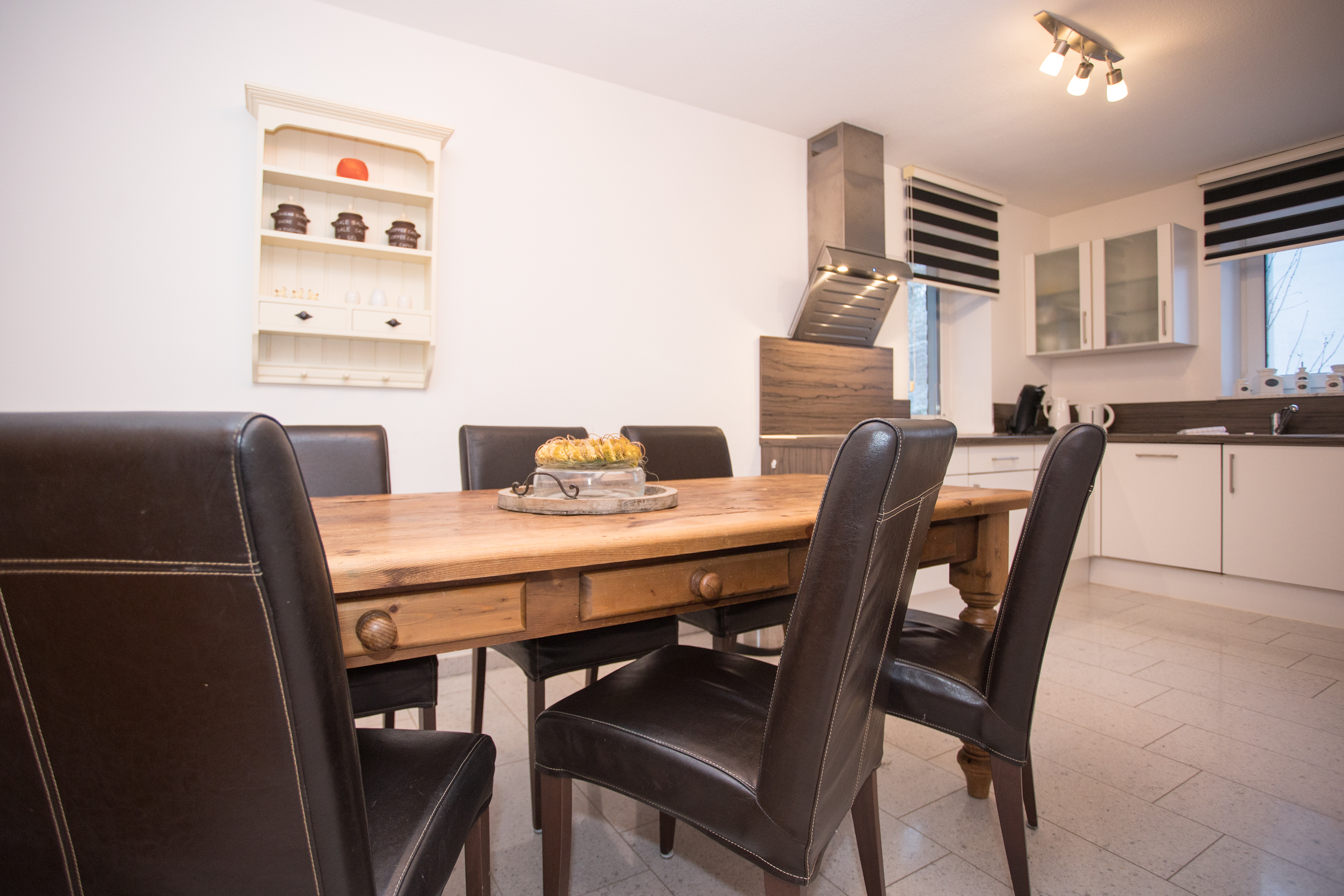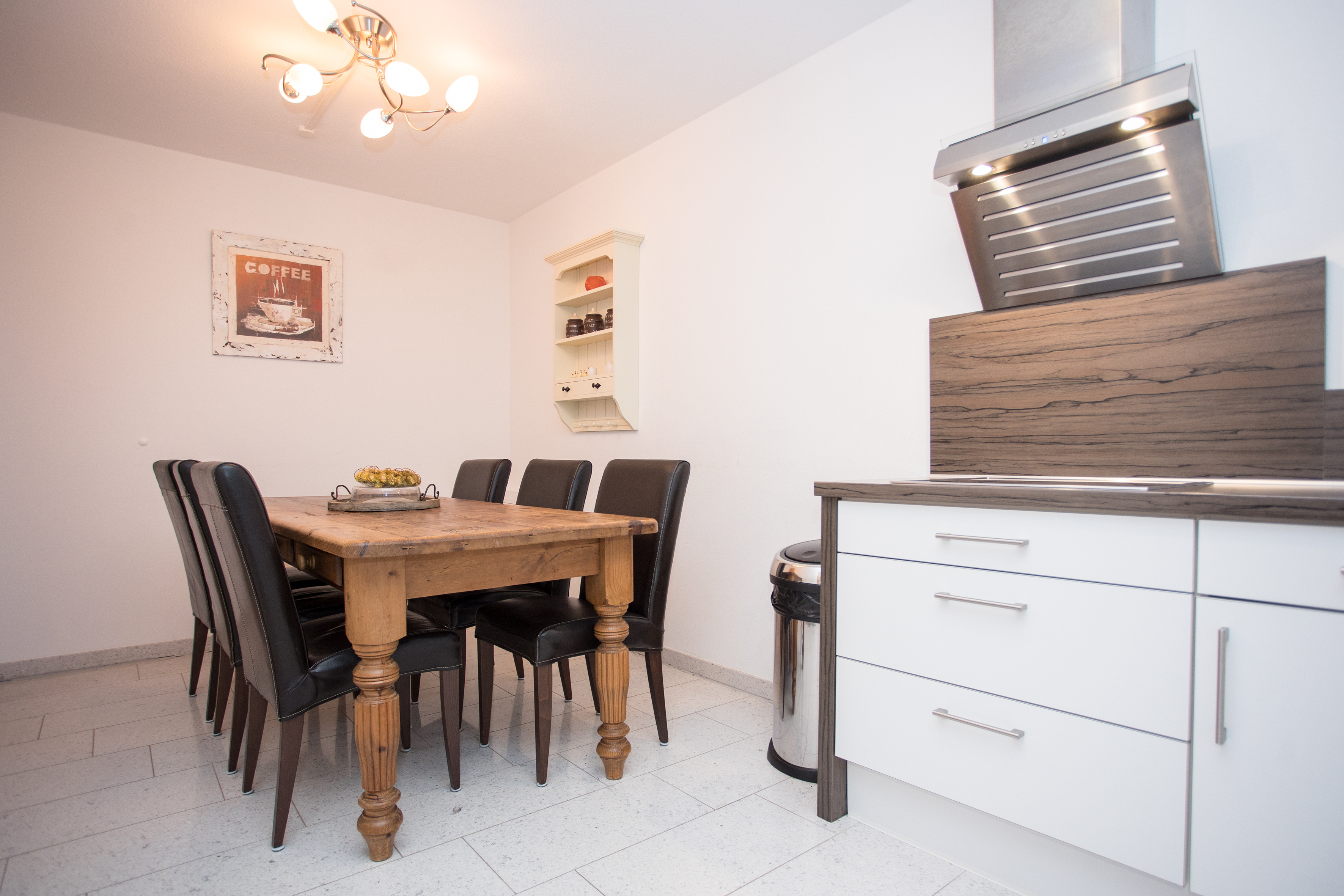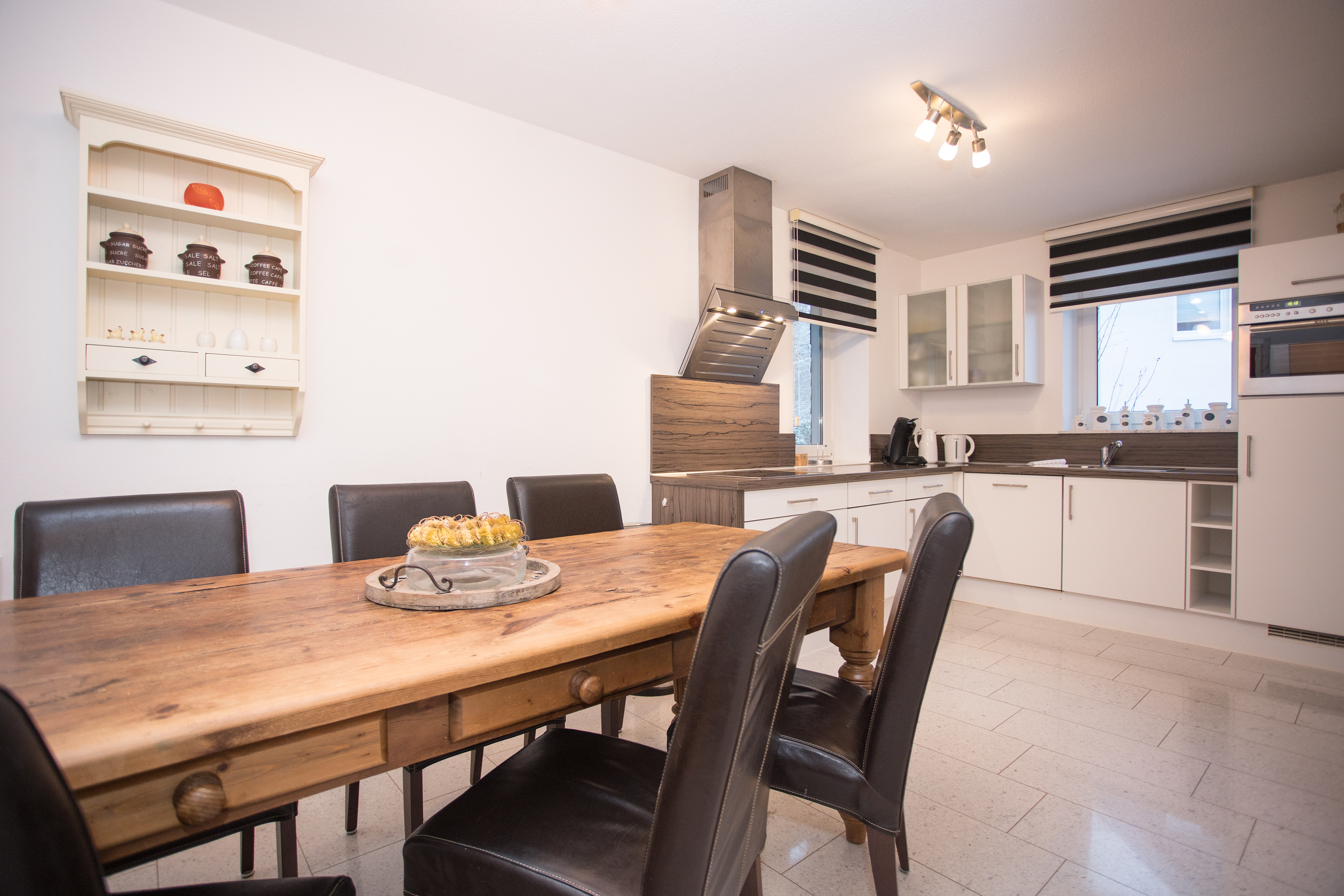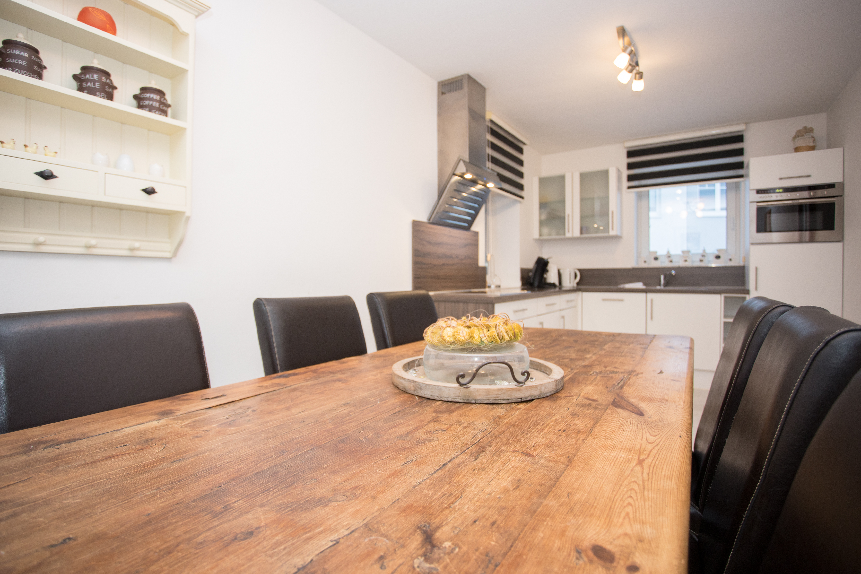 De grote, volledig uitgeruste keuken bevat alles wat u nodig heeft, zoals een combimagnetron, vaatwasser en voldoende werkruimte. Direct naast de keuken biedt de eetkamer een lichte en uitnodigende ruimte voor gezamenlijke maaltijden.