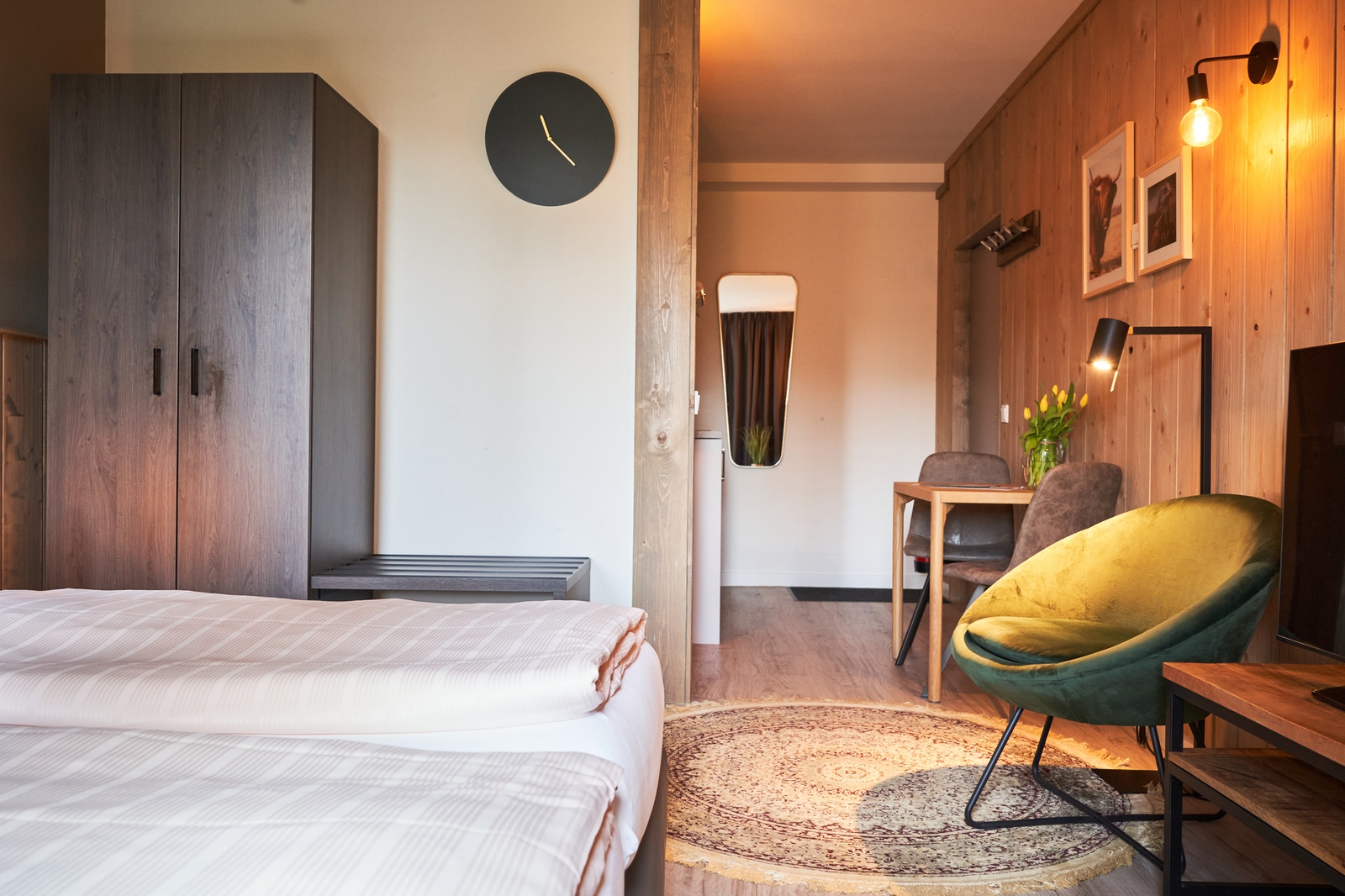 De slaap- en woonkamer is ingericht met een tweepersoonsbed en een gezellige zithoek met 2 fauteuils.