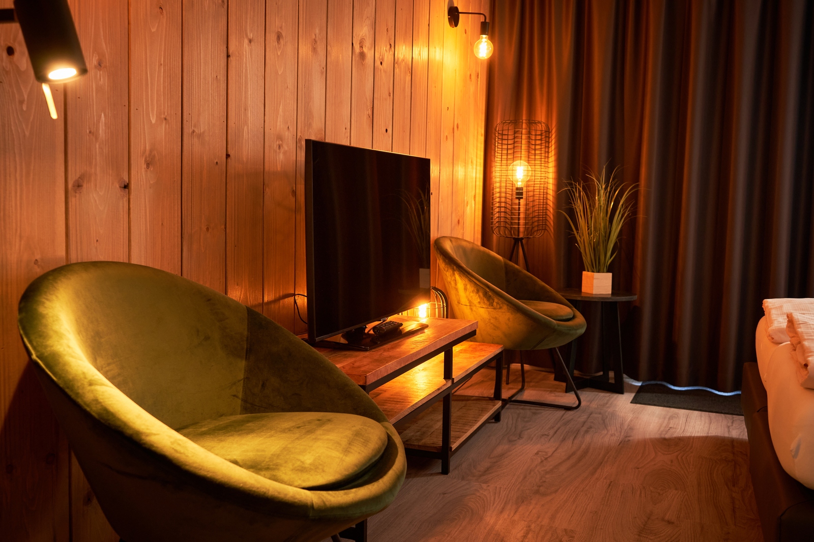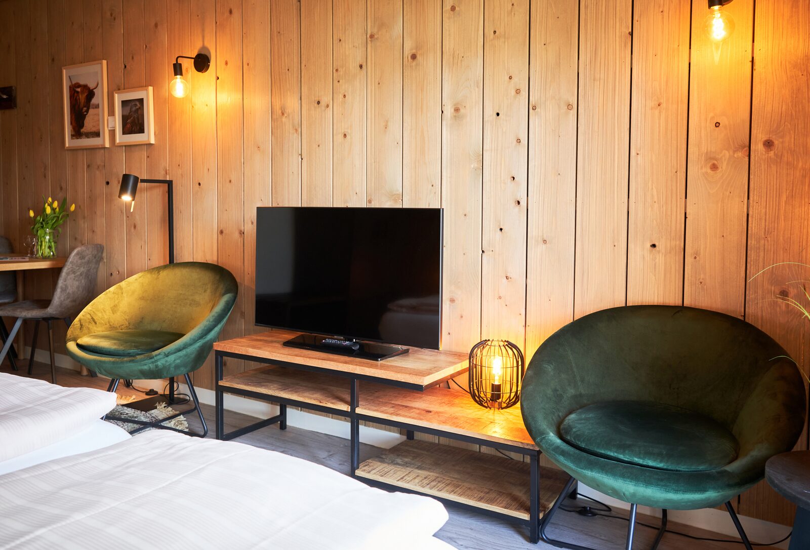Een flatscreentv met HDMI en USB-aansluiting is ook aanwezig.