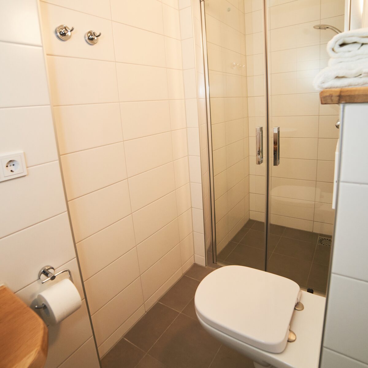 De badkamer is voorzien van een toilet, een wastafel en een douche. Over koude voeten hoeft u zich geen zorgen te maken, er is vloerverwarming aanwezig.