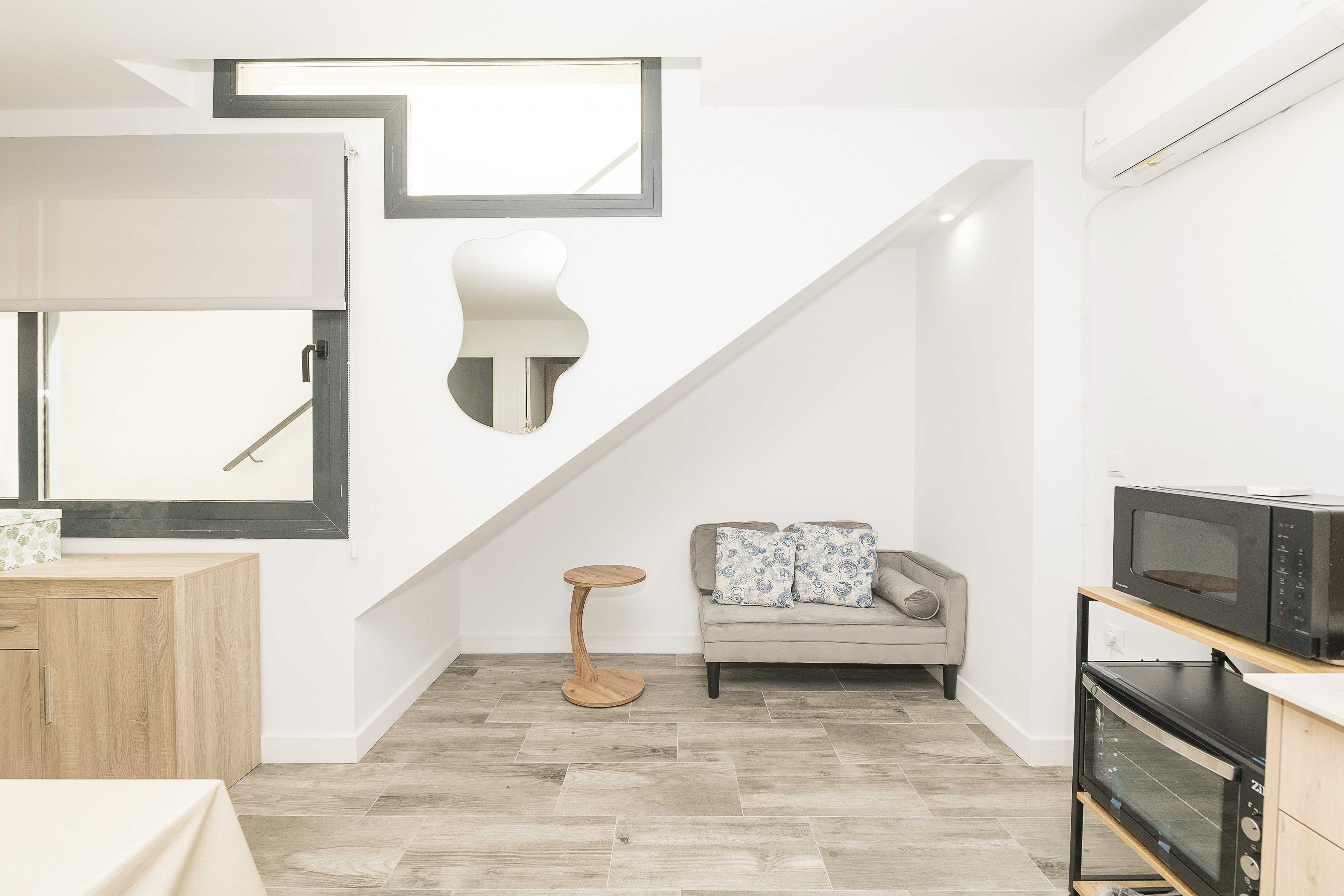 De accommodatie bevindt zich in een souterrain en is bereikbaar via een trap vanuit een gedeelde ingang. De eigenaar woont in het hoofdgebouw erboven.