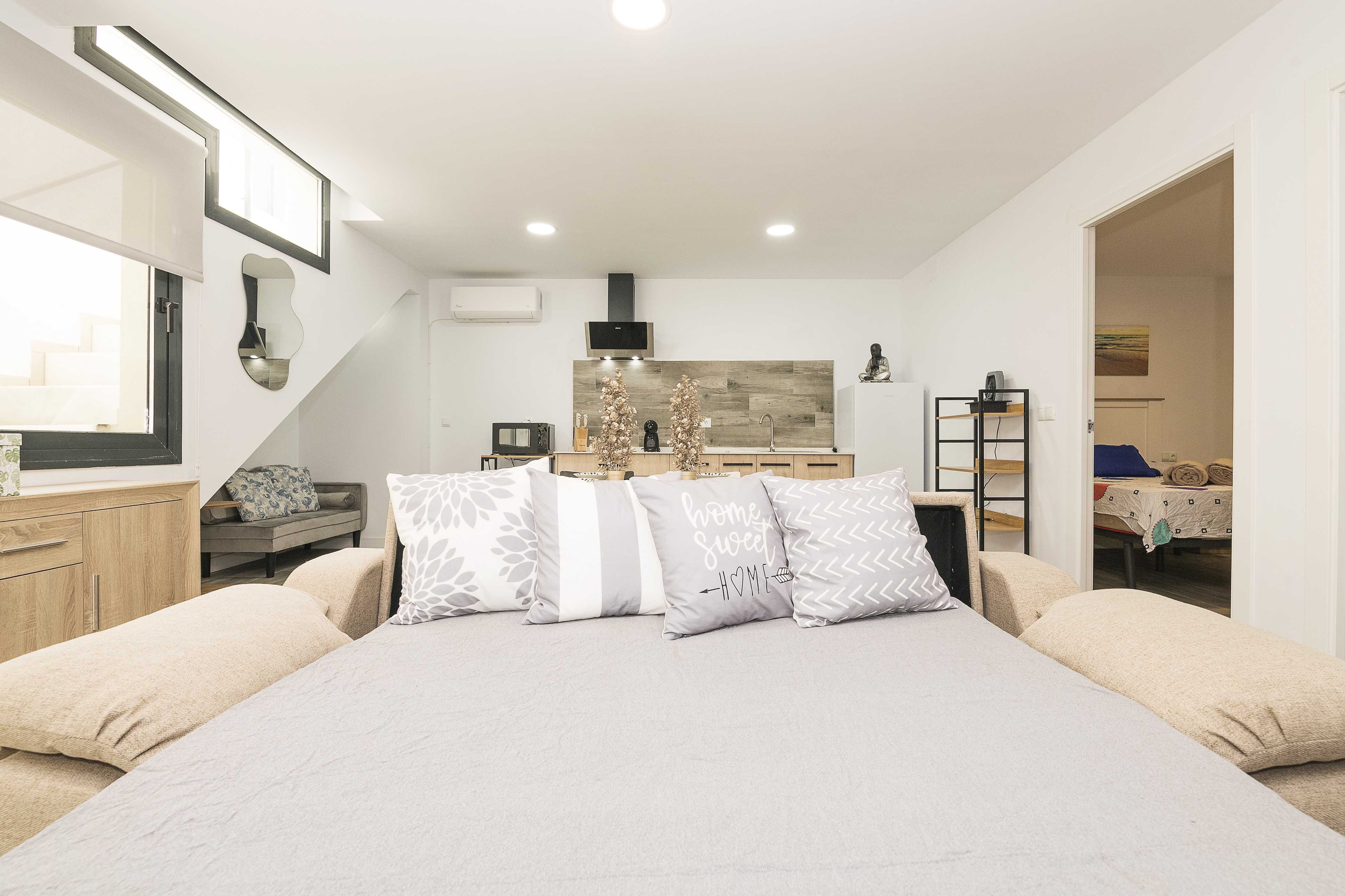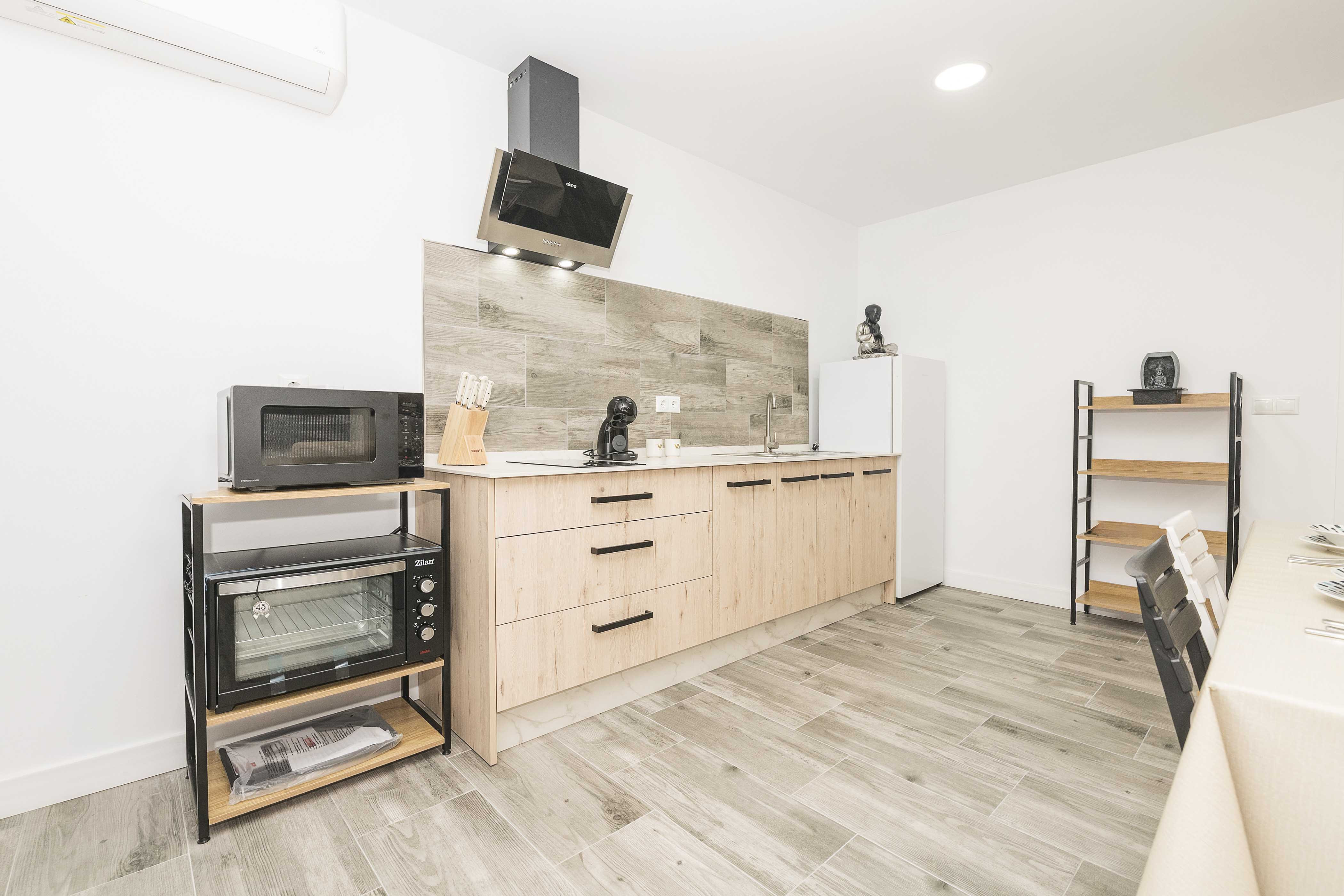 De keuken is volledig uitgerust met een keramische kookplaat en alle benodigde keukengerei – ideaal voor het bereiden van uw favoriete maaltijden. In de eetruimte vindt u een hoofdtafel, en in de woonkamer kunt u ontspannen op de tweepersoonsslaapbank met airconditioning, perfect na een dag aan het strand.