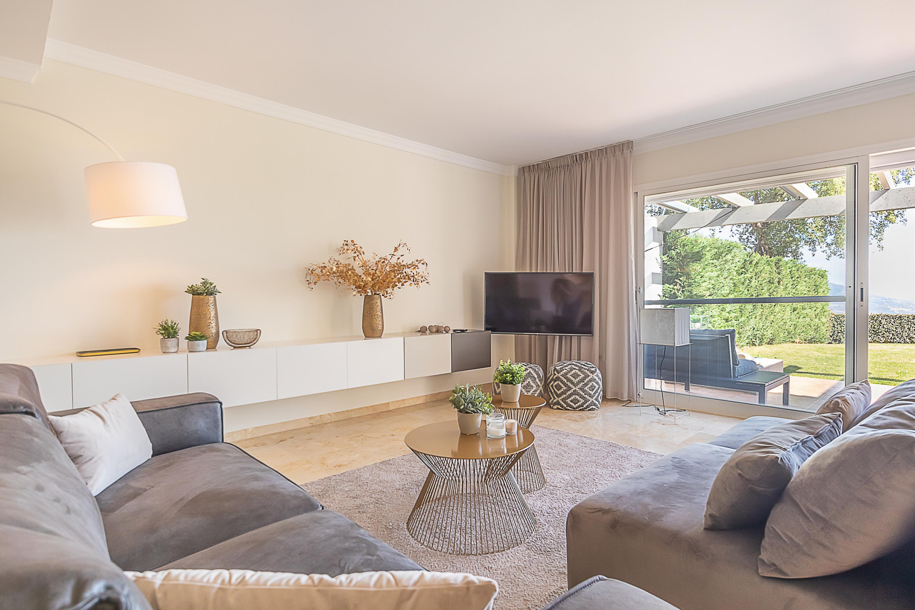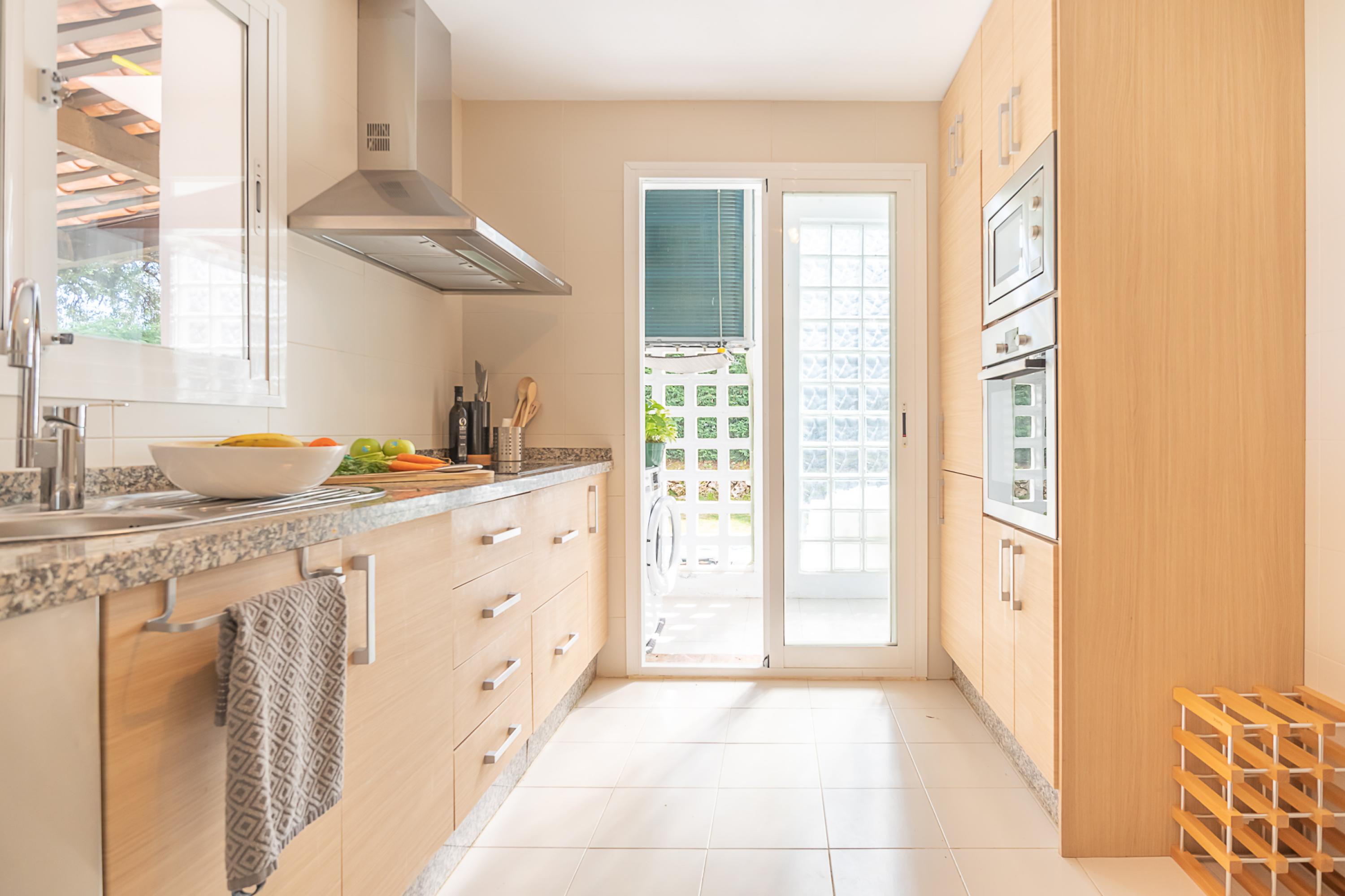 Het prachtige appartement op de begane grond heeft een grote tuin waar gasten toegang hebben tot een gedeeld zwembad, een grote tuin die vooral geliefd is bij kinderen. Er is een mooie ruimte met een comfortabele sofa om van het uitzicht te genieten en te ontspannen. Het terras is overdekt en het is een absoluut genot om hier buiten te dineren of gewoon te loungen op de grote sofa. De woonkamer heeft een premium opzet met een supermoderne inrichting. Er is een uitgebreide zithoek en een eetruimte. De keuken is apart en doordacht ingericht om de gasten maximaal comfort te bieden tijdens het koken. Het is uitgerust met een vaatwasser, een koffiezetapparaat, een magnetron, een inductiekookplaat, een broodrooster en een koelkast. Het loopt door naar het wasgedeelte.