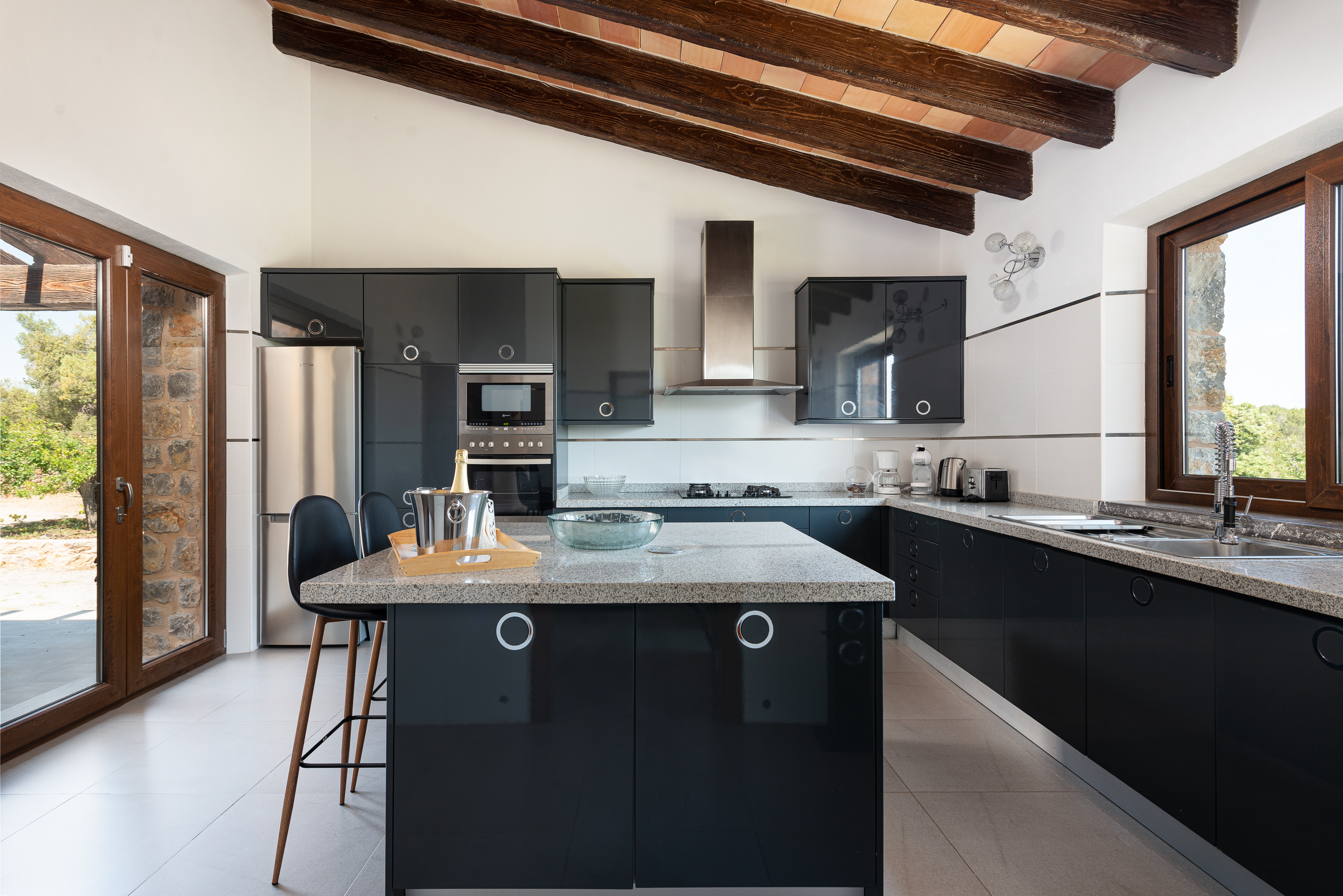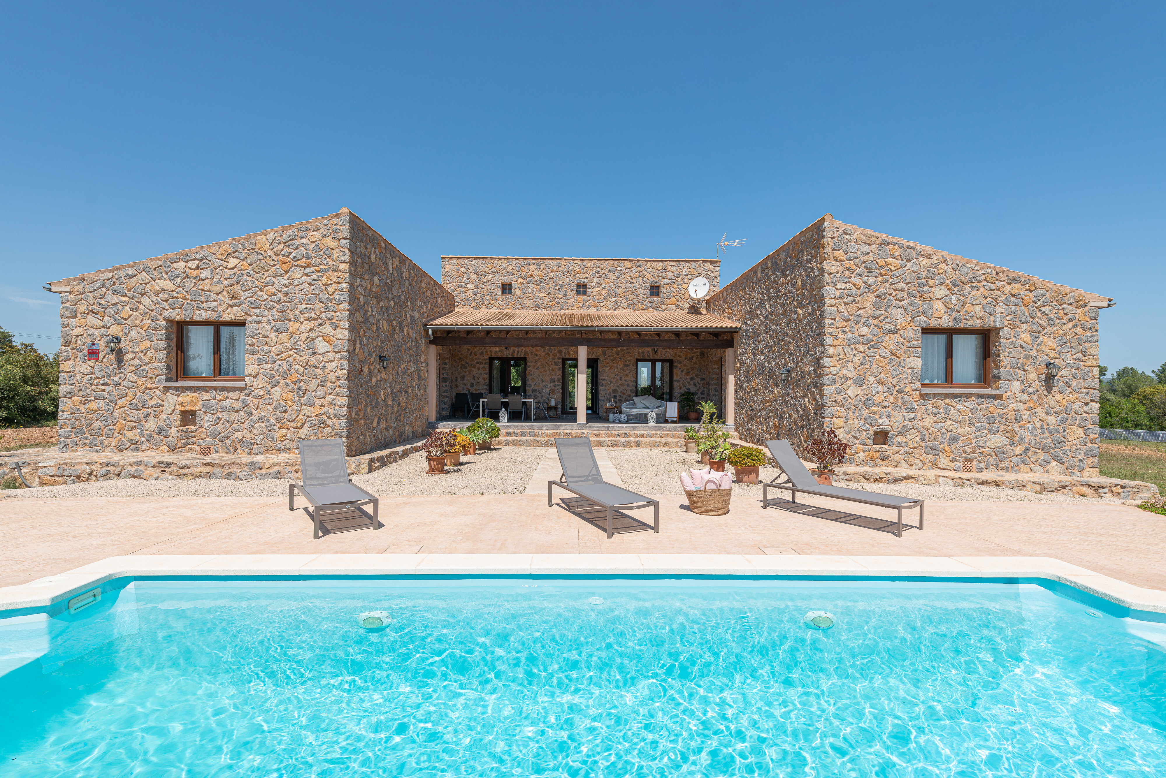 De idyllische sfeer van het platteland is de perfecte bondgenoot voor een onvergetelijk verblijf. U zult de rust, de adem en de geluiden van de natuur voelen aan het begin van de dag terwijl u geniet van een sappig ontbijt onder de veranda en herstelt voor de eindeloze dag bij het zwembad. Het prachtige chloorbad, met een afmeting van 10 x 4 meter en een waterdiepte van 1,5 tot 1,6 meter, biedt plaats aan een jacuzzi om u helemaal te laten ontspannen. Houd er rekening mee dat het water van de jacuzzi niet kan worden verwarmd. Maar wat als u alleen maar wilt afkoelen na het zonnebaden onder de Mallorcaanse zon op een van de 8 ligstoelen? Dan staat er een spectaculaire gasbarbecue voor u klaar om heerlijke maaltijden in de buitenlucht te koken. Het terrein is omheind en er zijn buren in de buurt.