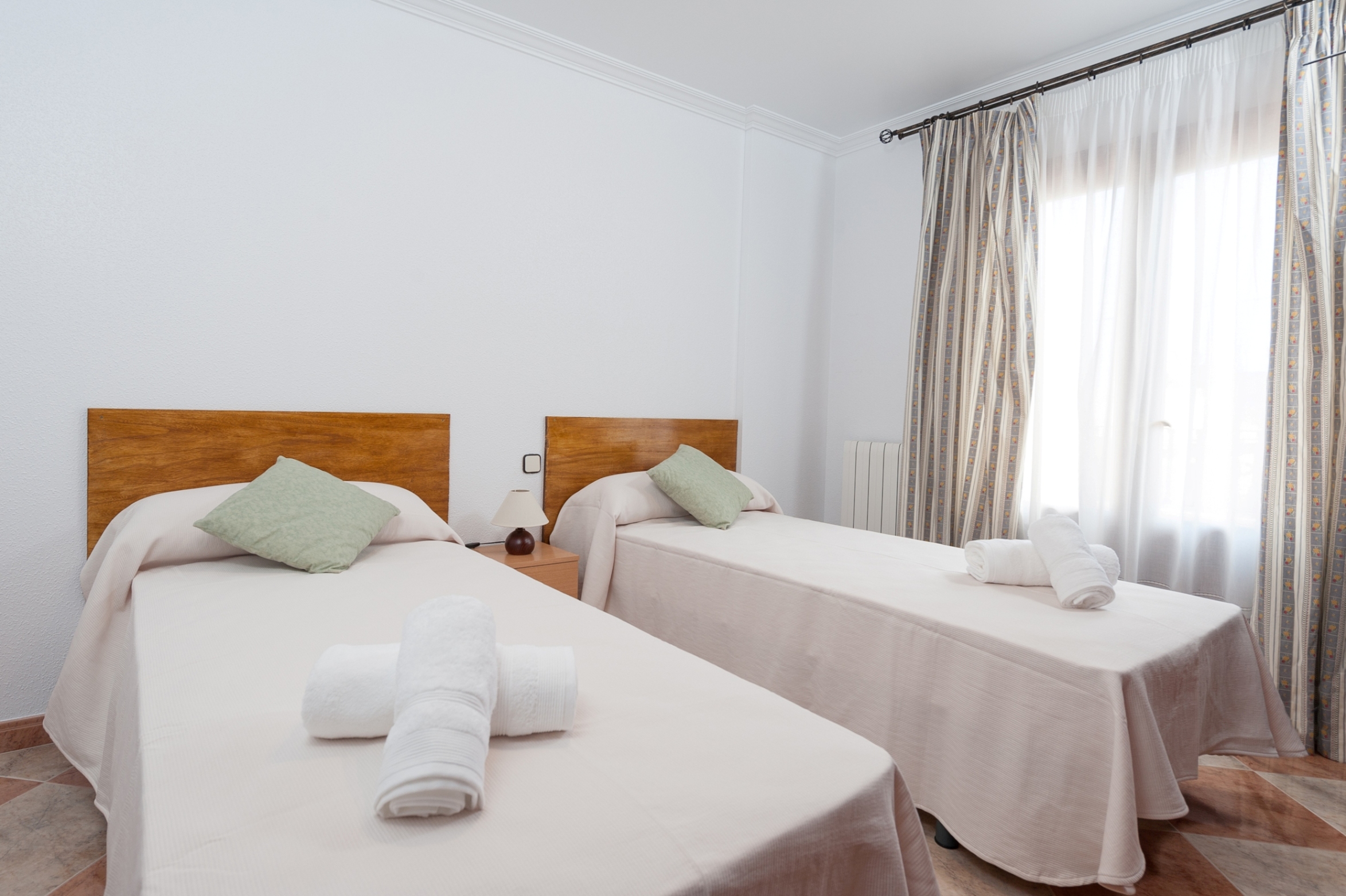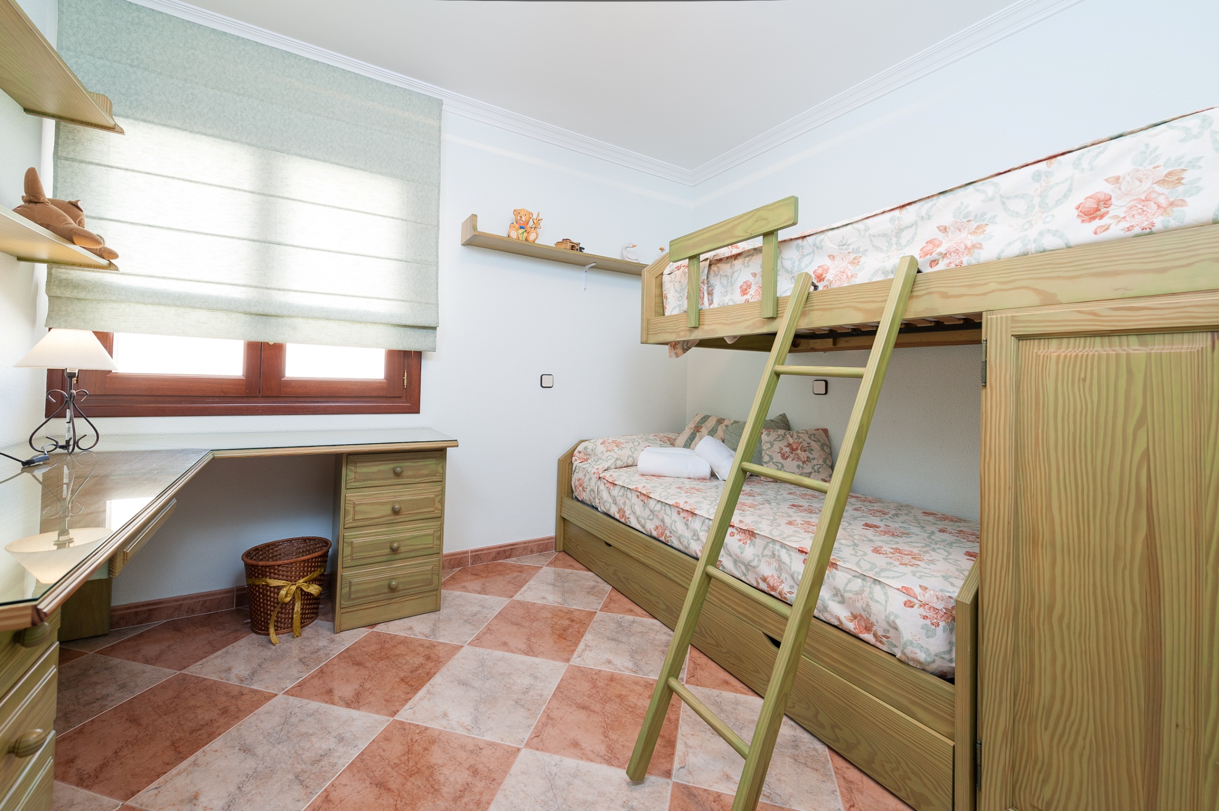 De accommodatie heeft twee ingangen; de eerste is de hoofdingang waardoor u toegang heeft tot de woonkamer, terwijl de tweede de achteringang is, waardoor u toegang heeft tot de keuken en het terras. De woon-eetkamer bevindt zich dan op de begane grond, voorzien van een open haard en satelliet-tv met zowel Spaanse als Duitse zenders. Verder zijn er een toilet en de keuken, deze laatste is volledig uitgerust met alles wat nodig is zodat u tijdens uw verblijf op uw gemak kunt koken: broodrooster, magnetron, vaatwasser, elektrisch koffiezetapparaat, elektrische oven, gaskookplaat, koelkast met vriezer, keukengerei en nog veel meer. Het huis biedt ook een wasmachine, strijkijzer en strijkplank. Op de eerste verdieping zijn er 3 slaapzalen en 2 badkamers, één is een en-suite badkamer met ligbad en de andere bevindt zich op de gang met douche, en er zijn terrassen aan beide zijden. Eén van de slaapkamers heeft een tweepersoonsbed, airconditioning en een eigen badkamer. De tweede heeft een stapelbed en de derde heeft twee eenpersoonsbedden.