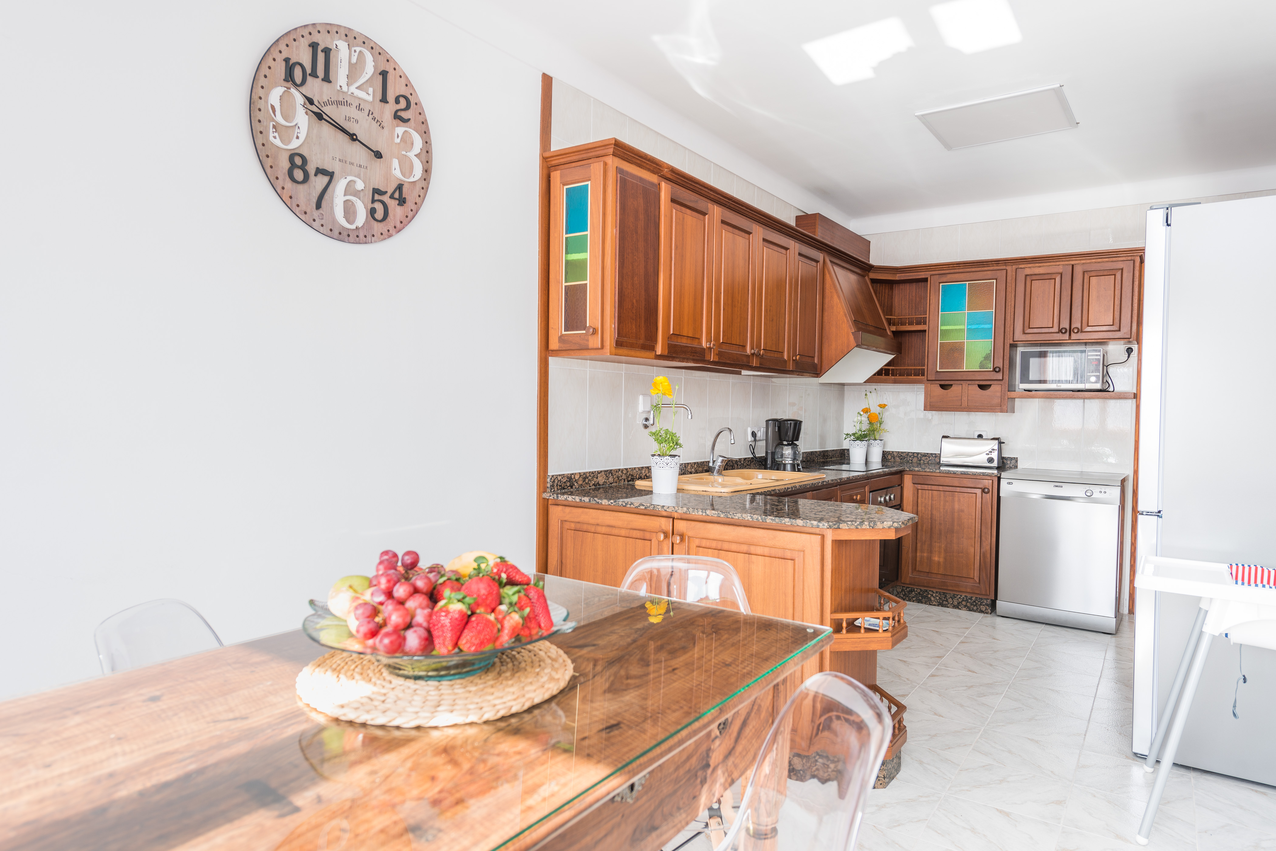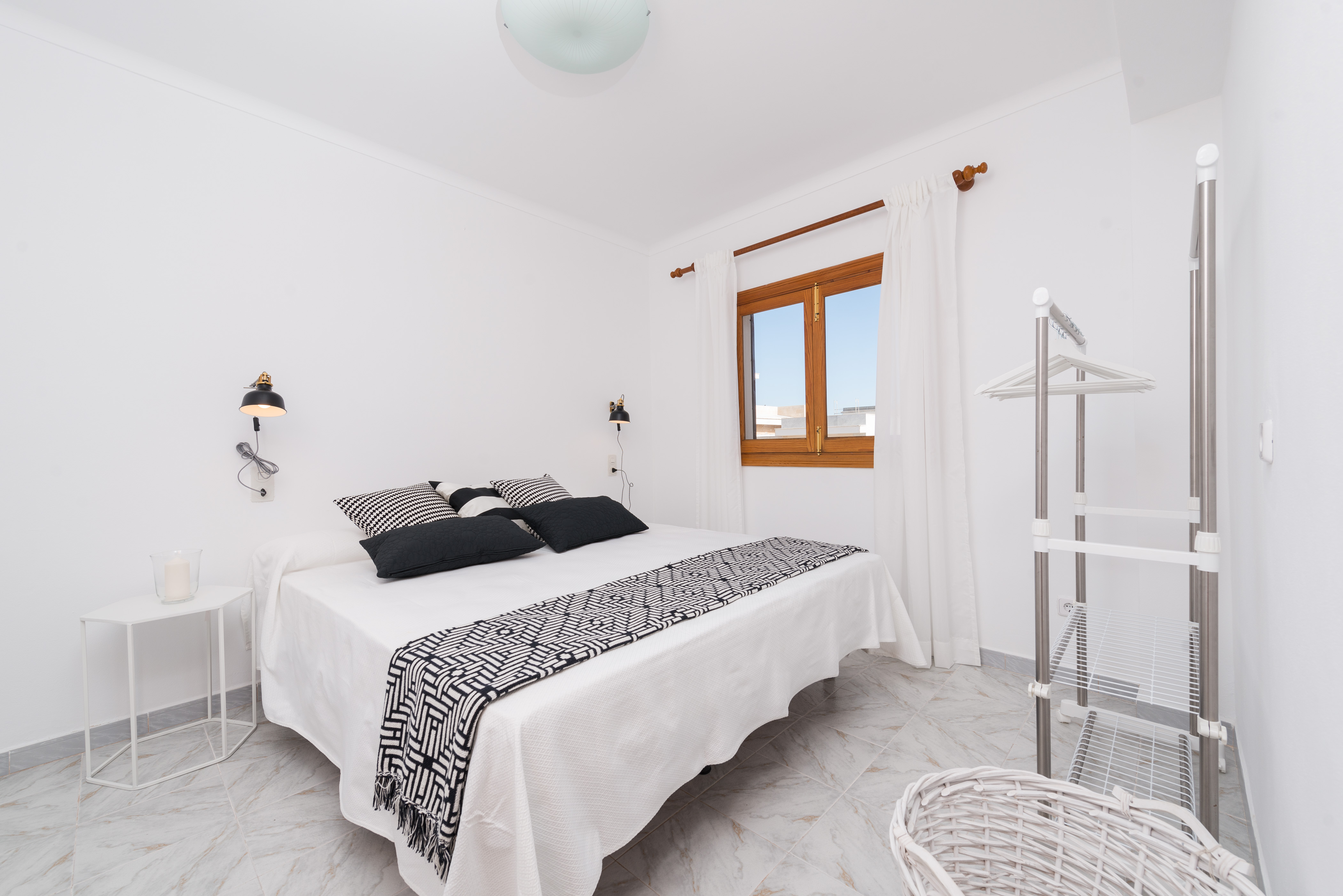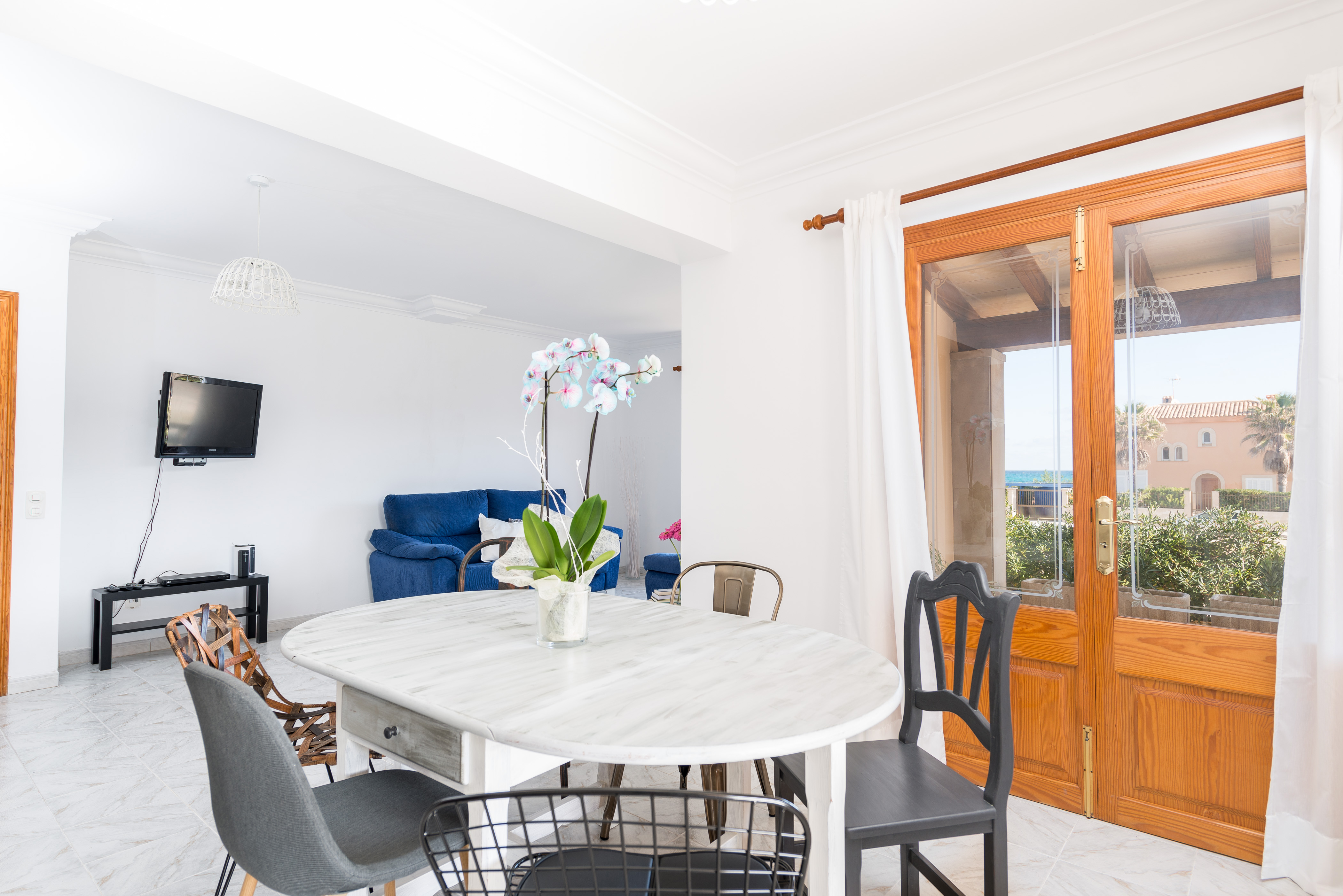 Het interieur is eenvoudig ingericht, licht en ruim. De woonkamer met eethoek heeft directe toegang tot het terras, waar je kunt genieten van maaltijden met je gezelschap terwijl je een film kijkt op satelliet-tv of naar muziek luistert. De keuken heeft een inductiekookplaat en is volledig uitgerust met alle benodigde keukengerei om je favoriete gerechten te bereiden. Er is een wasmachine, strijkijzer en strijkplank. Op dezelfde verdieping is een slaapkamer met tweepersoonsbed en een badkamer met bad. Op de bovenverdieping zijn nog drie slaapkamers: twee met tweepersoonsbedden en één met twee eenpersoonsbedden. Een badkamer met bad maakt deze verdieping compleet. Let op: twee van de slaapkamers hebben geen kledingkast, maar een kledingrek, en als je met je baby reist, kunnen we een wieg en een kinderstoel voorzien. Het huis heeft ook twee ventilatoren die je kunt plaatsen waar je wilt.