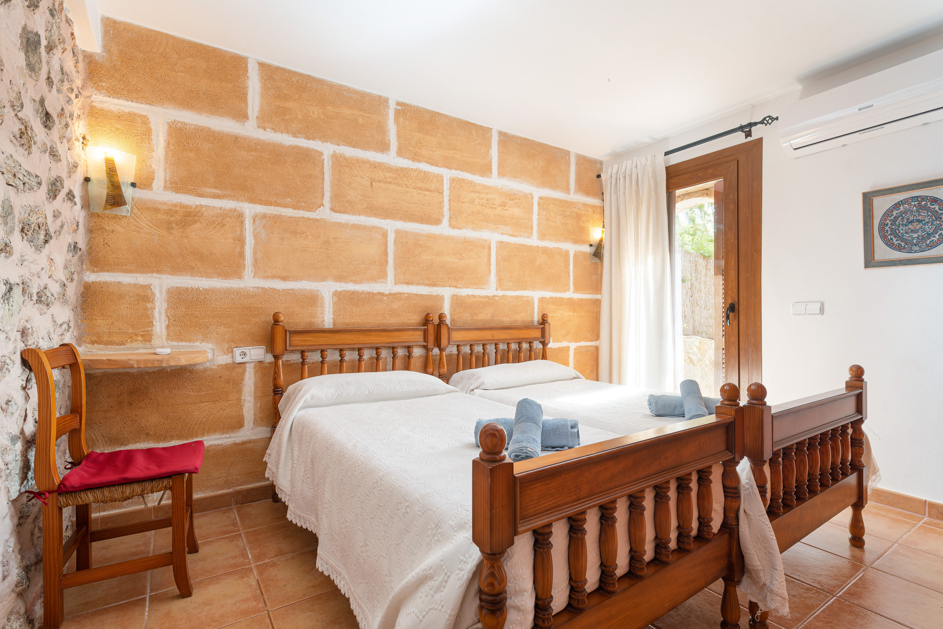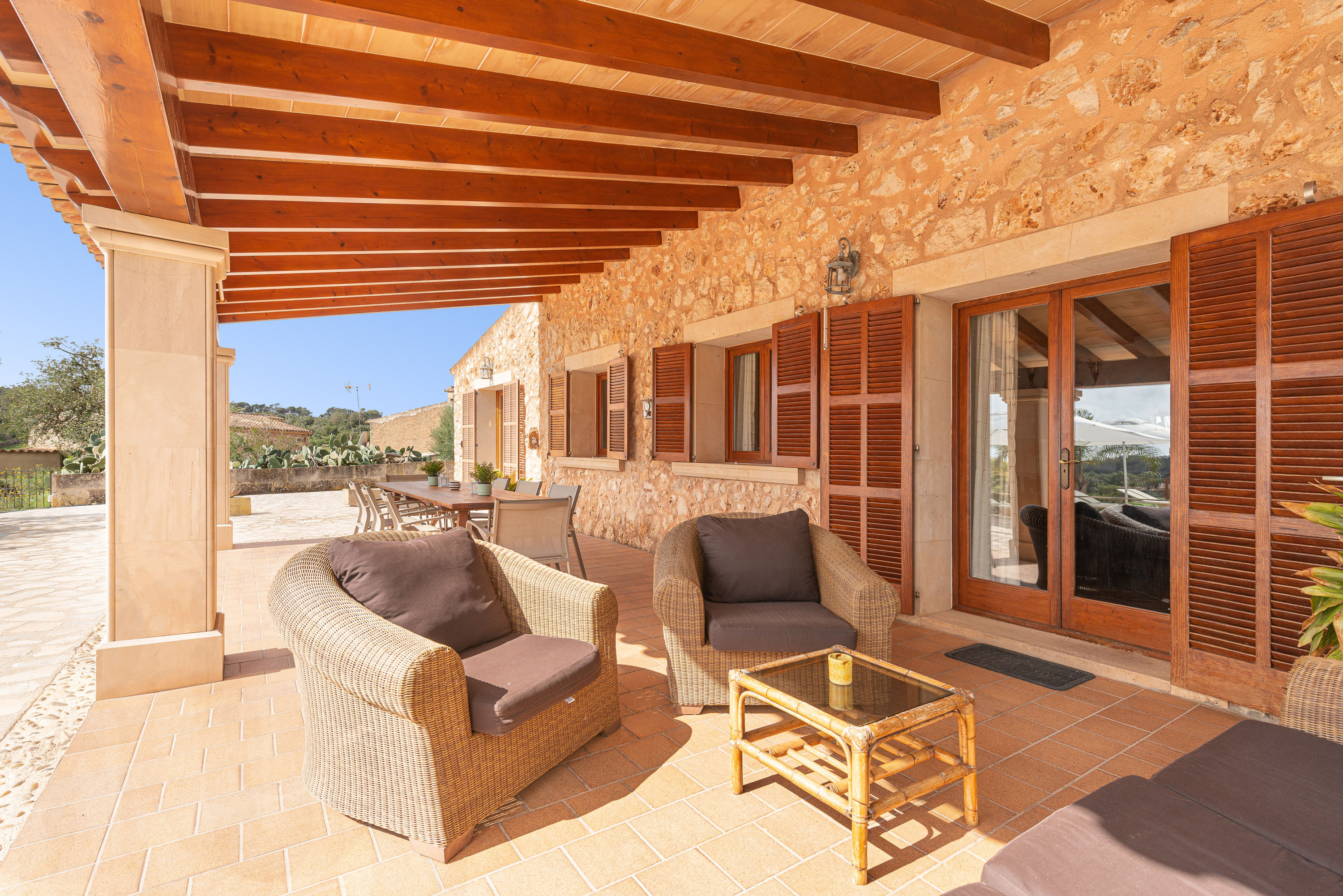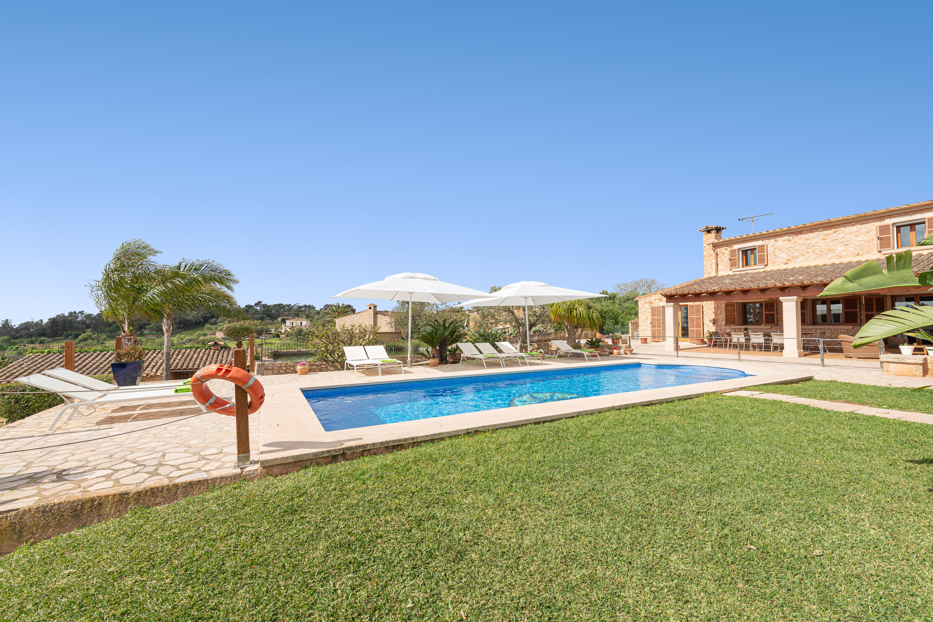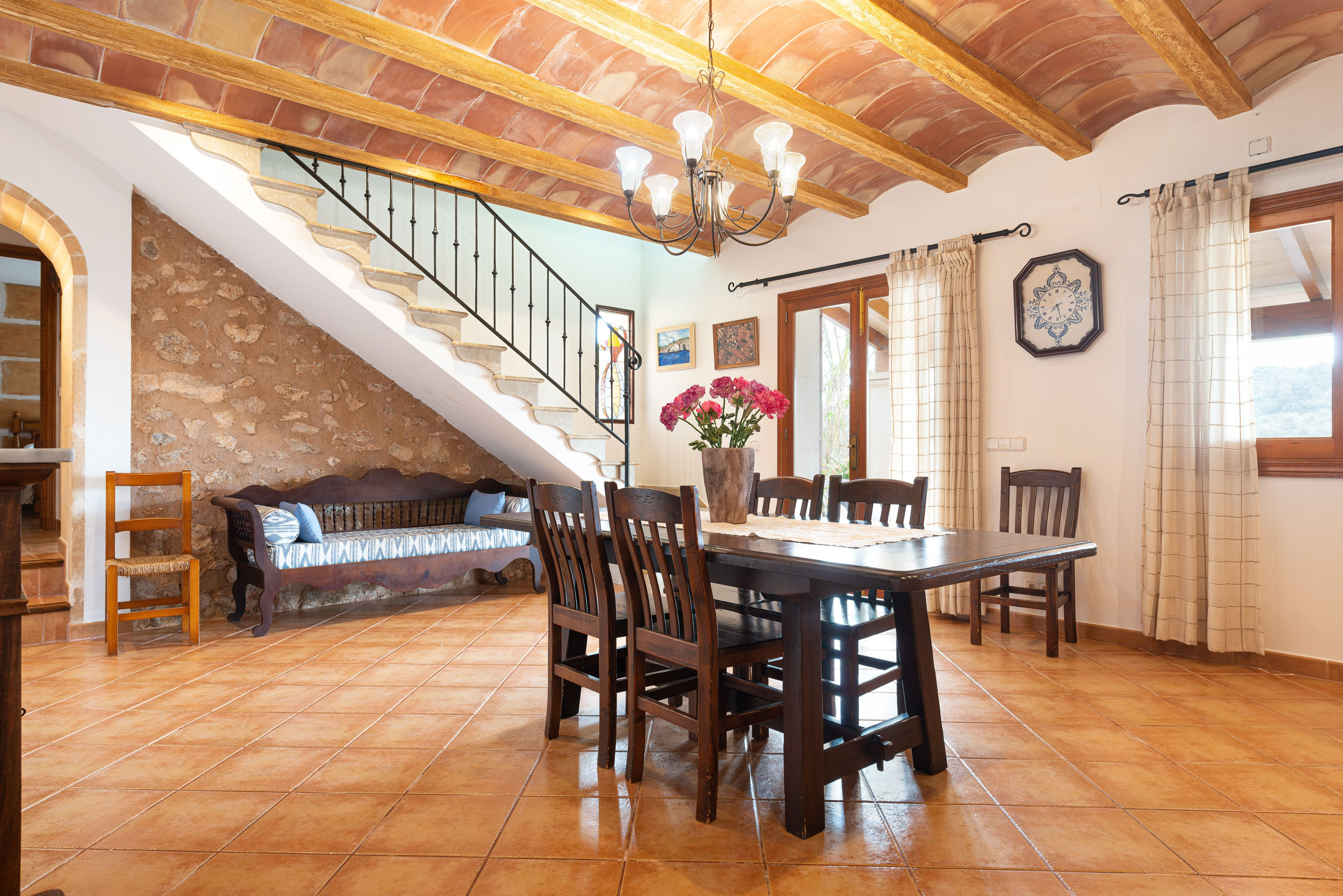 Gelegen op slechts een paar minuten van de kust van Cala d’Or, biedt deze charmante villa voor 8 personen een rustige vakantie op het platteland zonder de zee op te geven. Het ongelooflijke exterieur van het huis heeft een groot chloorzwembad van 9×4 meter en een diepte tot 2 meter, omgeven door gazon, ligstoelen en parasols waar u kunt ontspannen in de zon. Bovendien heeft de villa een veranda met tafels en stoelen, ideaal voor maaltijden in de buitenlucht, en een terras met verschillende charmante hoekjes waar u kunt genieten van een drankje bij zonsondergang of een ontspannen avond bij de vaste barbecue.