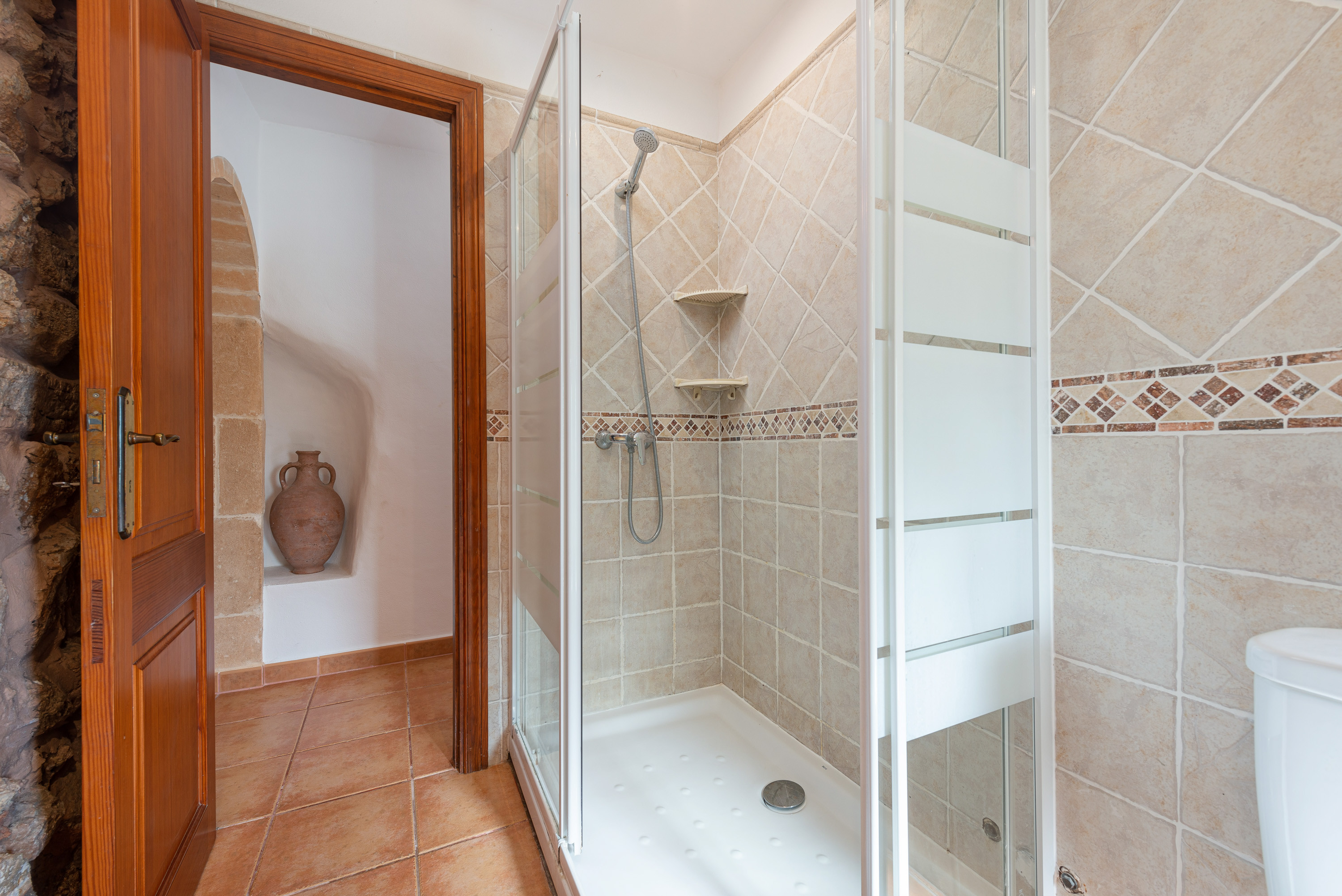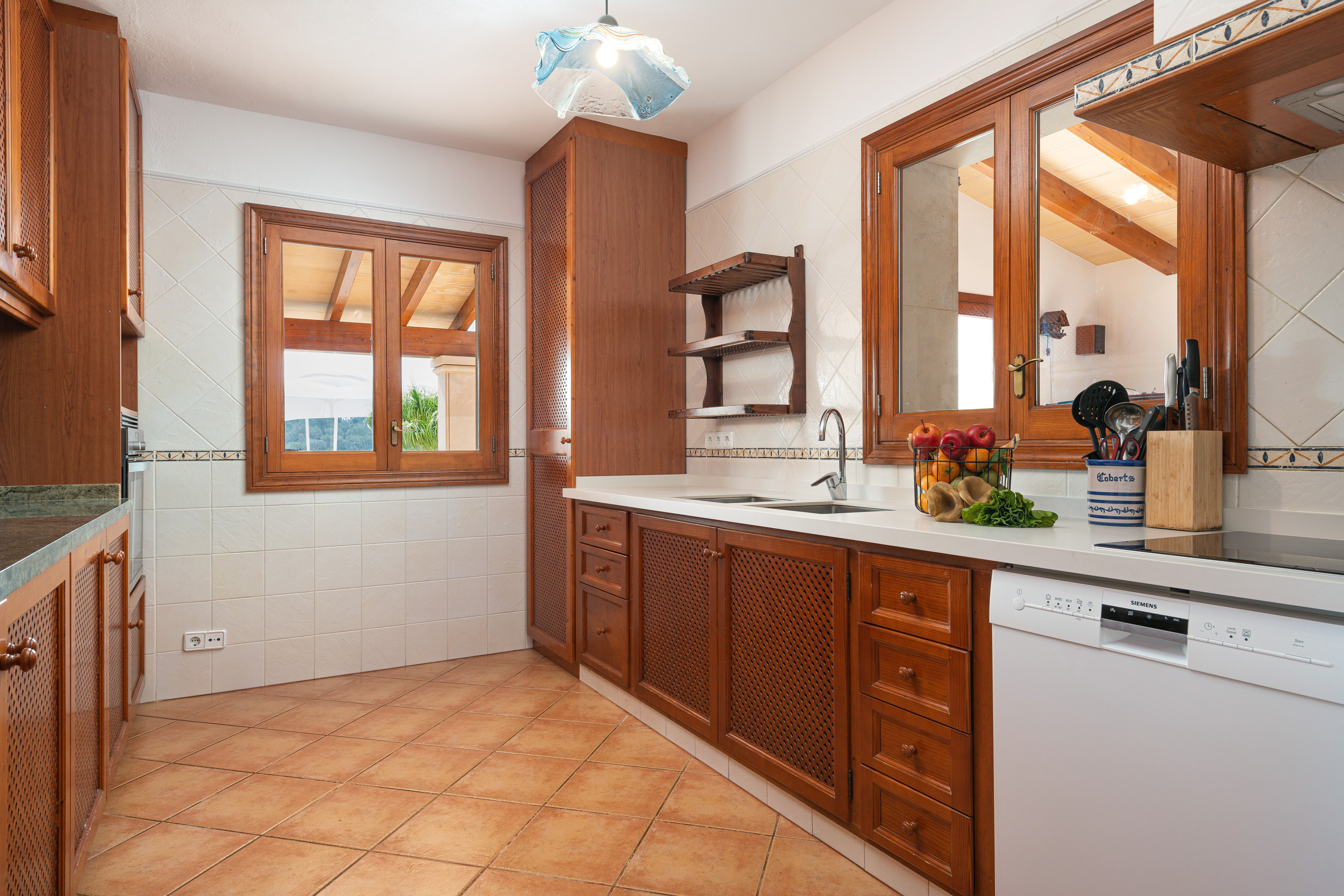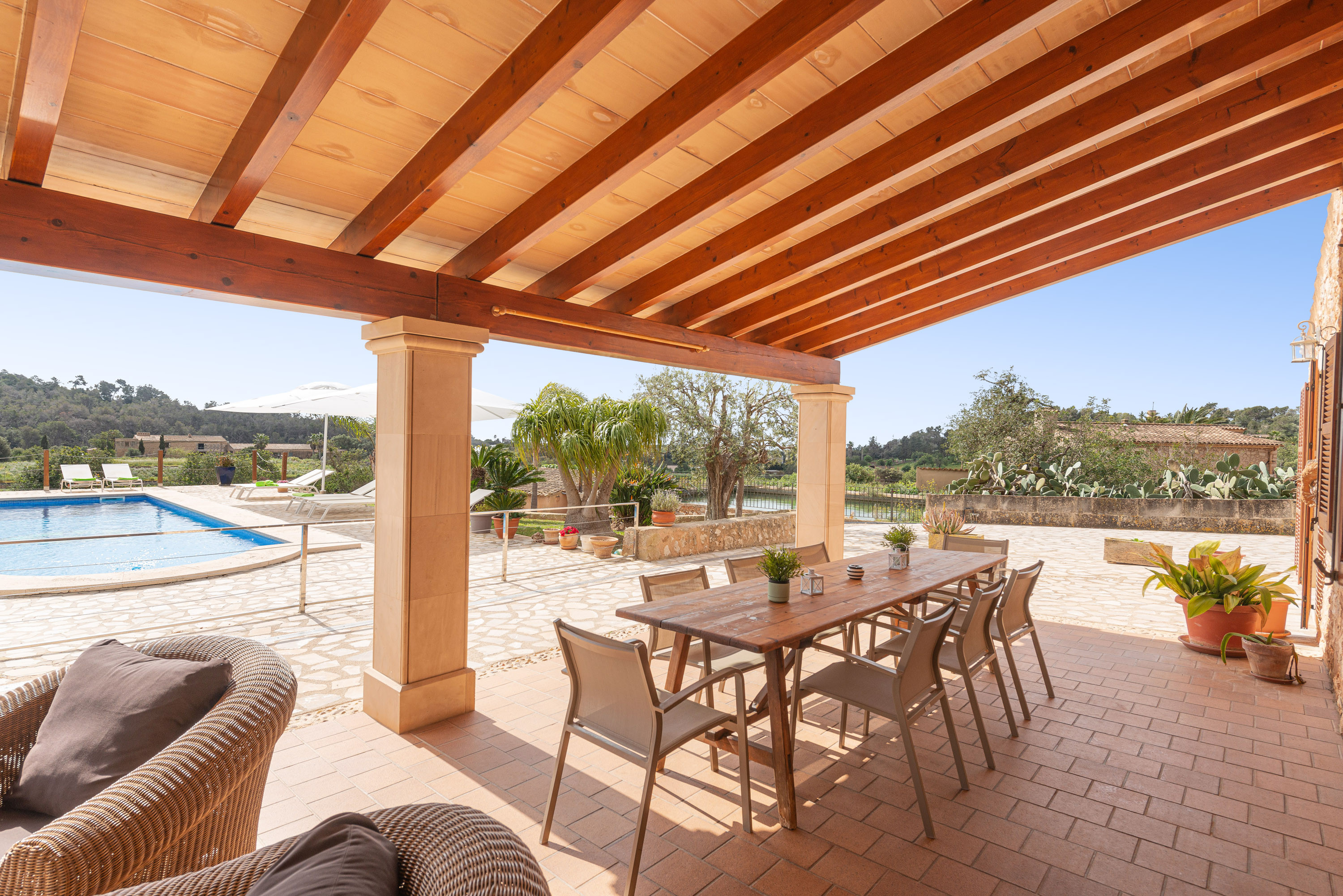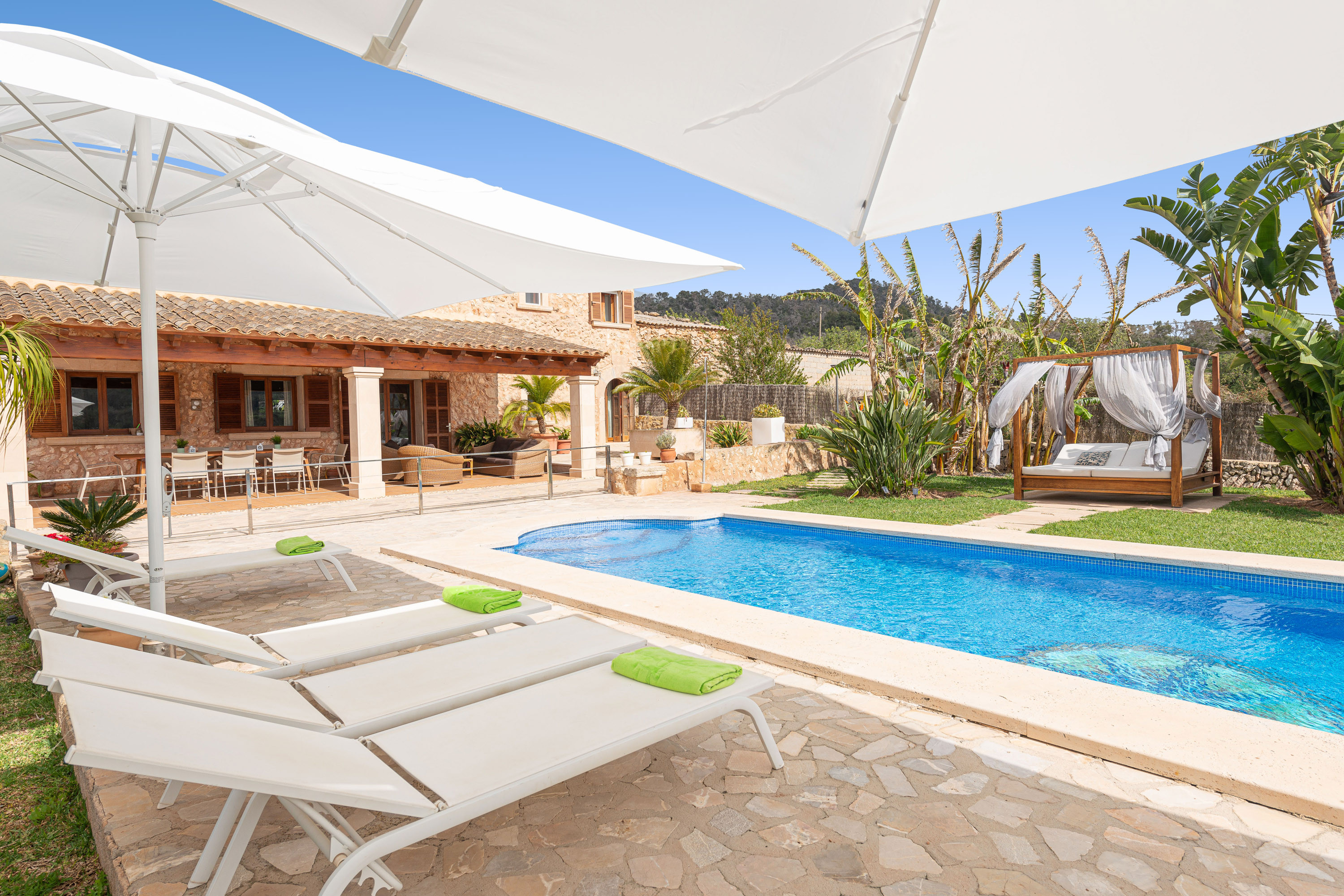 Gelegen op slechts een paar minuten van de kust van Cala d’Or, biedt deze charmante villa voor 8 personen een rustige vakantie op het platteland zonder de zee op te geven. Het ongelooflijke exterieur van het huis heeft een groot chloorzwembad van 9×4 meter en een diepte tot 2 meter, omgeven door gazon, ligstoelen en parasols waar u kunt ontspannen in de zon. Bovendien heeft de villa een veranda met tafels en stoelen, ideaal voor maaltijden in de buitenlucht, en een terras met verschillende charmante hoekjes waar u kunt genieten van een drankje bij zonsondergang of een ontspannen avond bij de vaste barbecue.