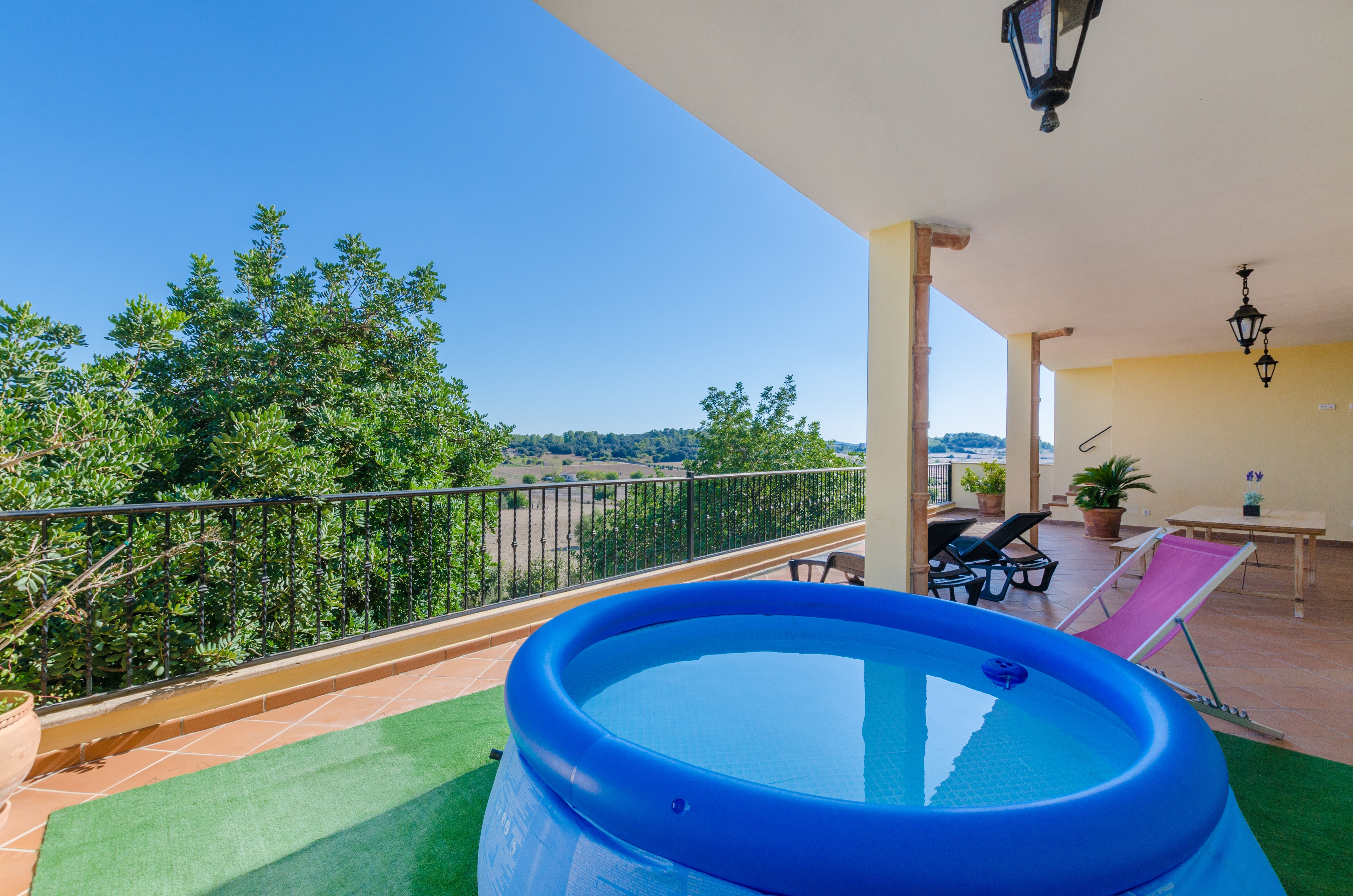 Het grote terras met panoramisch uitzicht over de velden is ideaal om een familieavond door te brengen, te zonnebaden op een van de strandstoelen of te verfrissen in het opblaasbaar chloorzwembad van 0,5 meter diepte en goede avonden te vieren. Misschien heb je zin in een heerlijke barbecue? Het huis valt op door zijn natuurstenen gevel en heeft een authentieke Mallorcaanse stijl behouden. Omdat het in de villa is geplaatst, heeft het directe buren.