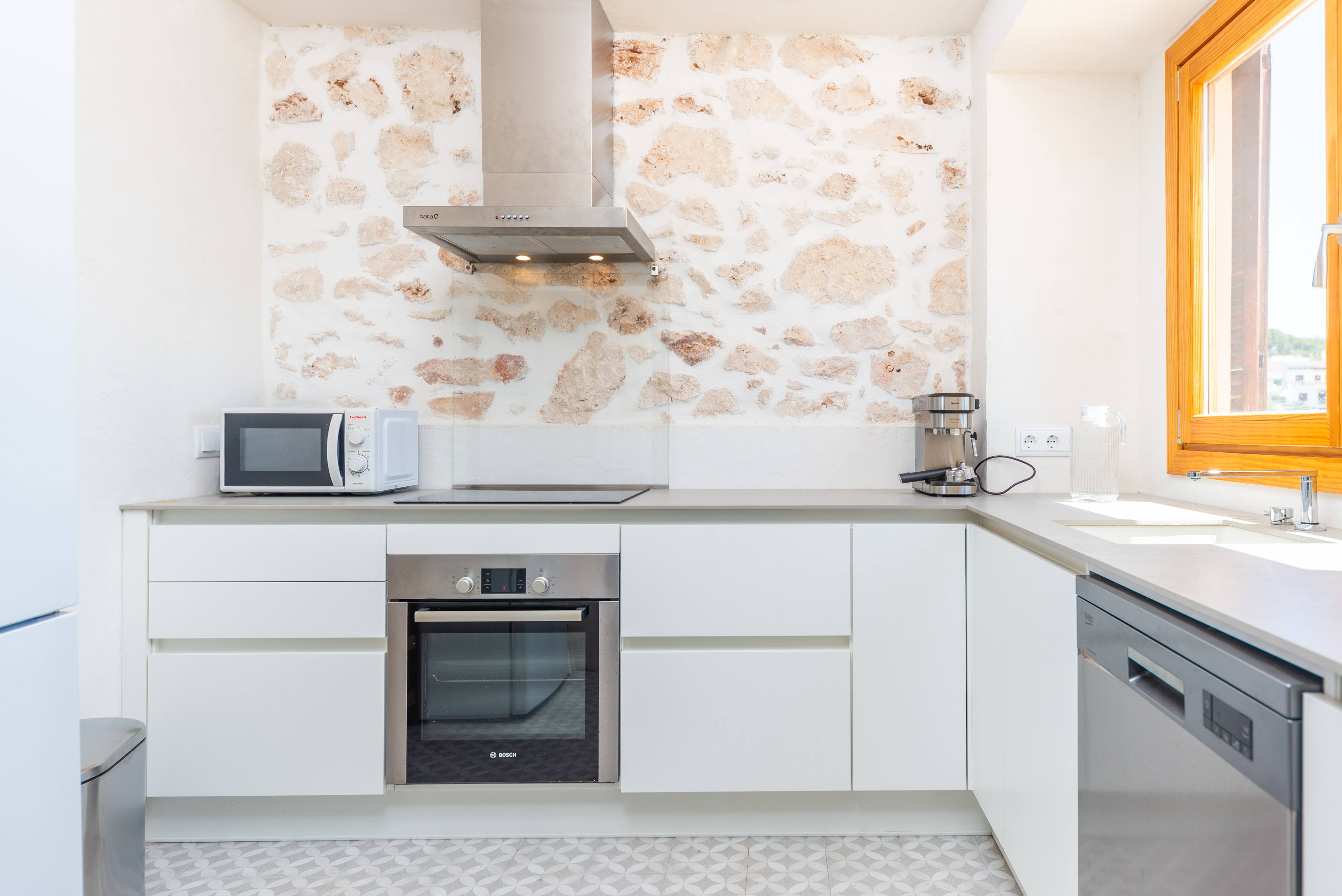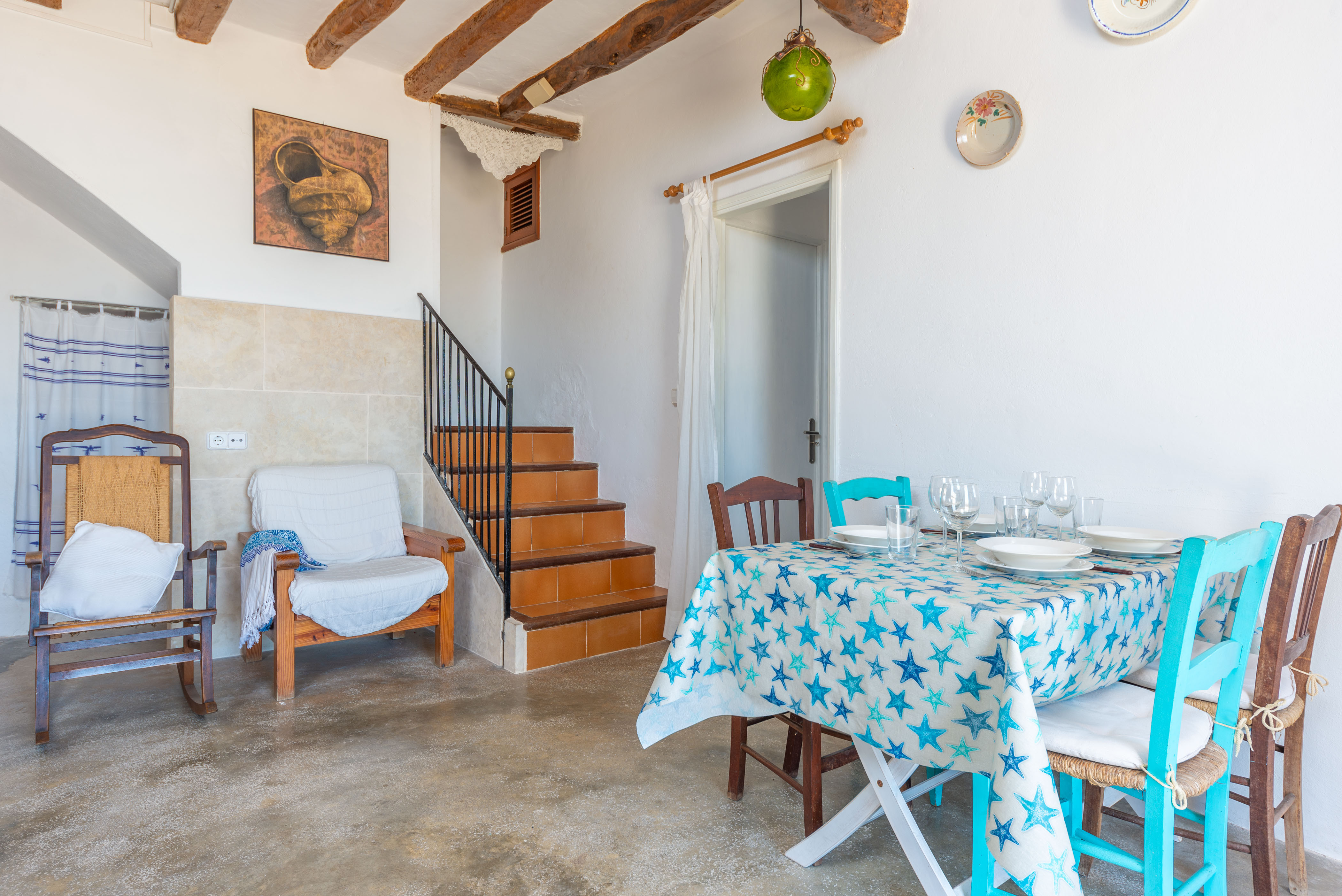 Via de trap bereikt u de tweede woonkamer van het huis, met een perfect uitzicht op zee dankzij het balkon. Deze kamer beschikt over een smart-tv om van een avondje films te genieten en airconditioning om de warme Mallorcaanse avonden extra verfrissend te maken. Op dezelfde verdieping bevinden zich de twee slaapkamers van het huis, elk met een tweepersoonsbed en een ventilator. Eén van de slaapkamers heeft een tv. Op deze verdieping bevindt zich een tweede badkamer zonder douche. Tot slot, als u met een baby reist, zijn er een kinderbedje en -stoel aanwezig. Het huis beschikt over een wasmachine, strijkijzer en strijkplank die u tijdens uw verblijf kunt gebruiken.
