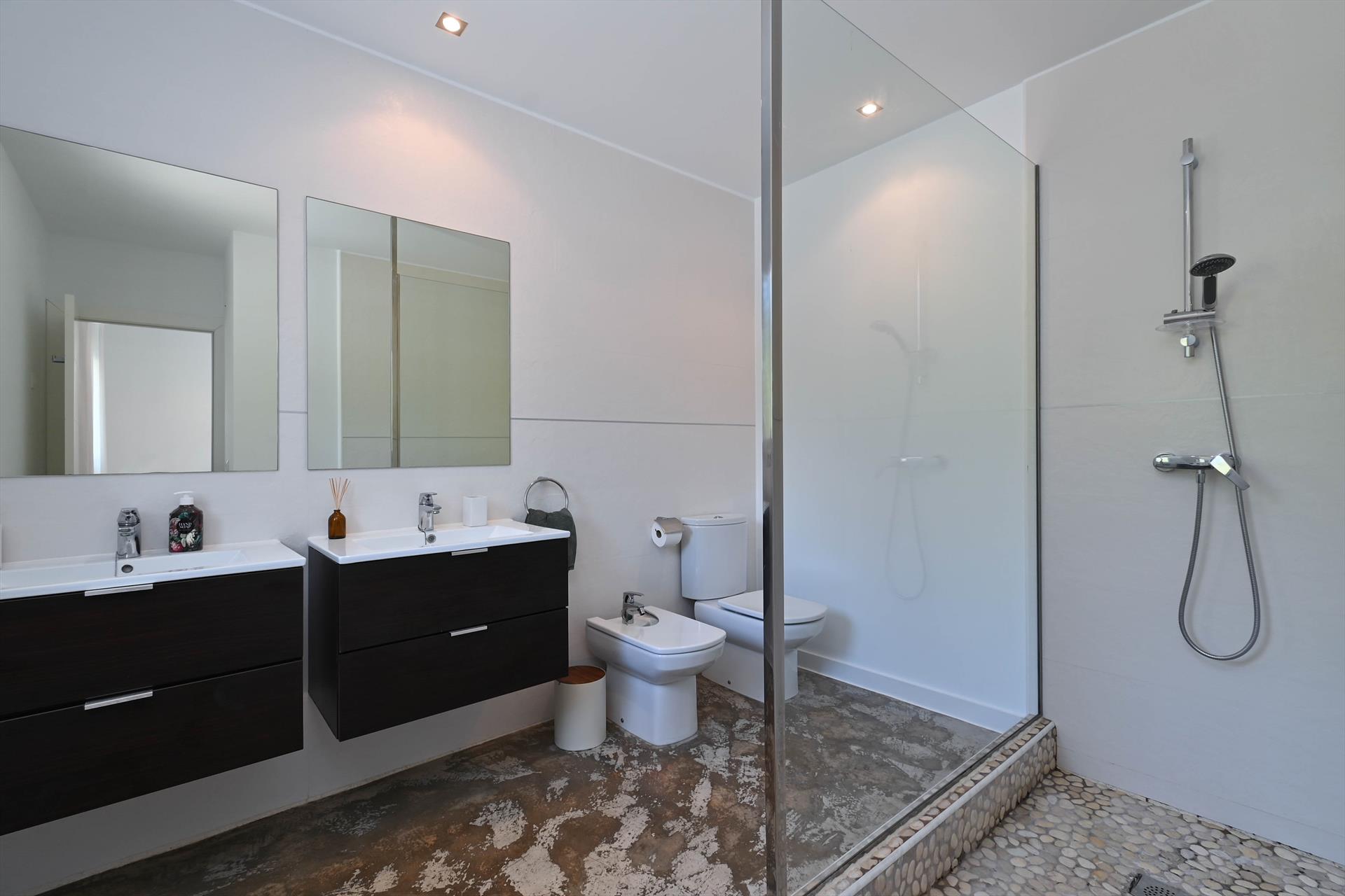 • en-suite badkamer met dubbele wastafel, douche en toilet