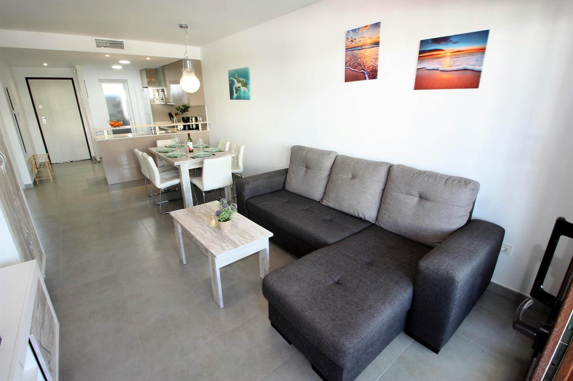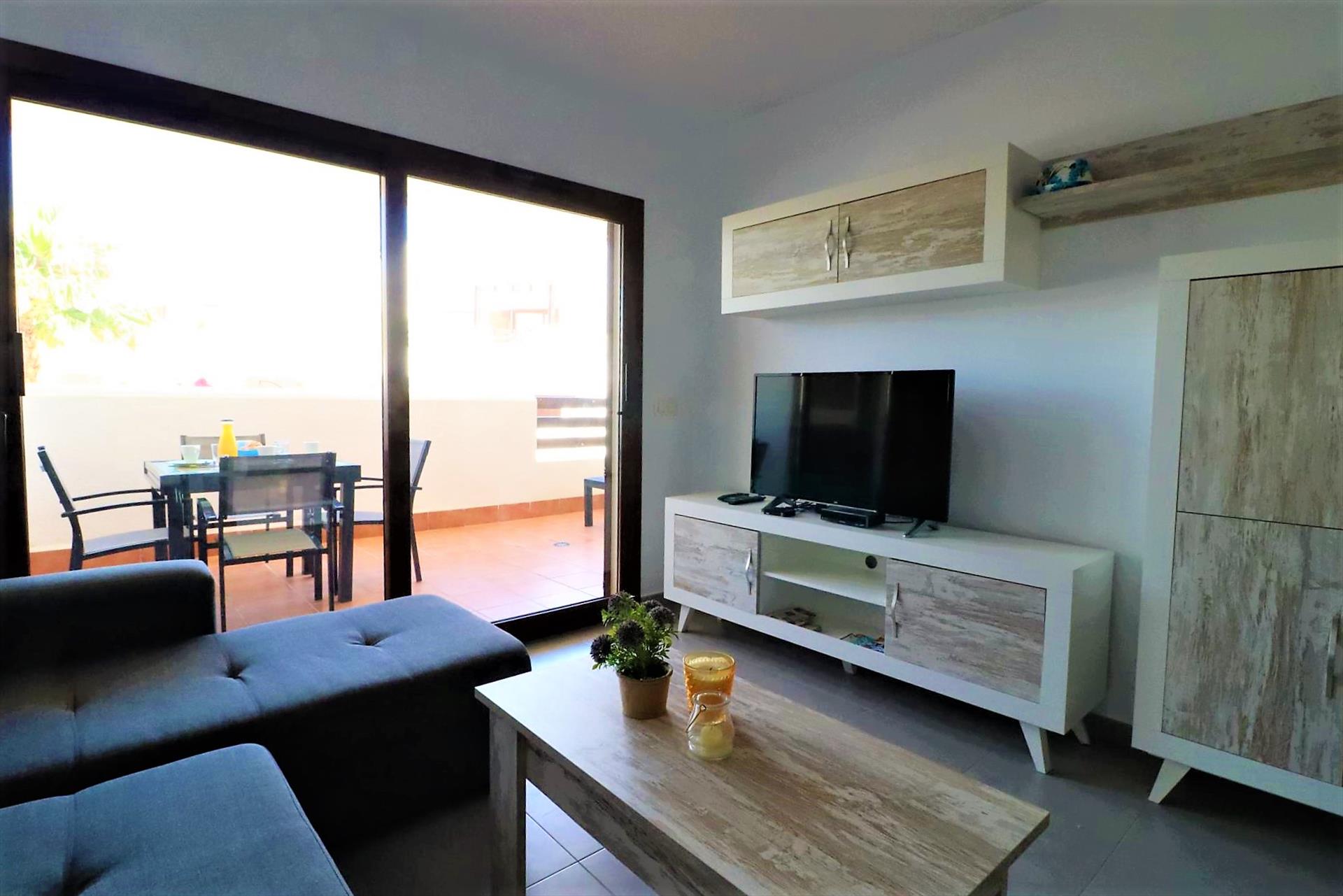- woon/eetkamer met airconditioning, televisie en slaapbank