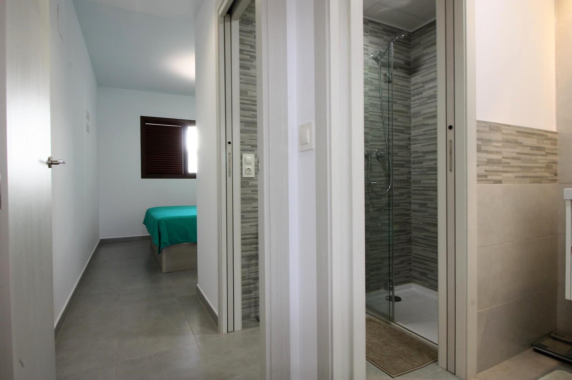 - slaapkamer met airconditioning, queensize bed (met een afmeting van 200 bij 160cm) en en-suite badkamer
