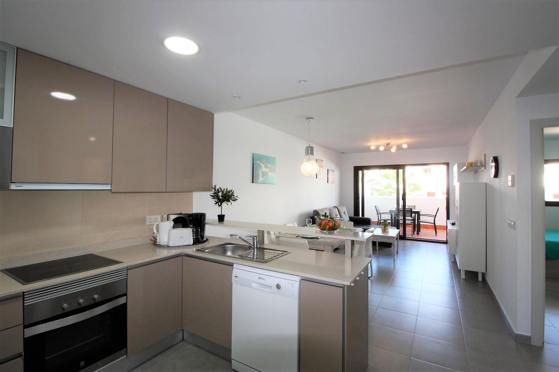 - open keuken met elektrische kookplaat, elektrische oven, magnetron, vaatwasser, koelkast-vriescombinatie, koffiezetapparaat, mixer, broodrooster en sapcentrifuge