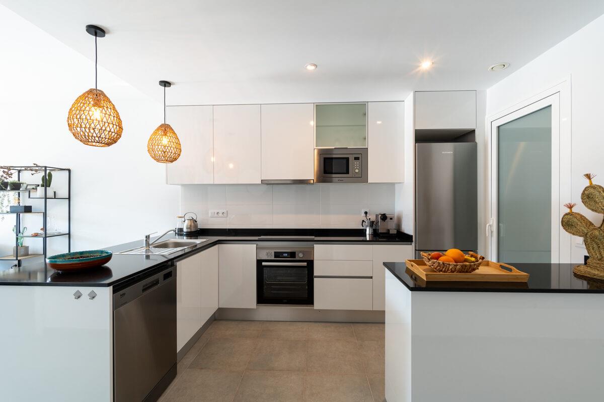 Open keuken met inductiekookplaat, elektrische oven, magnetron, vaatwasser, koelkast-vriescombinatie, koffiemachine, waterkoker, mixer, broodrooster en sapcentrifuge