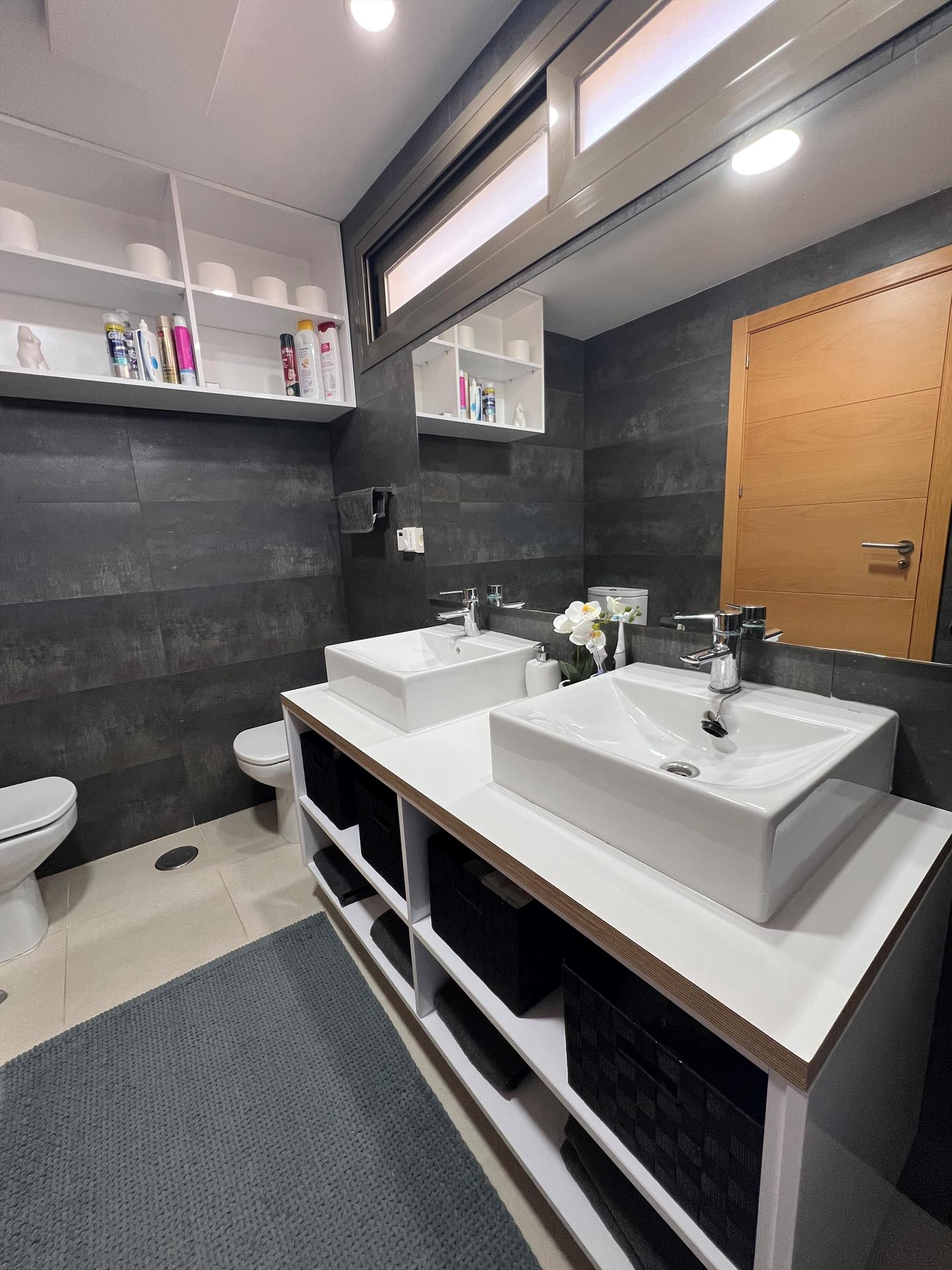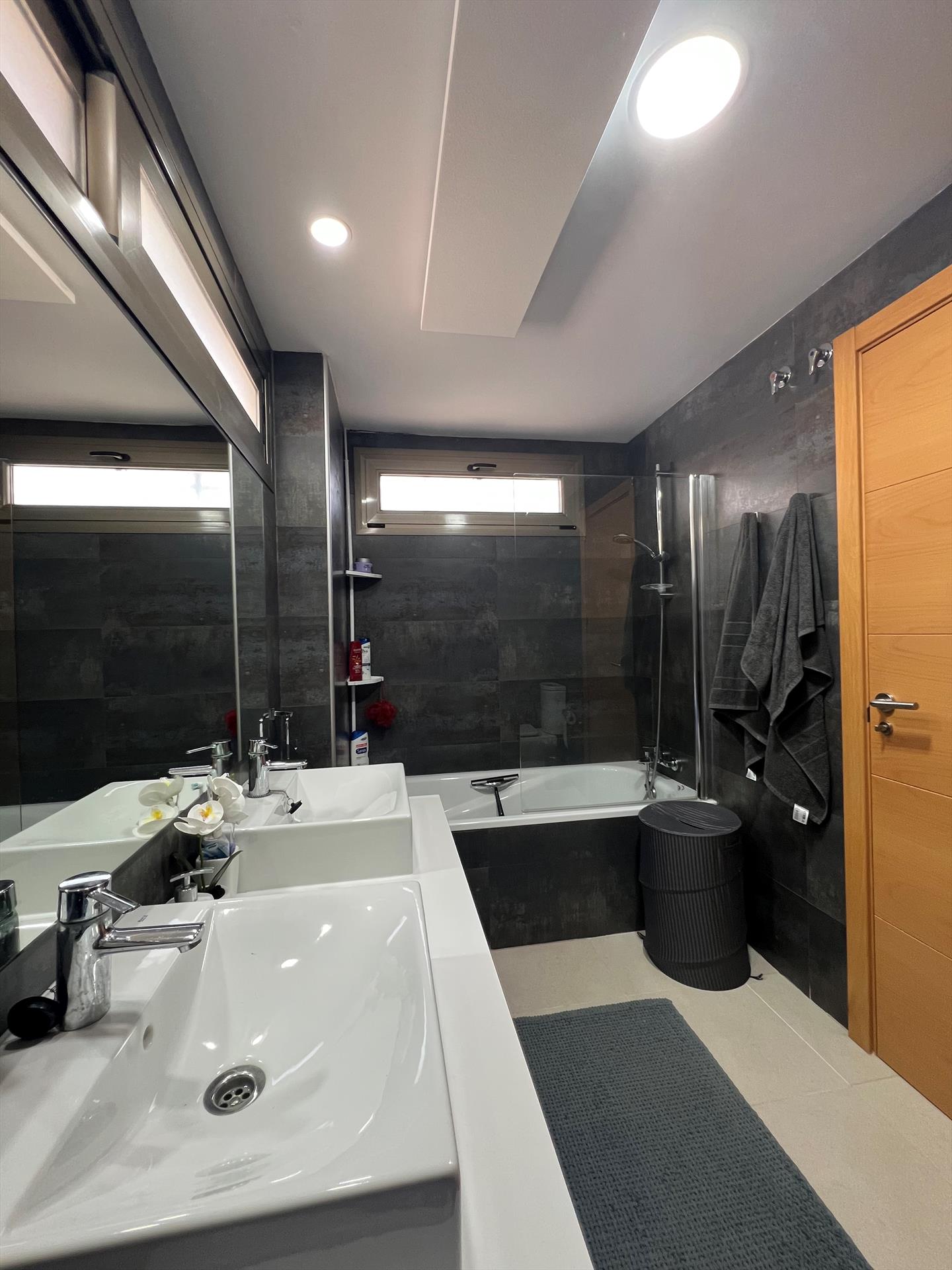 Badkamer met dubbele wastafel, bad, douche, bidet, toilet en föhn