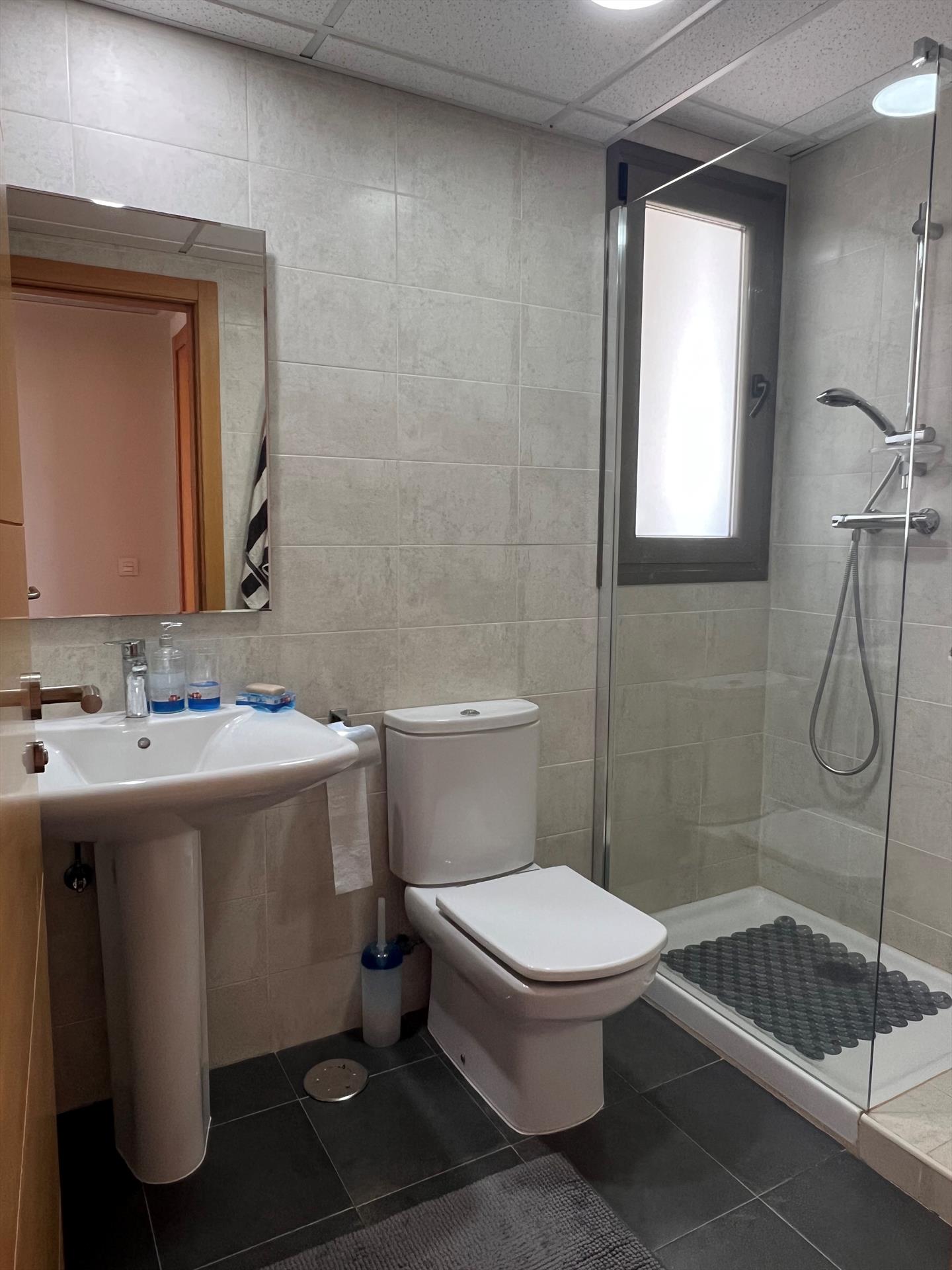 Badkamer met enkele wastafel, douche, toilet en föhn