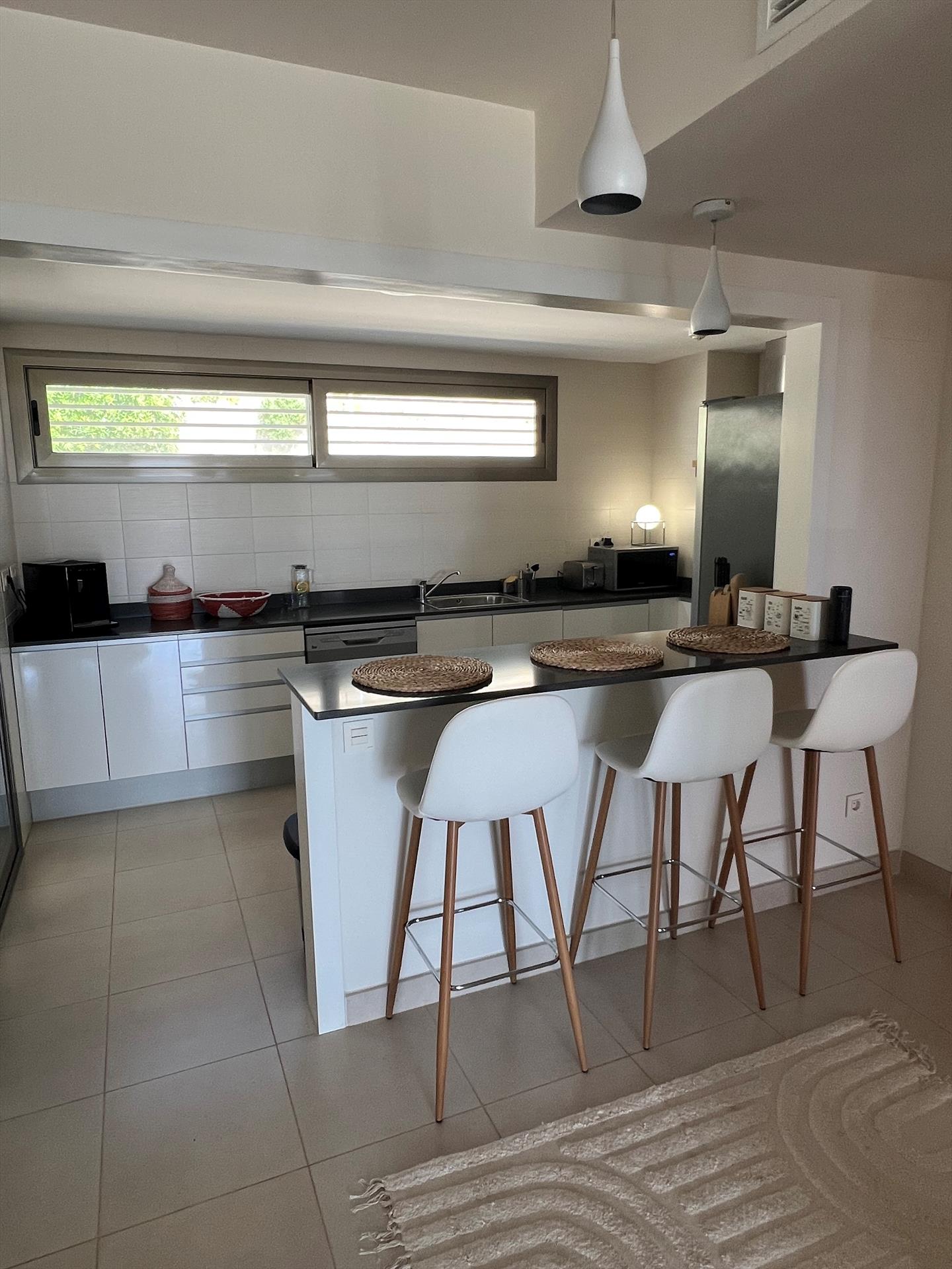 Keuken met elektrische kookplaat, elektrische oven, vaatwasser, koelkast, koffiezetapparaat, waterkoker en sapcentrifuge