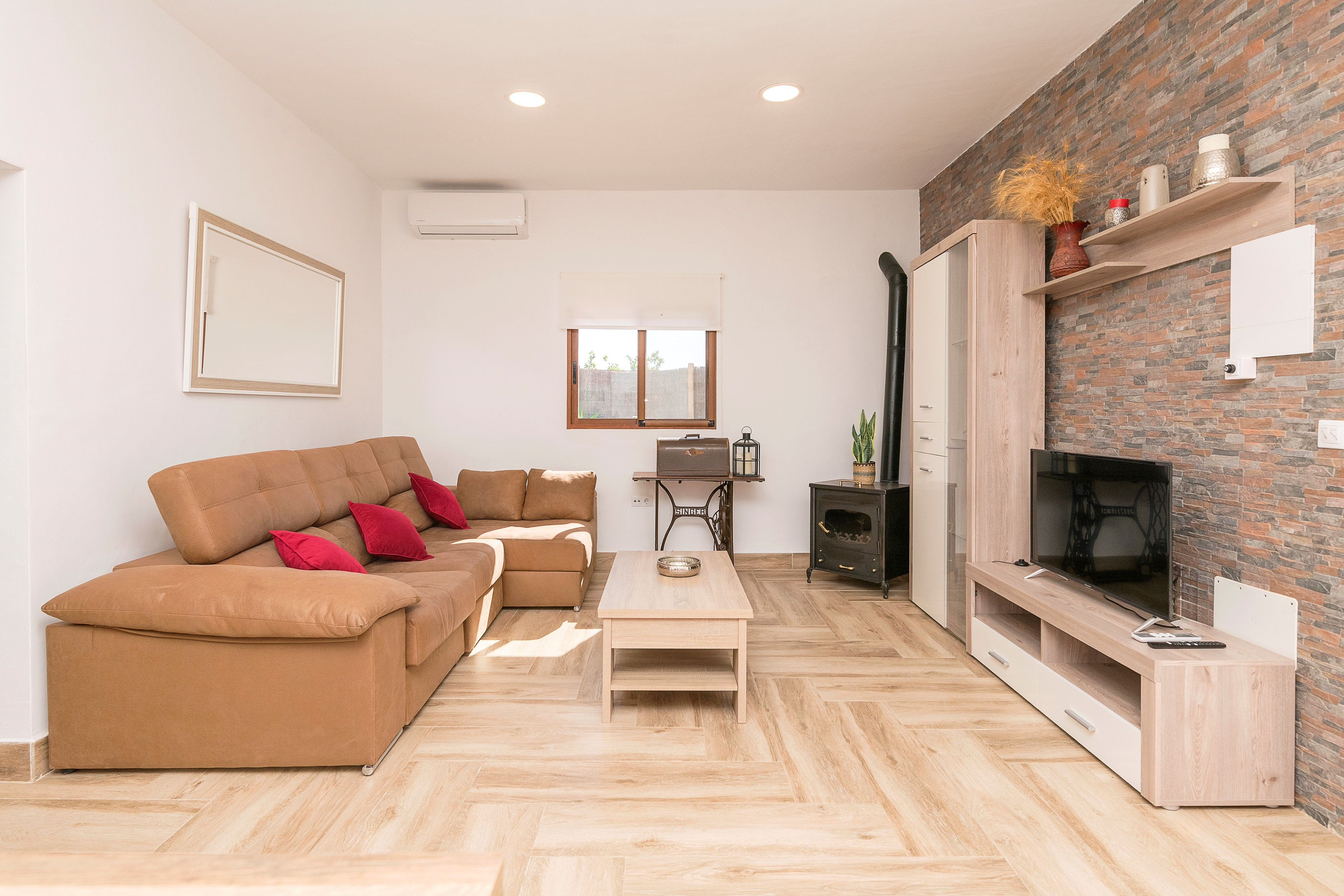 Binnen is het verdeeld over één verdieping en als u binnenkomt, vindt u de woonkamer die open staat voor de keuken. Het is uitgerust met tv en airconditioning en de keramische kookplaat beschikt over al het benodigde keukengerei zodat u kunt koken alsof u thuis bent. Er is een bar met vier krukken waar u kunt genieten van de heerlijke gerechten. Er is een wasmachine, strijkijzer en strijkplank. Als het tijd is om te slapen, zijn er twee slaapkamers met tweepersoonsbedden. Een badkamer met douche maakt uw verblijf compleet. Als u met uw baby reist, kunnen wij u voorzien van een kinderbedje en een kinderstoel.