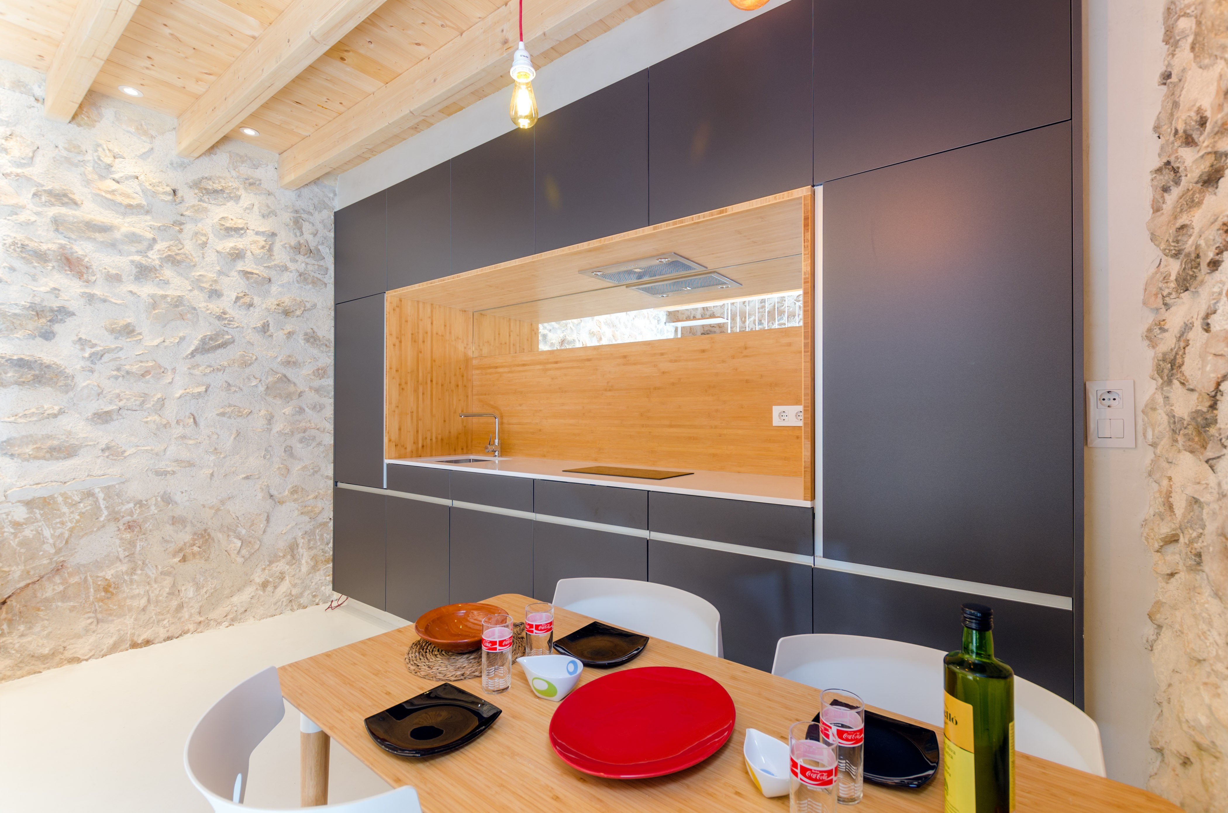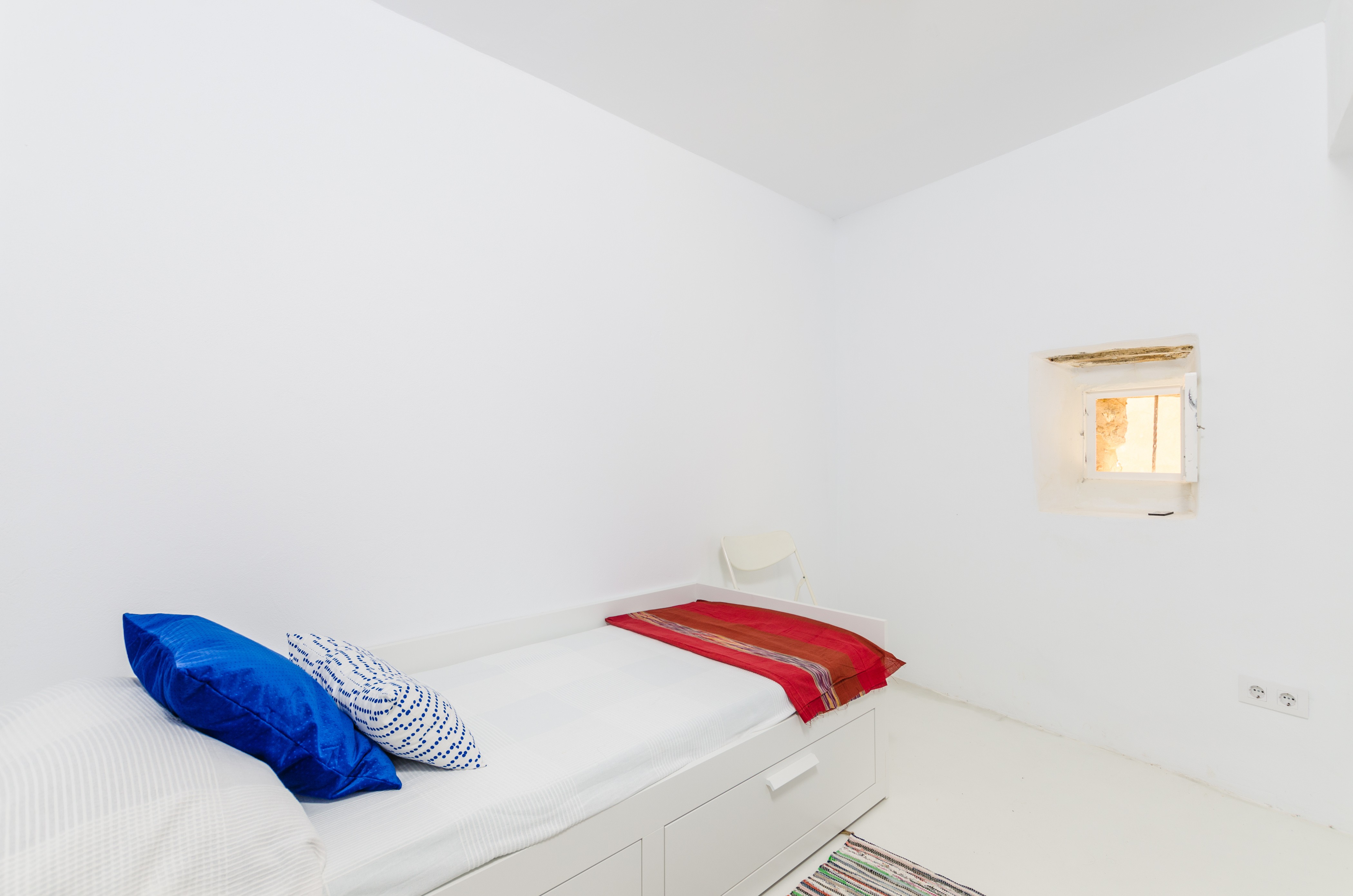 Het gebouw met twee verdiepingen heeft een indrukwekkende open ruimte – met een houtkachel – met de woonkamer, de eethoek en de keuken, dus de ruimte is behoorlijk functioneel: u kunt koken op de keramische kookplaat terwijl u met z'n allen aan tafel komt of satelliet-tv kijkt. Er is ook een eenpersoonskamer op deze verdieping. Als u naar boven gaat, vindt u de hoofdslaapkamer met airconditioning, een badkamer met douche en toegang tot het terras. Een wasmachine, strijkijzer en strijkplank zijn in het huis te vinden. Als u met uw baby reist, zijn er ook een kinderbedje en een kinderstoel beschikbaar.