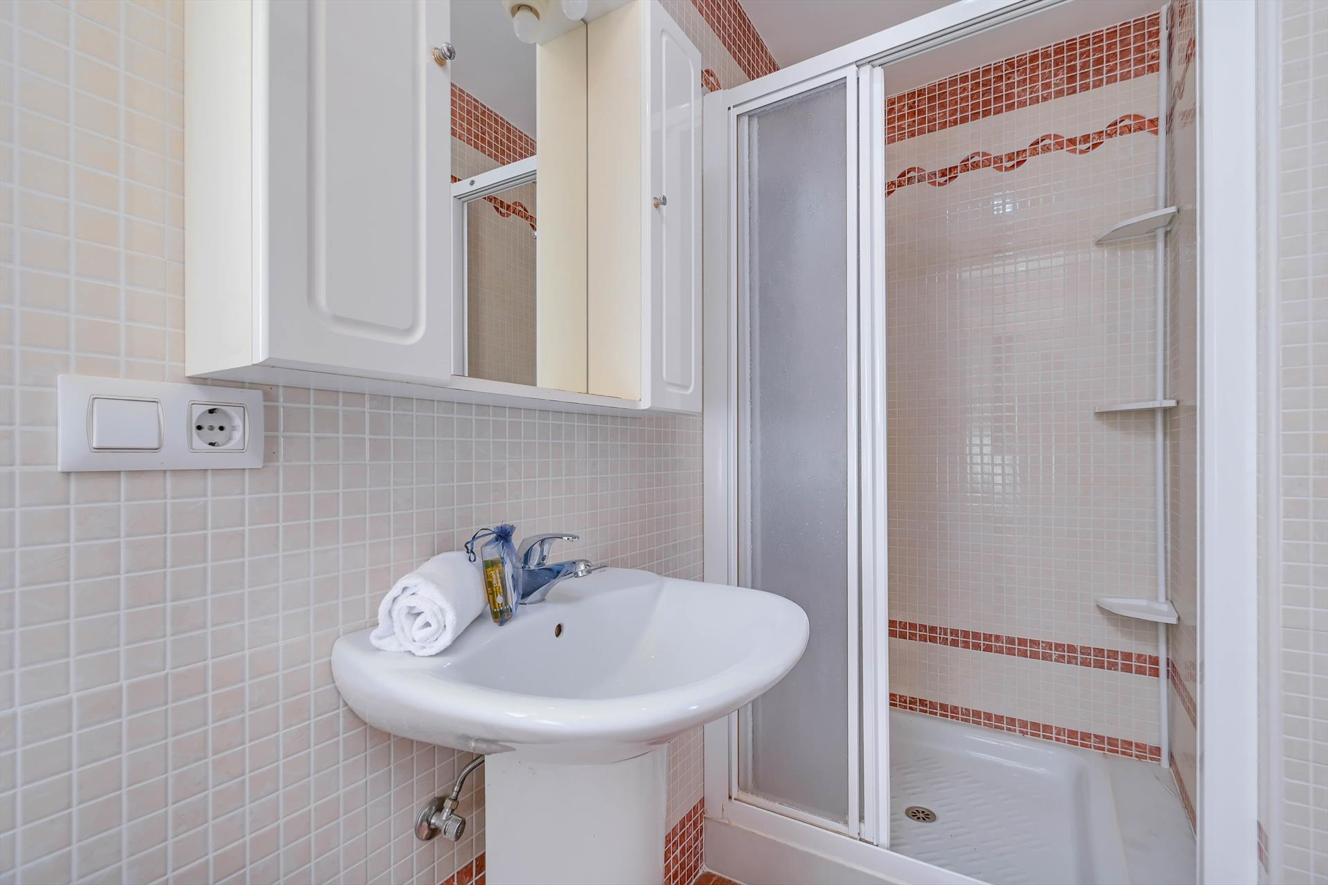 • badkamer met enkele wastafel, douche en toilet