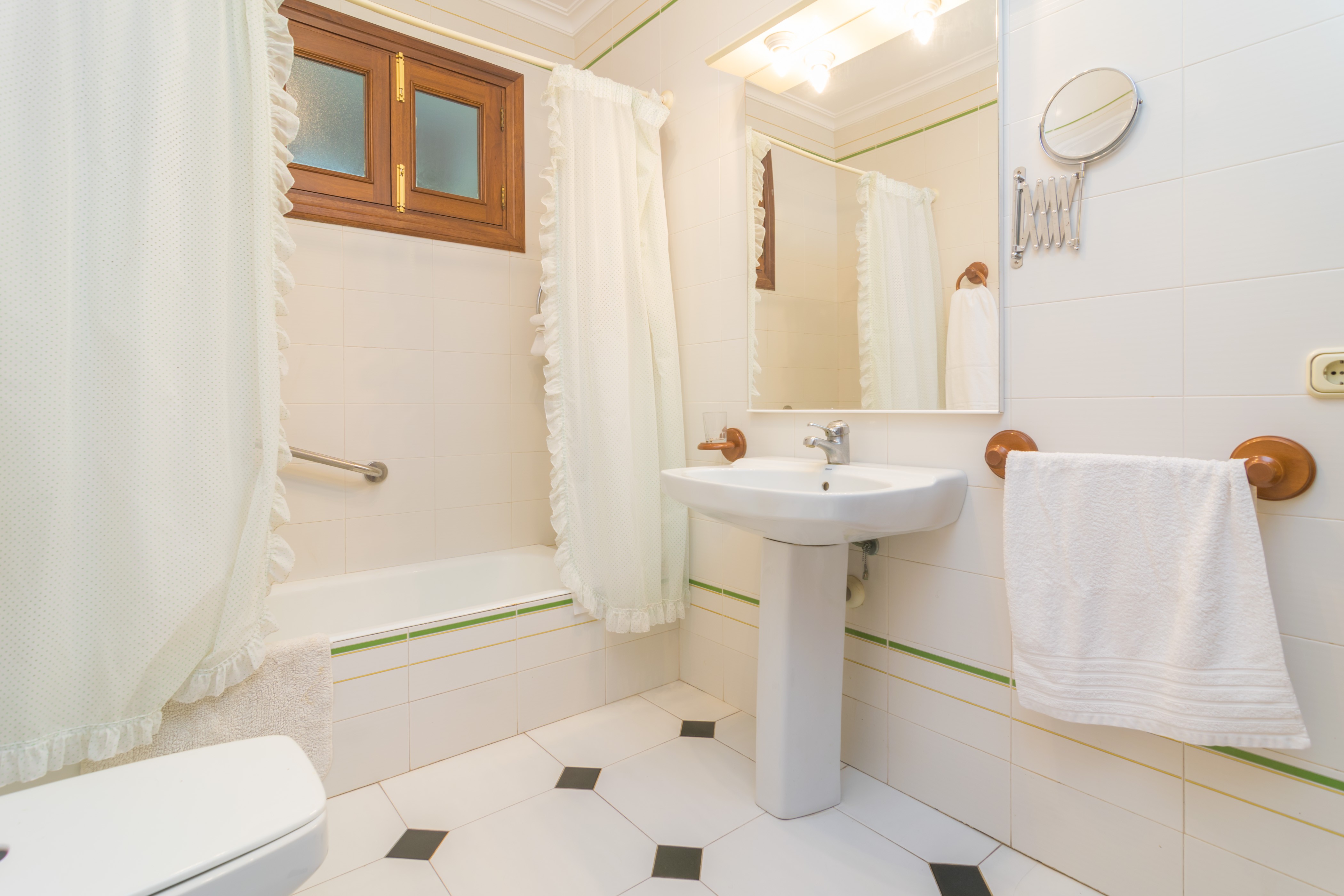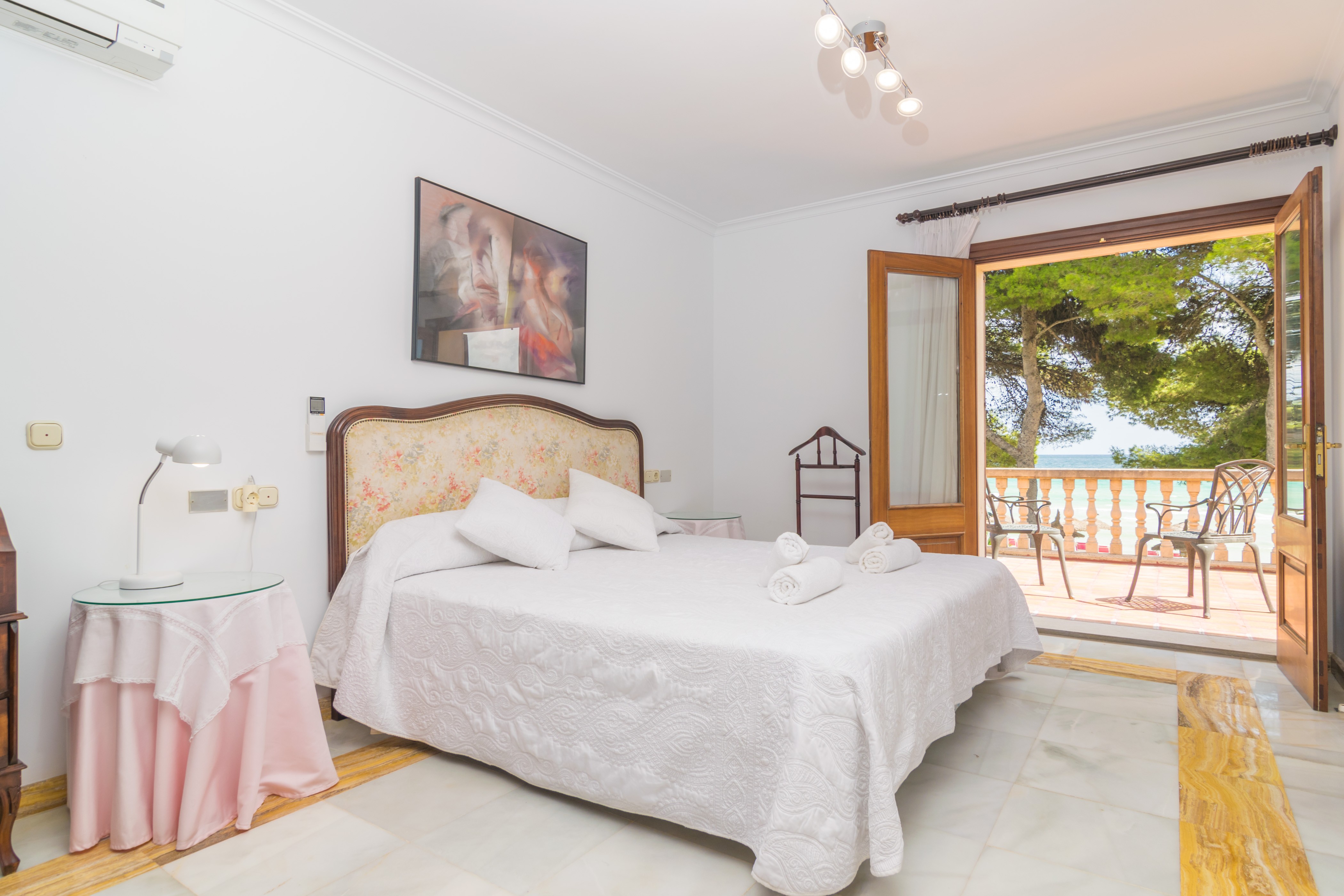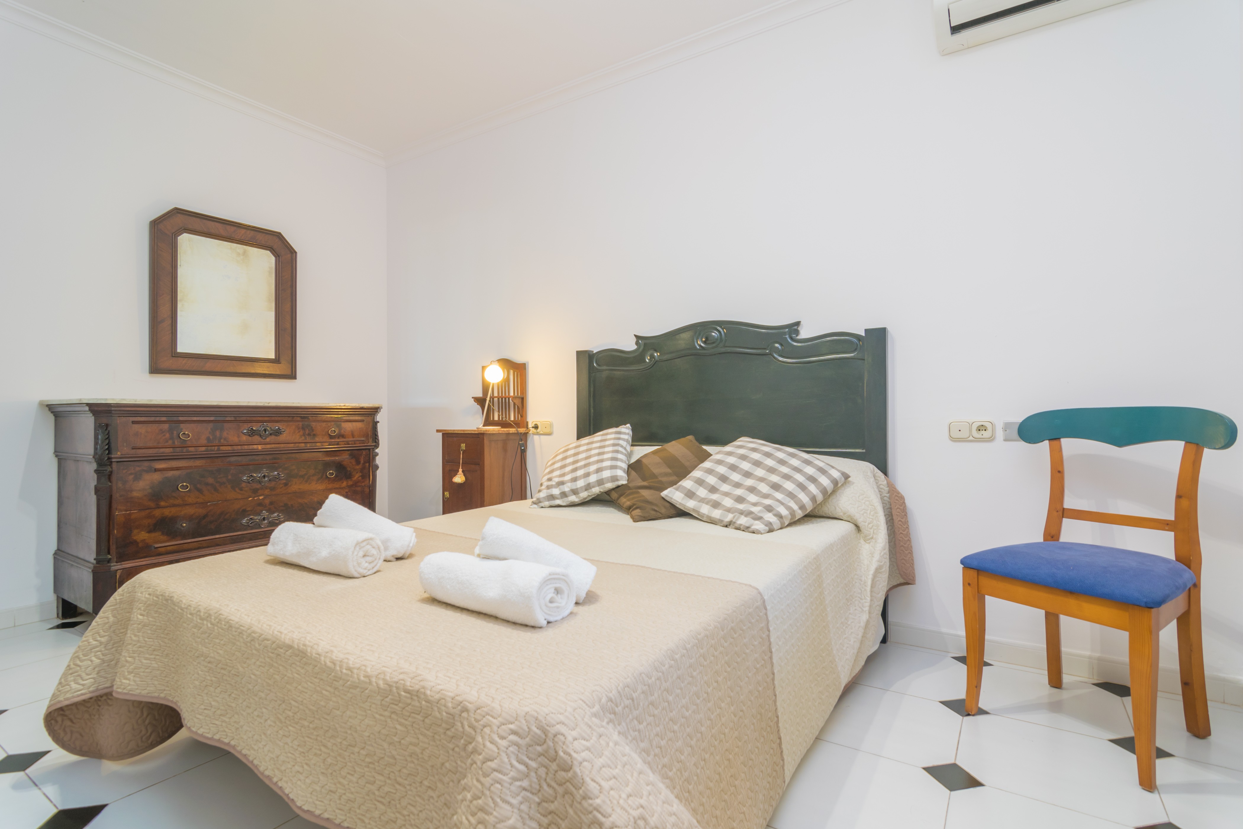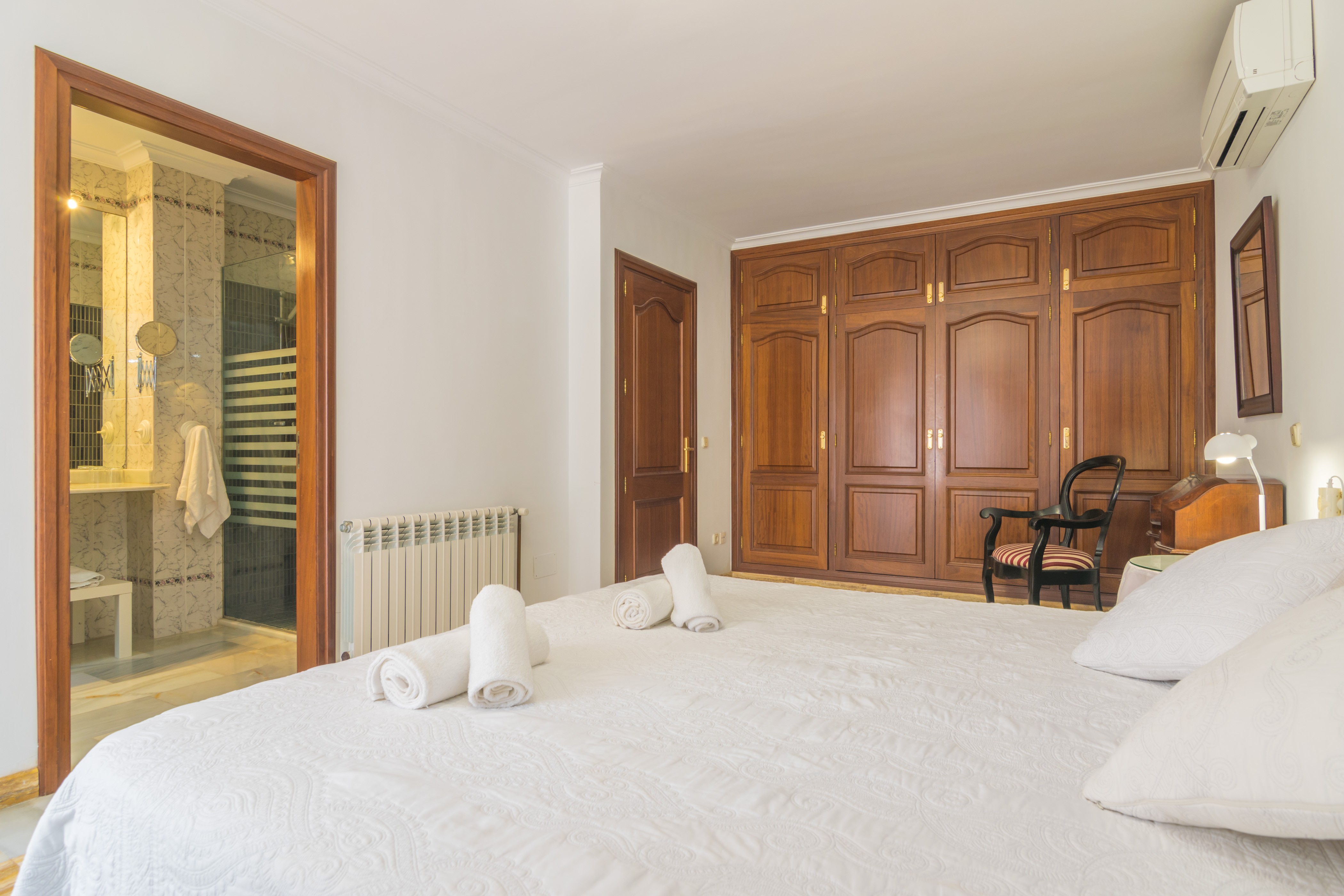 Dit ruime 220m² grote huis, verdeeld over twee verdiepingen, heeft 4 slaapkamers: 1 op de begane grond met een tweepersoonsbed, en 3 op de eerste verdieping (twee met een tweepersoonsbed, waarvan één met een en-suite badkamer met douche, en 1 met twee eenpersoonsbedden). Alle slaapkamers zijn uitgerust met airconditioning. Er is de mogelijkheid voor 1 extra gast op een slaapbank. Op aanvraag zijn twee babybedjes en een hoge stoel beschikbaar. Het huis heeft 2 badkamers met een bad, één op elke verdieping, voor algemeen gebruik.