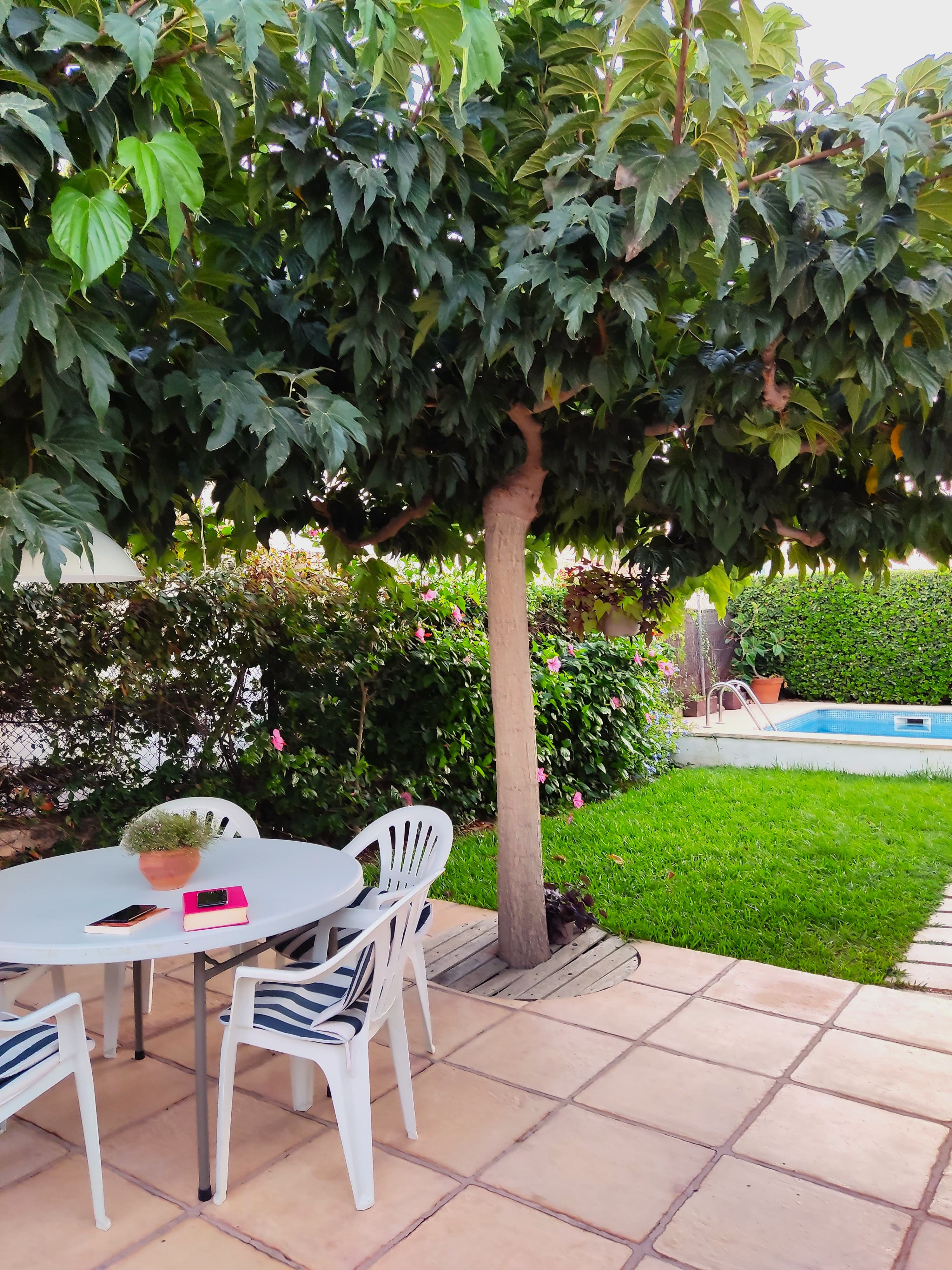 Buiten vind je een prachtige tuin met gazon waar je heerlijk kunt ontspannen in de zon, en een zoutwaterzwembad (4 x 3 meter, 1,5 meter diep) dat voor verkoeling zorgt op warme dagen. Het gemeubileerde terras en de overdekte veranda nodigen uit tot ontbijten in de open lucht of dineren onder de sterren, met een barbecue om heerlijke maaltijden te bereiden.