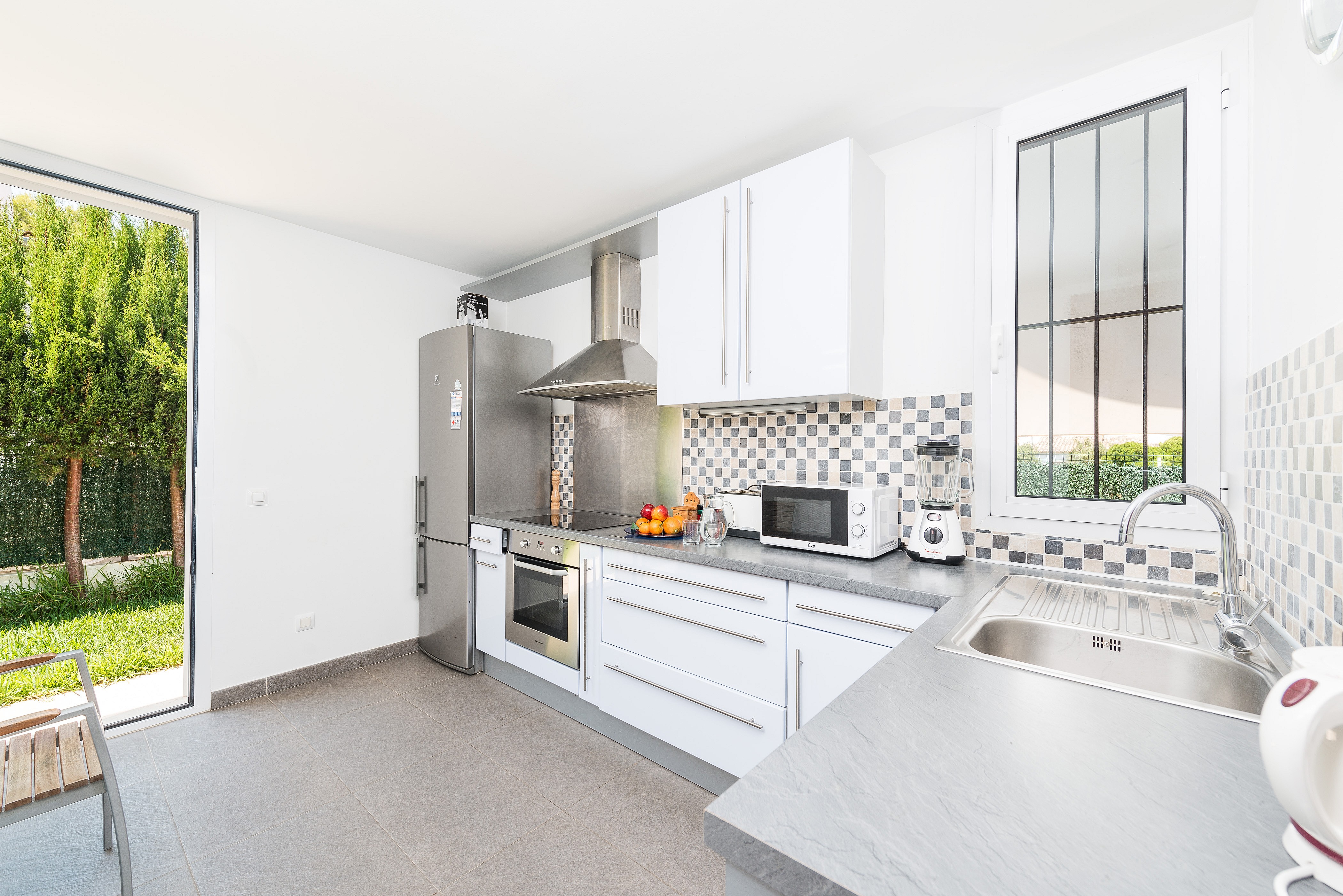Vanaf het terras heb je direct toegang tot de zit-eetkamer met A/C die is uitgerust met een gezellige bank, een eettafel met 6 stoelen, een televisie (alleen Spaanse en Duitse zenders), en een open haard voor koele herfstavonden. De aparte keuken heeft alles wat je nodig hebt voor je vakantie. Daarnaast is er een wasmachine, een strijkijzer en een strijkplank. Er zijn 3 slaapkamers. Eén slaapkamer bevindt zich op de begane grond, heeft een tweepersoonsbed en heeft toegang tot de tuin. De andere twee slaapkamers bevinden zich op de 1e verdieping, waarvan één met een tweepersoonsbed en de tweede met een stapelbed. Het stapelbed bestaat uit een tweepersoonsbed (beneden, 2 slaapplaatsen) en een eenpersoonsbed (boven, 1 slaapplaats). Er zijn 2 badkamers met elk een douche, een op elke verdieping. Het huis werkt op zonne-energie.