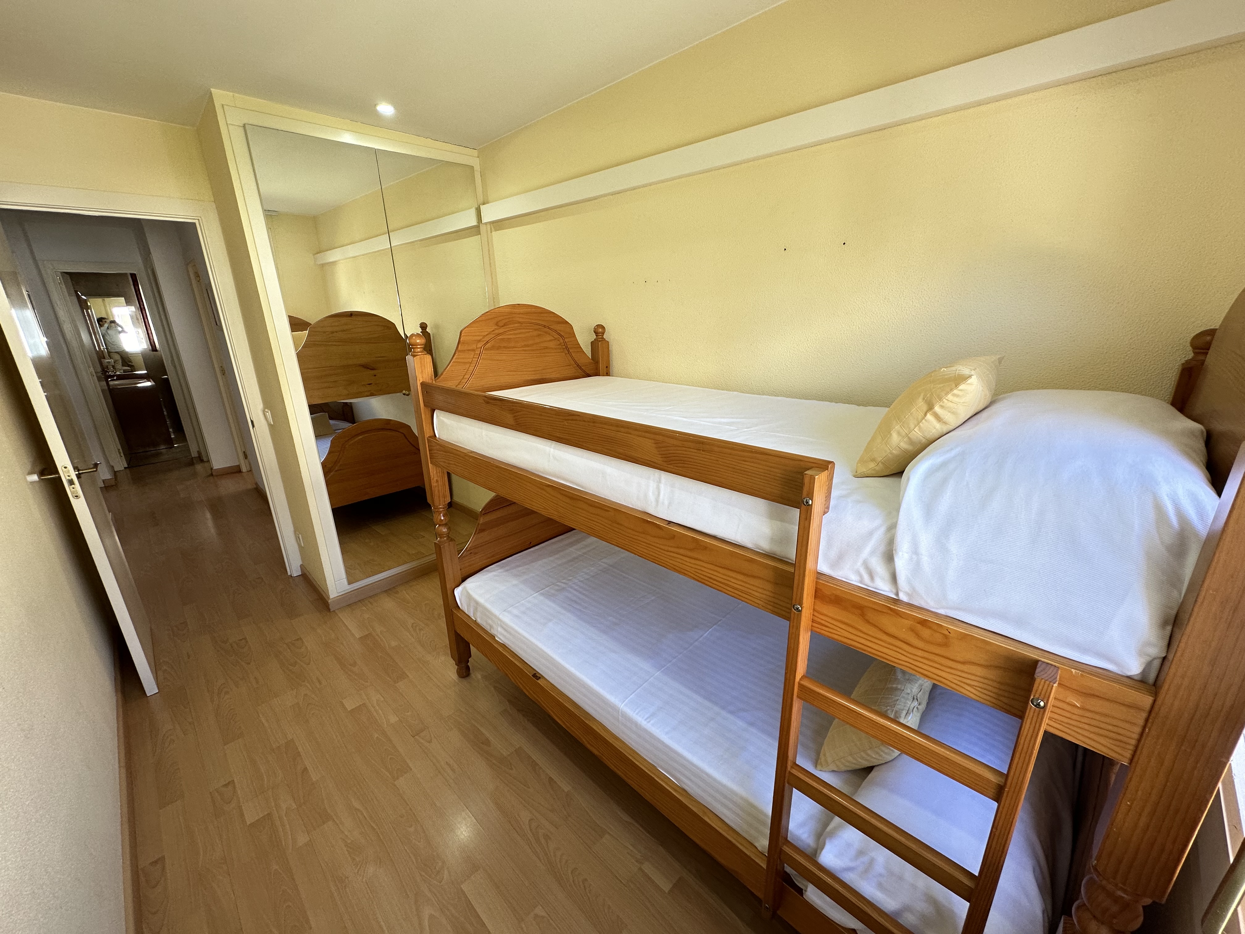 Het appartement heeft drie slaapkamers: twee met tweepersoonsbedden en één met een stapelbed. Er zijn ook twee badkamers, elk met een douche.
