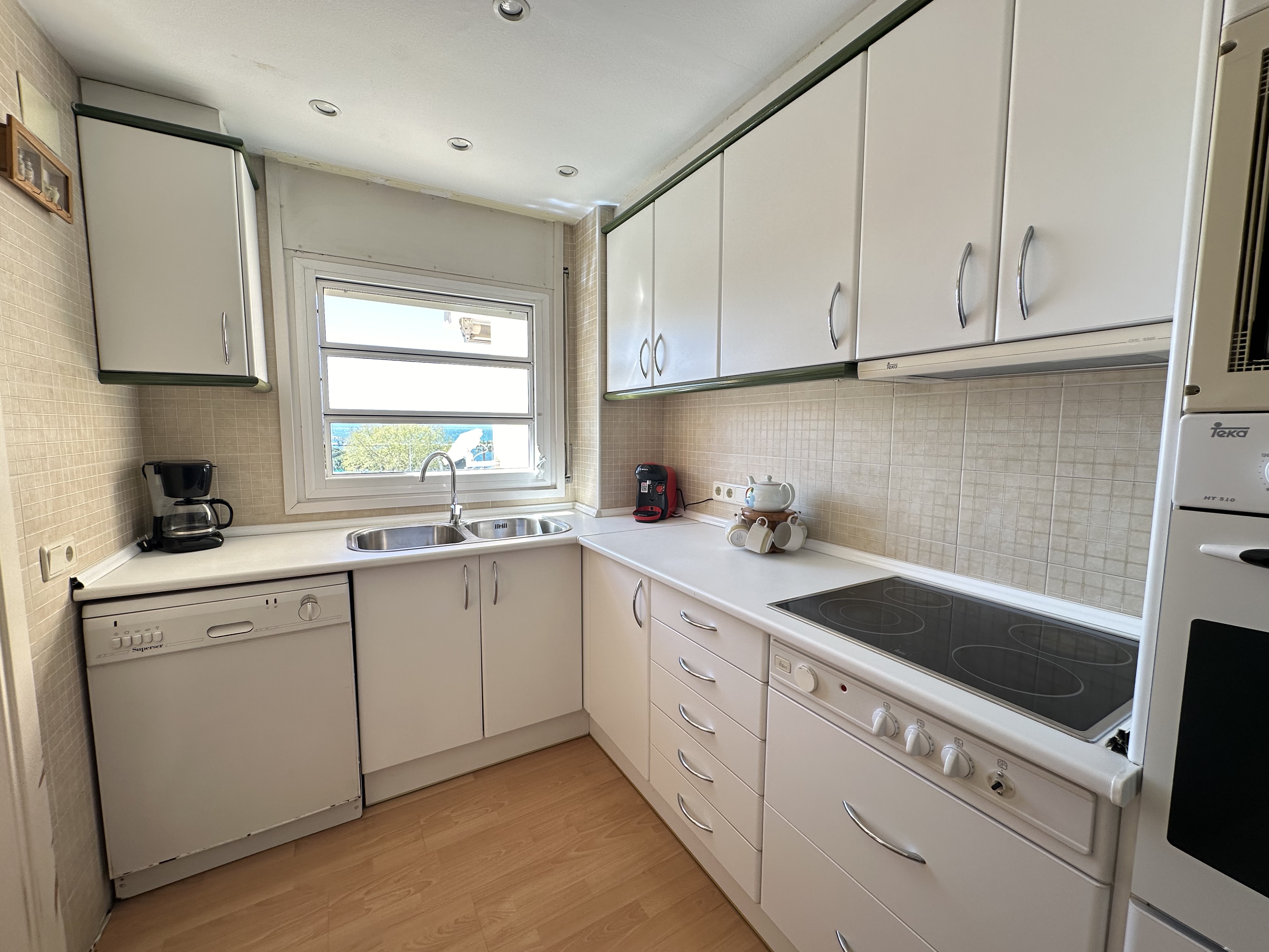 Ruim 80 m² appartement met een woonkamer en eetgedeelte en toegang tot het terras. De volledig uitgeruste keuken bevat een elektrisch fornuis, oven, vriezer, koelkast, magnetron en vaatwasser.