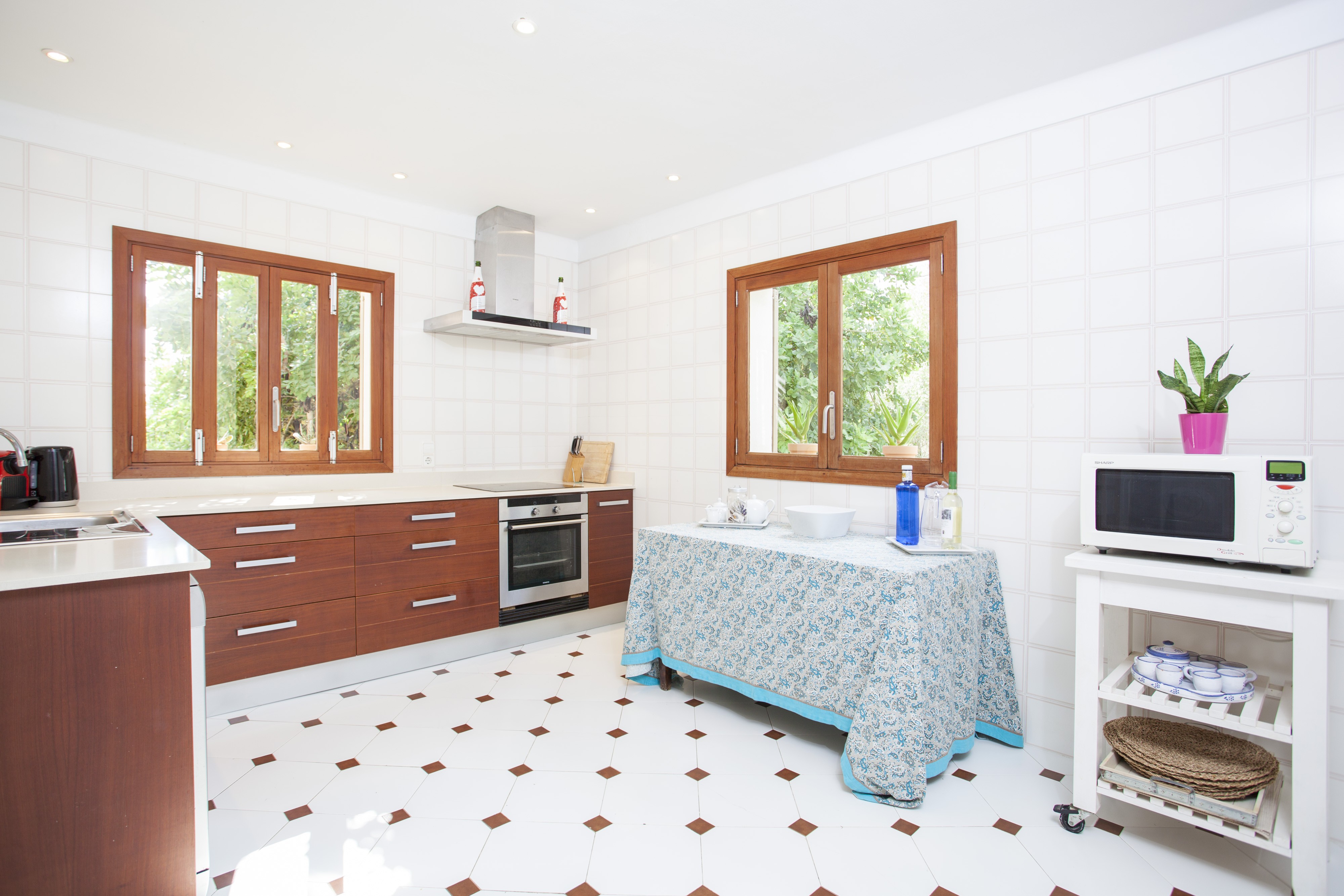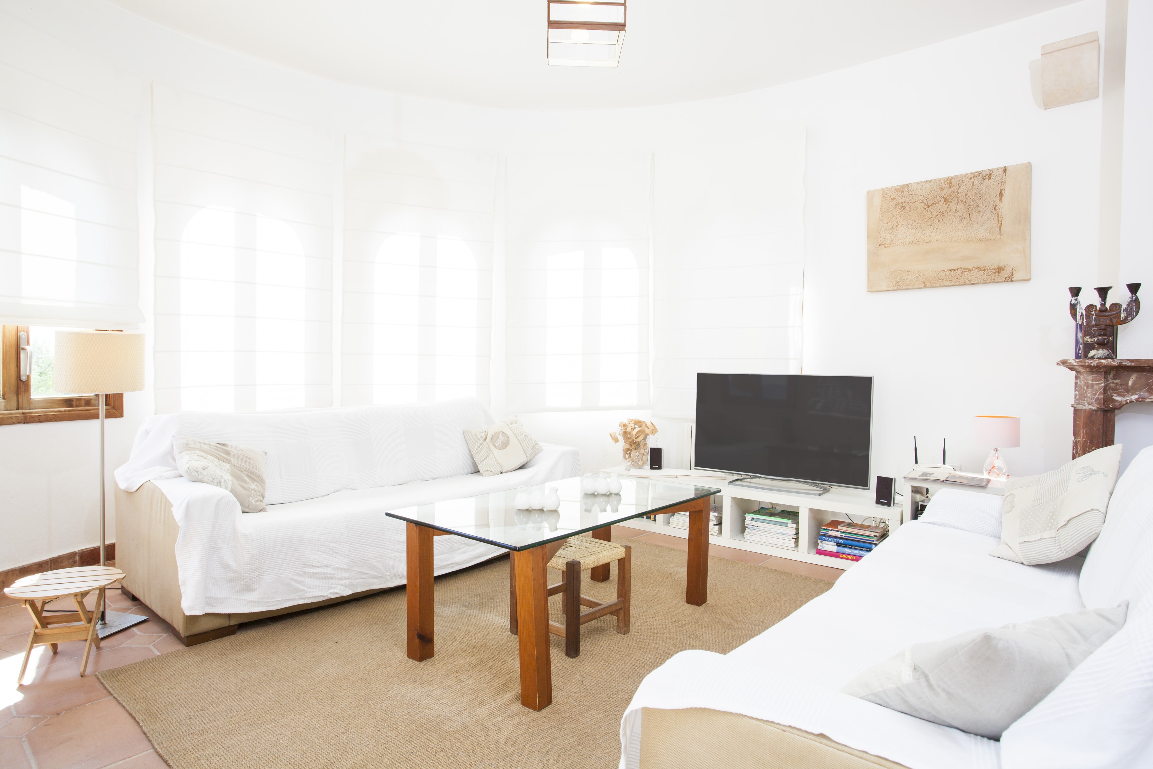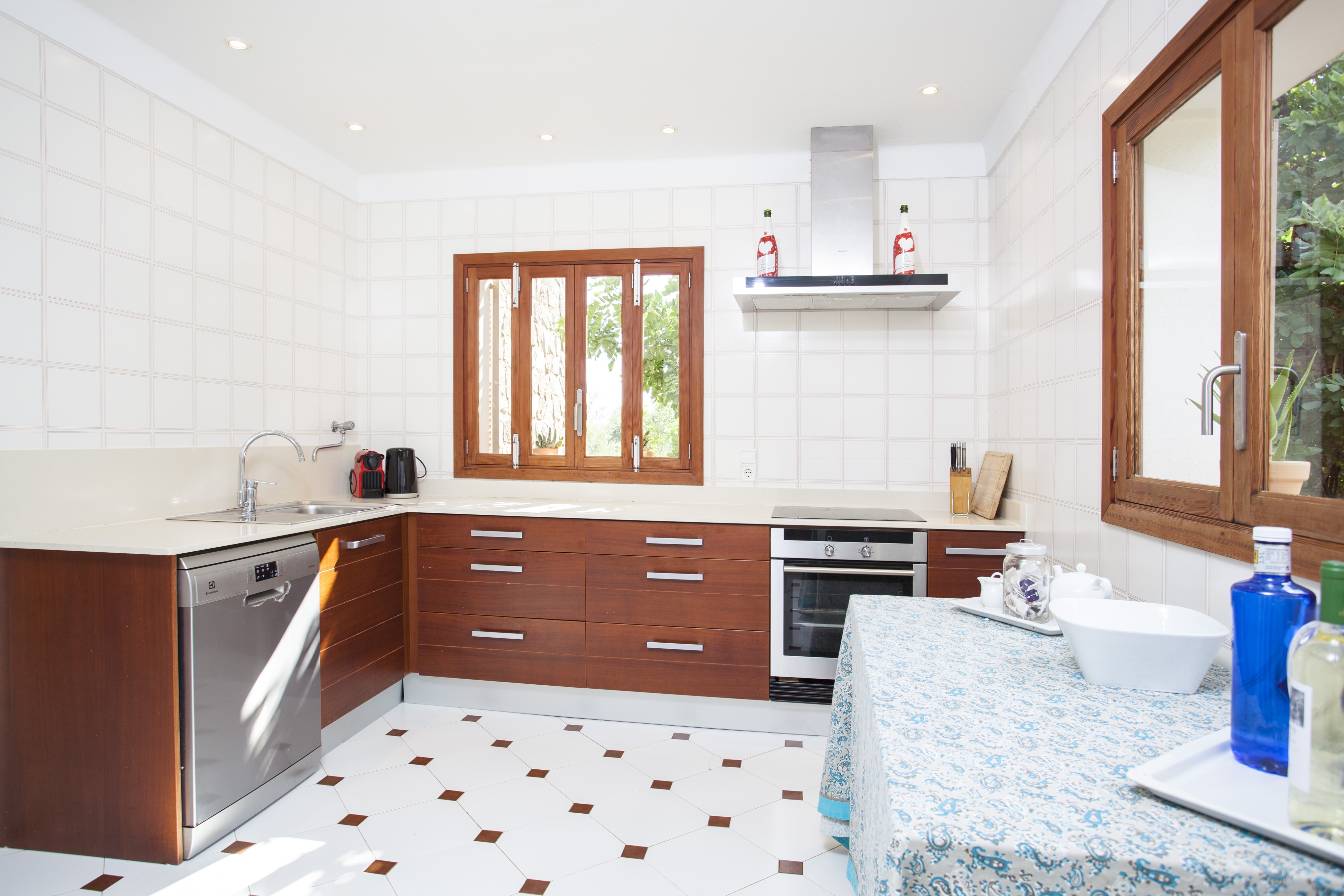 Een ronde boogdeur geeft toegang tot een kleine hal en leidt naar de gezellige woon-eetkamer met satelliet-tv en dvd-speler. Er is een volledig uitgeruste keuken met een vitrokookplaat en al het andere dat u nodig heeft om een feestmaal te bereiden. Verder is er een wasmachine, een strijkijzer en een strijkplank. Vier mooie slaapkamers met kledingkast en een tweepersoonsbed maken dit huis ideaal voor acht gasten. Indien nodig kunnen wij een kinderbedje en een kinderstoel leveren. In de winter krijgt u geen koude voeten dankzij de centrale verwarming. Twee slaapkamers zijn voorzien van een badkamer en-suite met ligbad. Een derde badkamer is apart en heeft een douche en een ligbad. Er is airconditioning in de woonkamer en in alle slaapkamers.
