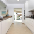 Woonkeuken met elektrisch fornuis, elektrische oven, magnetron, vaatwasser, koel-vriescombinatie, koffiezetapparaat, waterkoker, mixer, broodrooster en citruspers