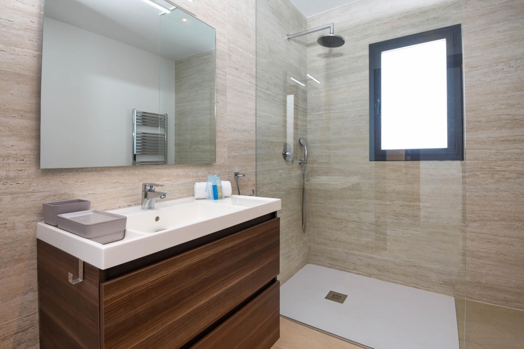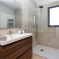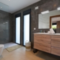 ensuite badkamer met dubbele wastafel, douche en toilet