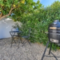 prachtige tuin met grind, bomen en tuinmeubelen met ligstoelen