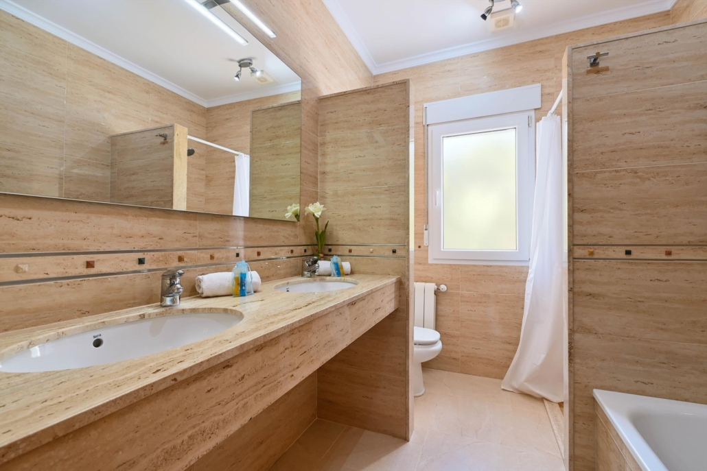 • Badkamer met dubbele wastafel, ligbad, douche en toilet