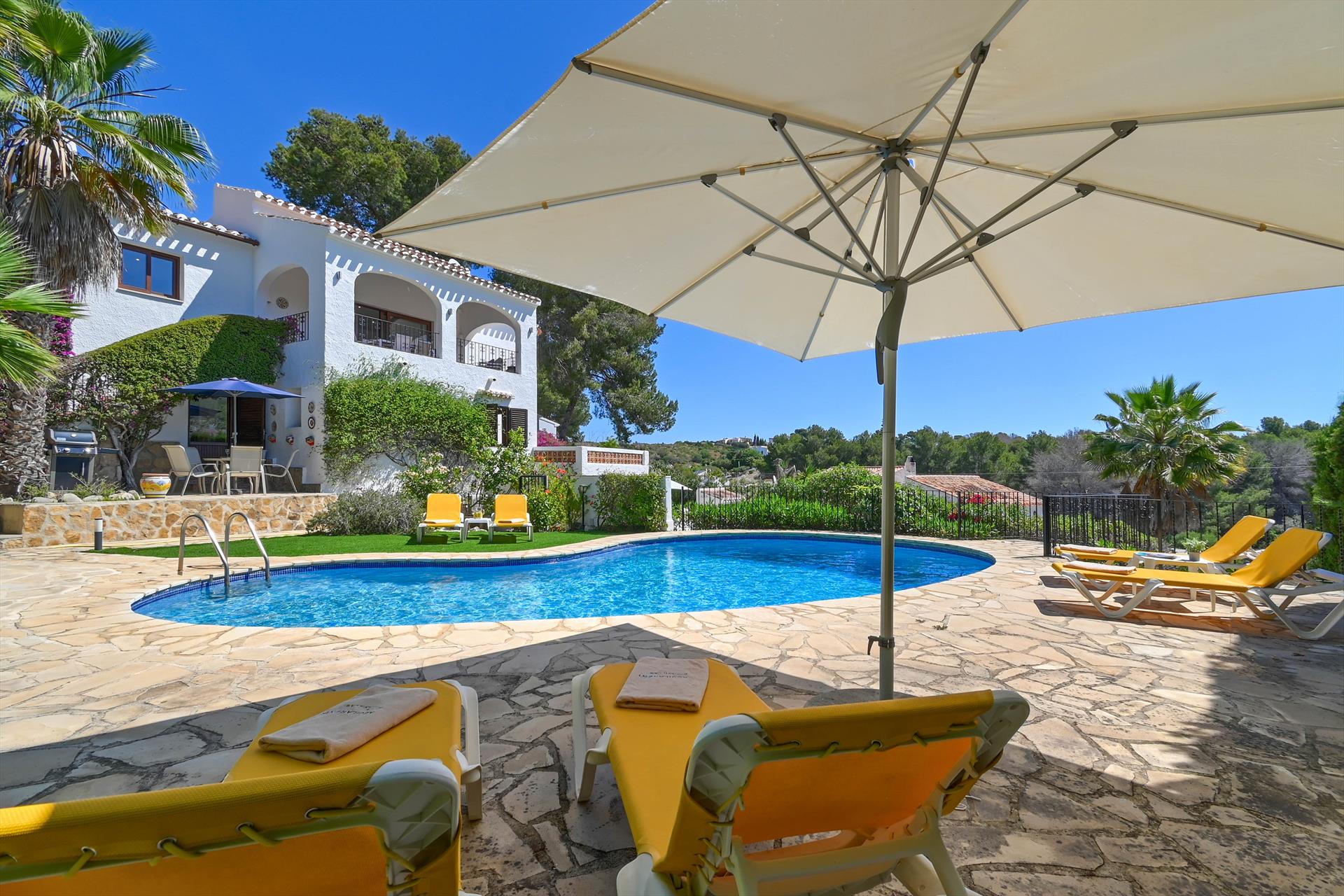 Prachtige en comfortabele villa in Jávea, Costa Blanca, Spanje met privézwembad voor 6 personen. Het huis is gelegen in een residentiële strandwijk en is 3 km verwijderd van het strand El Arenal, Jávea.