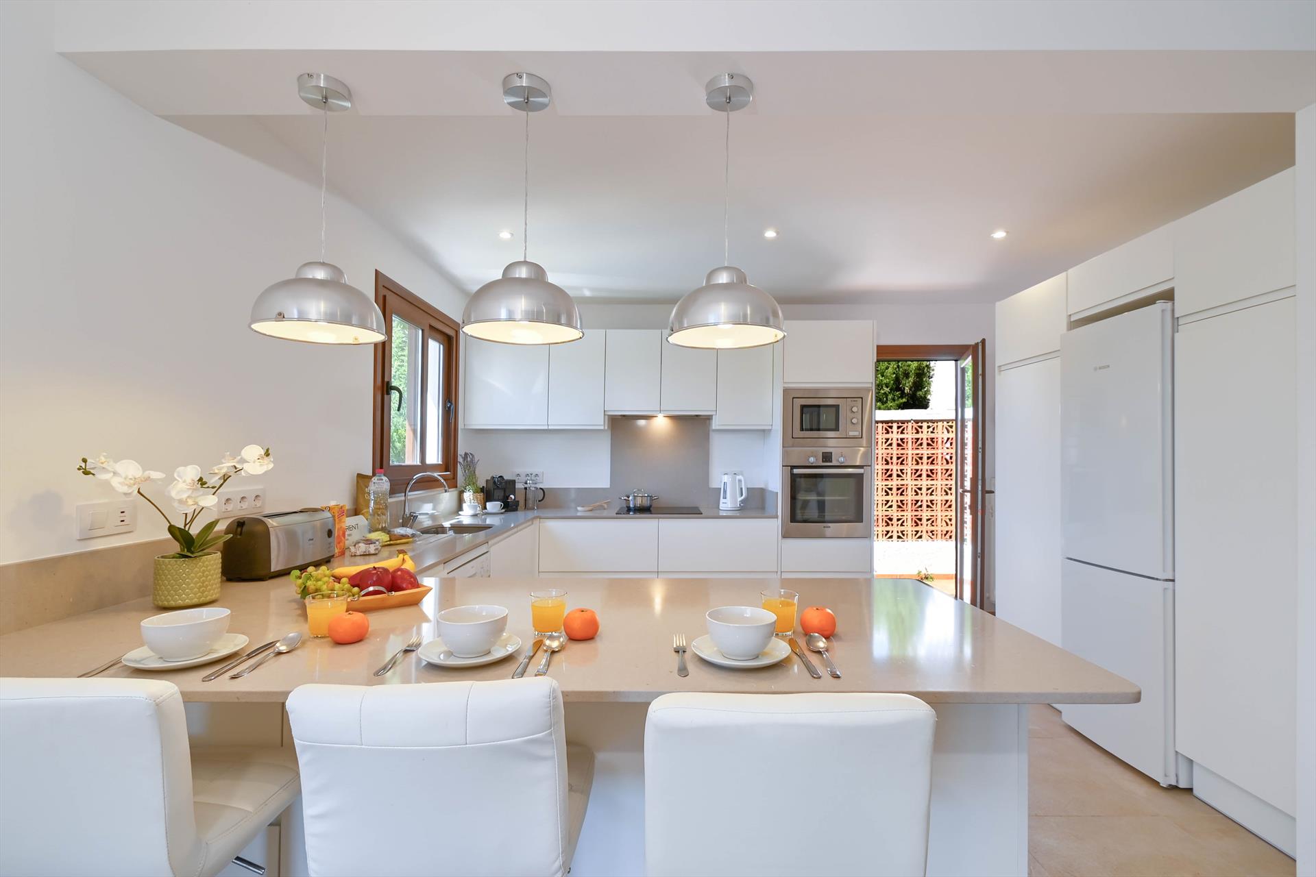 Open keuken met elektrische kookplaat, elektrische oven, magnetron, vaatwasser, koel-vriescombinatie, koffiezetapparaat, waterkoker, mixer, broodrooster en citruspers