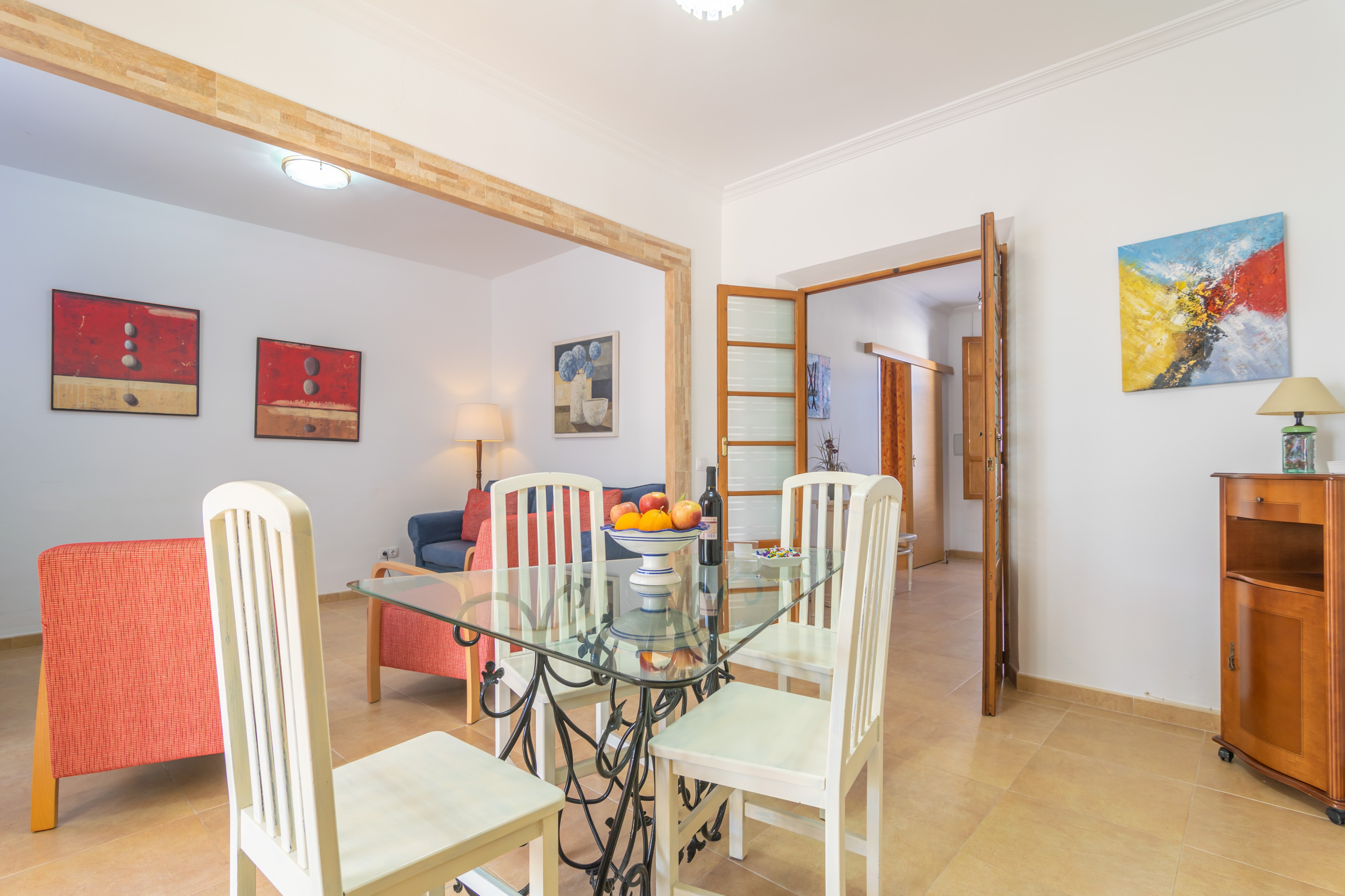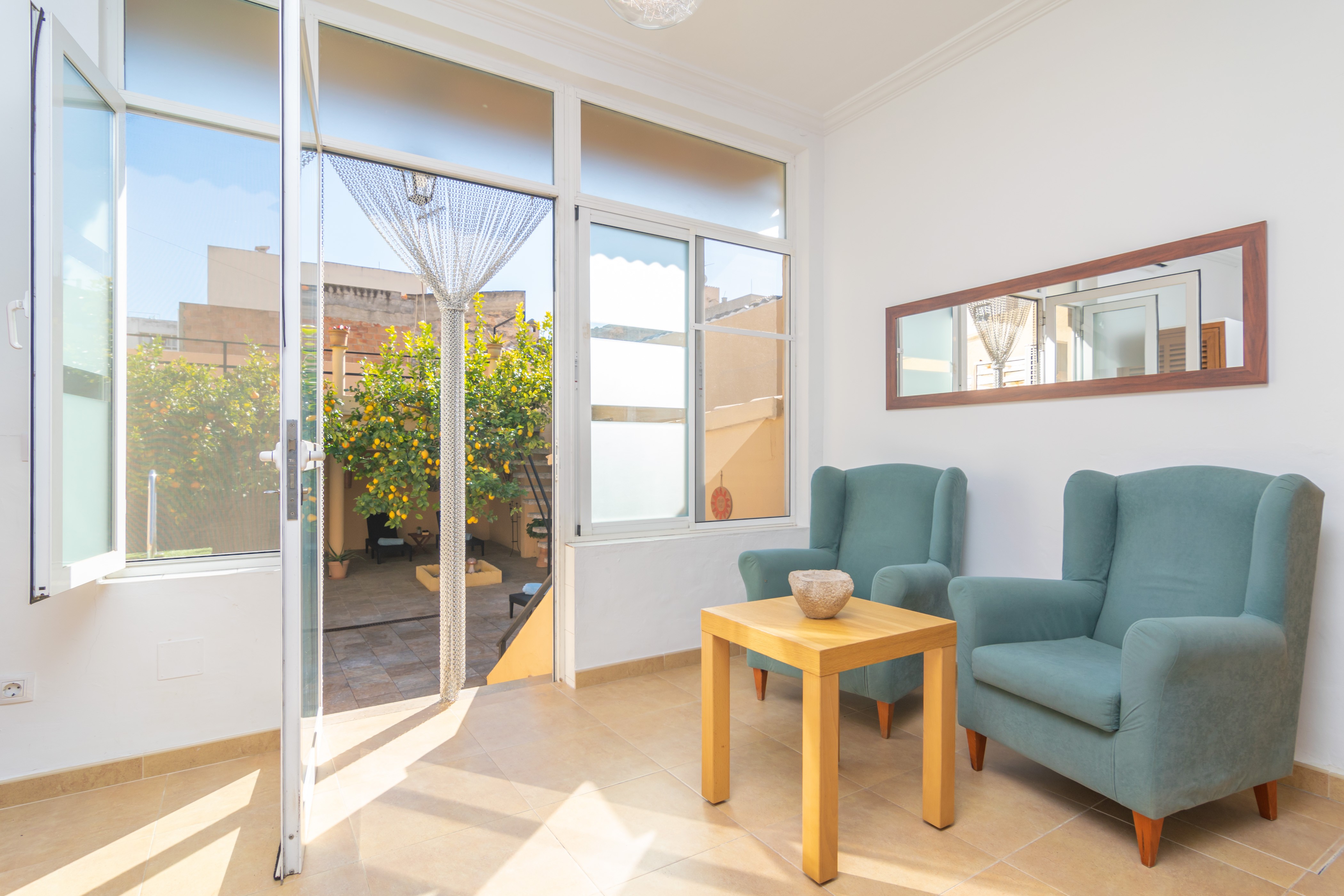 Het huis is gelijkvloers en heeft een eenvoudige en gezellige stijl. Bij binnenkomst vanaf de patio vindt u een lichte kamer waar u kunt zitten en genieten van een goed boek. Het beschikt over airconditioning, communiceert met de woon-eetkamers en heeft een televisie. De aparte keuken beschikt over een keramische kookplaat en het raam kijkt uit op de woonkamer met toegang tot de patio. Twee mooie slaapkamers nodigen u uit om 's nachts uit te rusten, een met een tweepersoonsbed en een draagbare airconditioning, en de tweede met twee eenpersoonsbedden en een ventilator. Er is ook een badkamer met een douche. Een kinderbedje, een kinderstoel, een wasmachine, een strijkijzer en een strijkplank maken de uitrusting compleet.