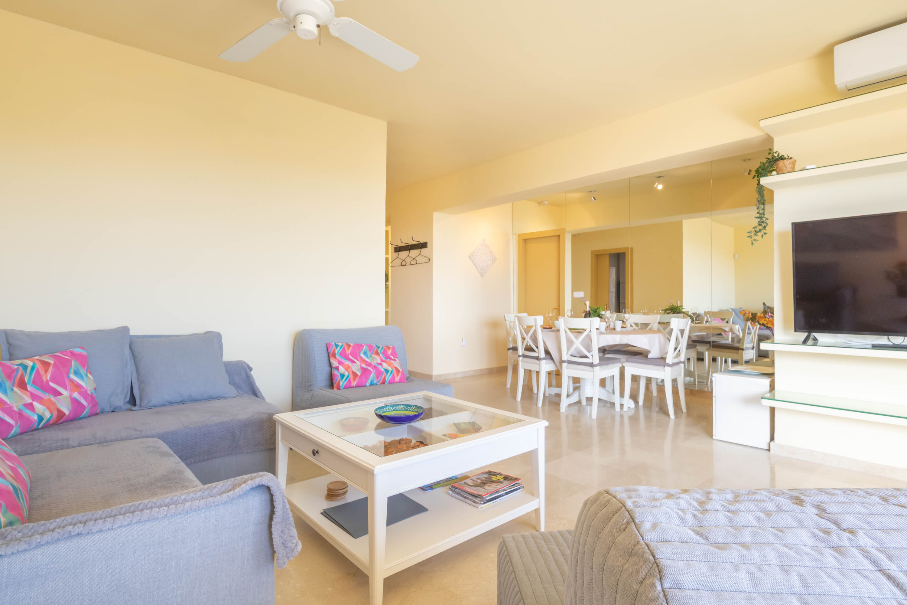 Het appartement bevindt zich op de derde verdieping van een rustig complex en biedt toegang tot een gemeenschappelijk zwembad en goed onderhouden tuinen. De woonkamer is ruim en licht, met een Smart TV, eetgedeelte en een bank om te ontspannen. De keuken is volledig uitgerust met een vaatwasser, magnetron en koffiezetapparaat. De slaapkamer met airconditioning heeft een ensuite badkamer en directe toegang tot het terras.