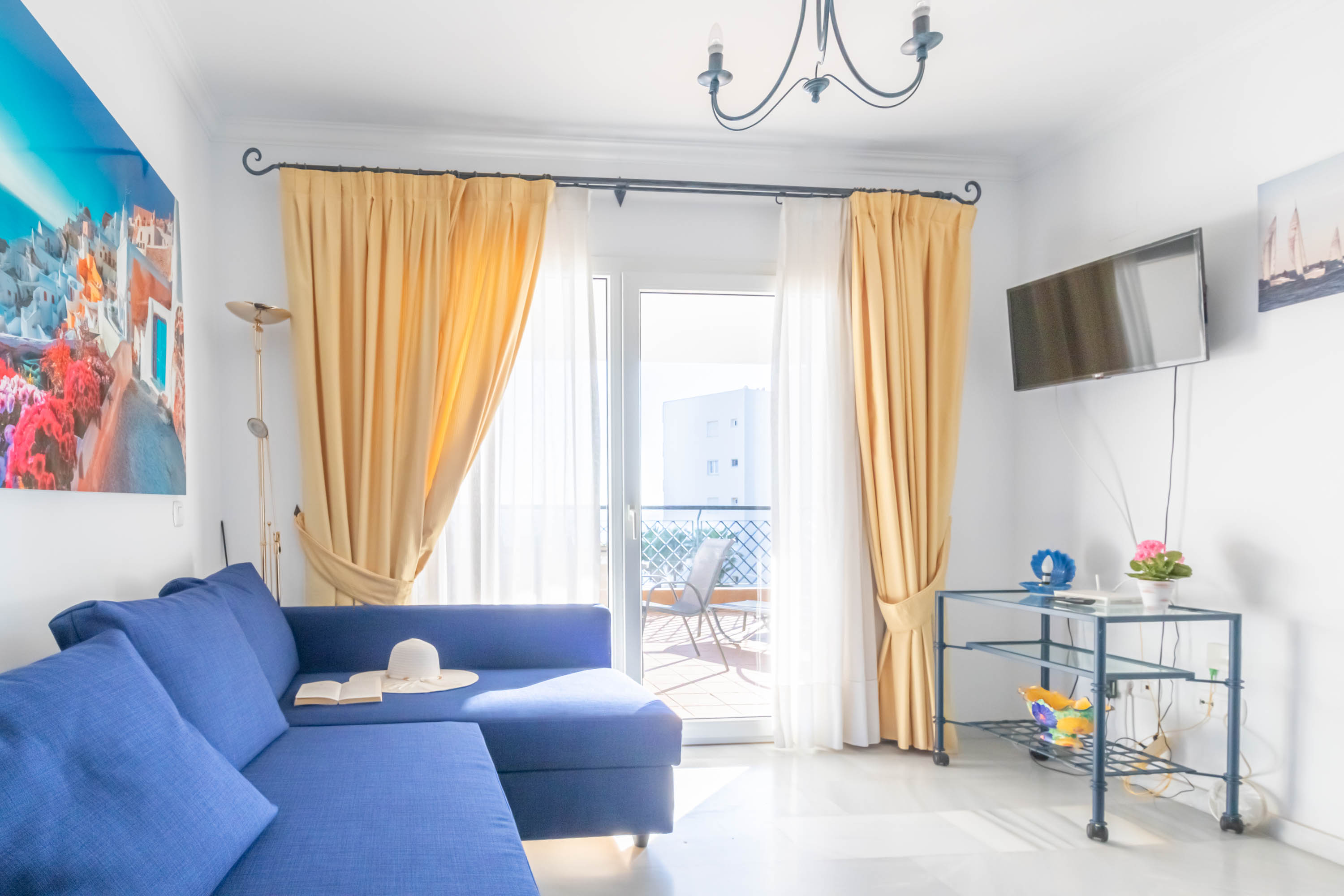 Het appartement met airconditioning beschikt over een op het zuiden gelegen terras met buiten eetgelegenheid, te bereiken vanuit de woonkamer, perfect om te genieten van zonsopgang en zonsondergang. De leefruimte is verdeeld in een zit- en eetgedeelte. De aparte keuken is volledig uitgerust met moderne apparatuur zoals een magnetron, oven, inductiekookplaat, broodrooster, elektrische waterkoker en koelkast.