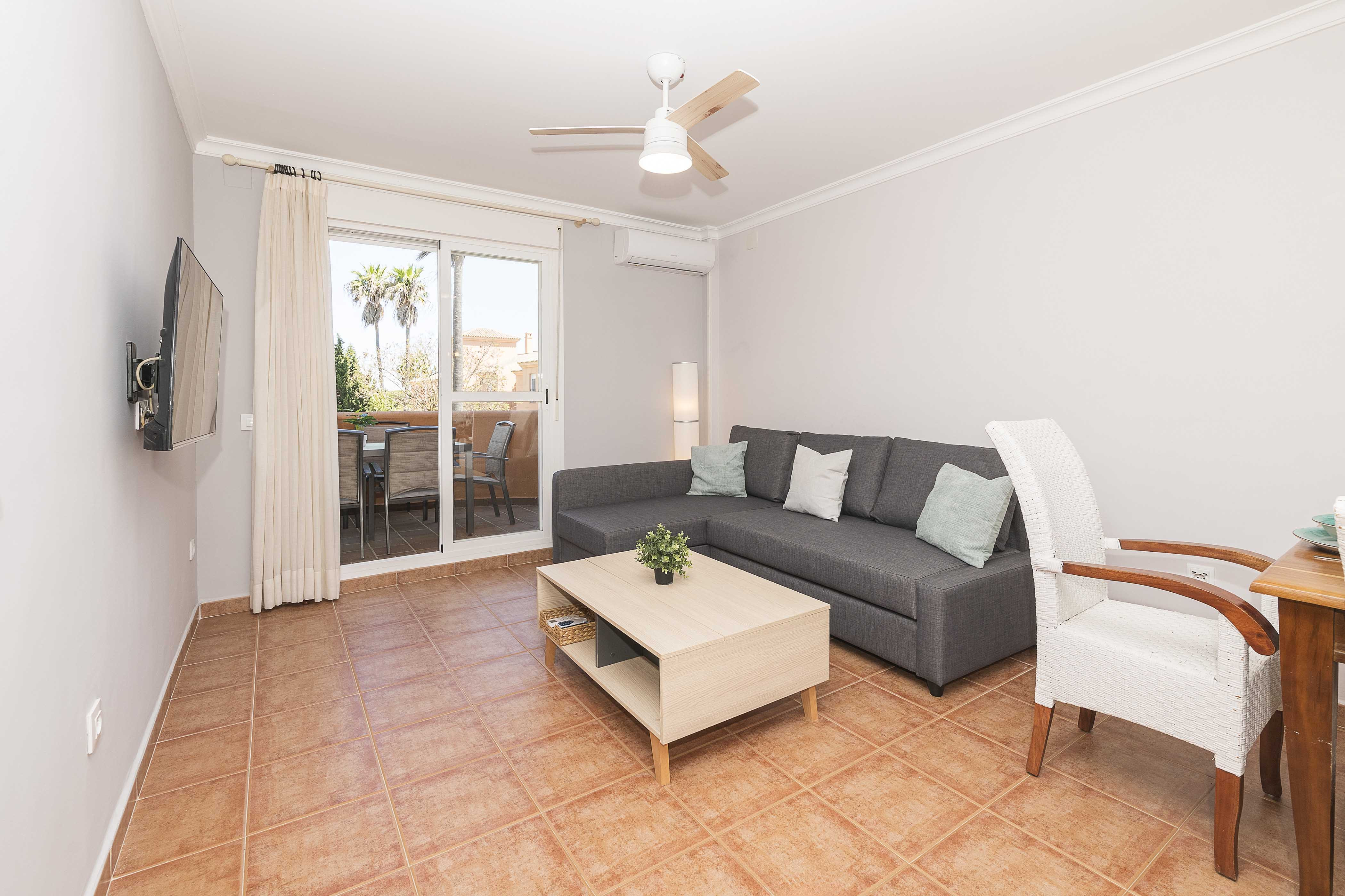 Buiten vindt u een klein privéterras met een tafel en stoelen – de ideale plek om 's avonds te ontspannen met familie of vrienden. Binnen is de lichte woon-eetkamer uitgerust met airconditioning, een Smart TV en een slaapbank voor een extra gast.