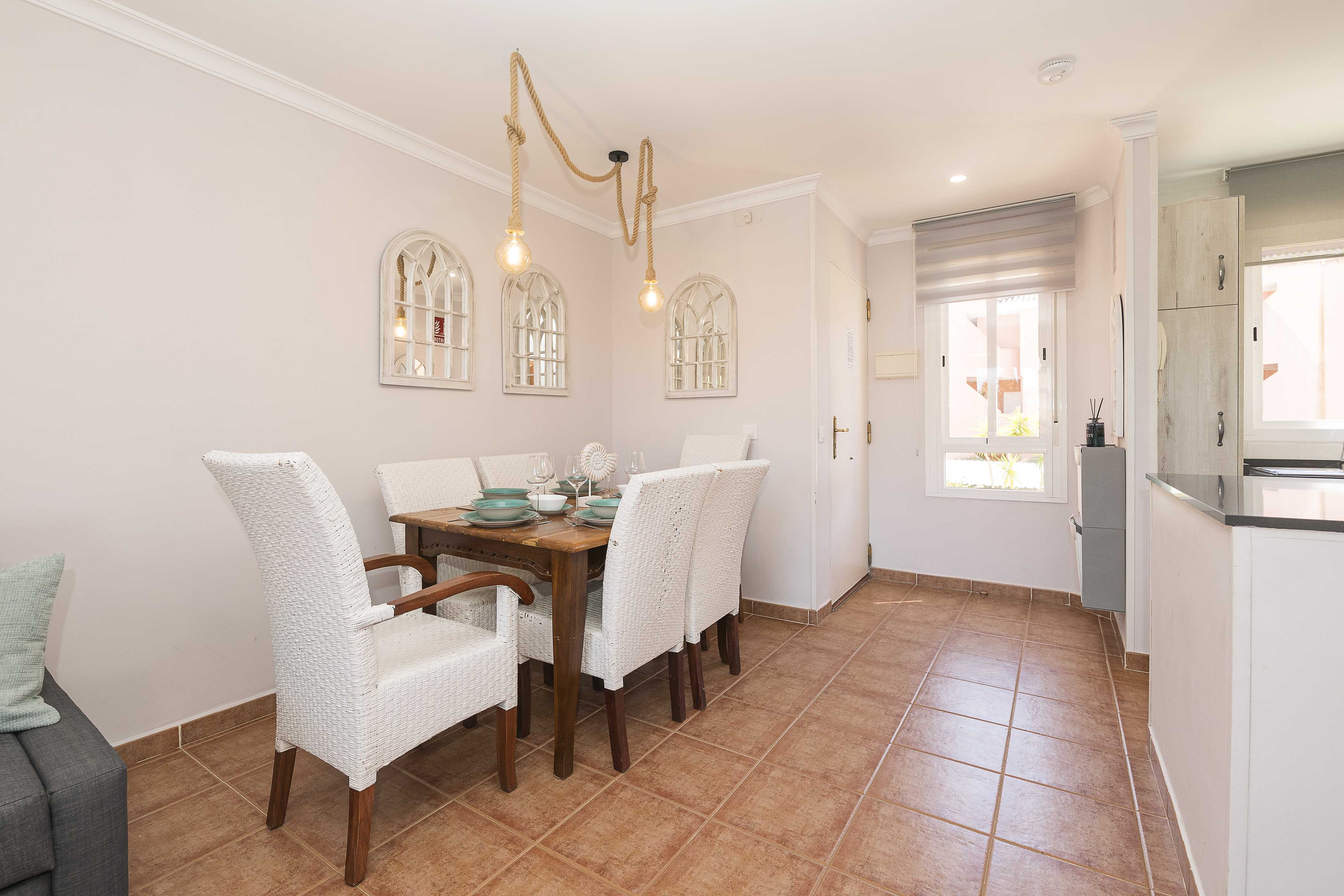 Gelegen in het rustige Residencial Jardín Golf 2, is dit appartement de ideale plek voor een ontspannen vakantie met familie of vrienden. Buiten vindt u een ruim gemeenschappelijk zwembad (17 m x 10 m, diepte van 1,10 m tot 1,95 m), perfect om af te koelen op zonnige dagen. Het zwembad is omgeven door een verzorgde graszone en beschikt over een buitendouche voor extra comfort.