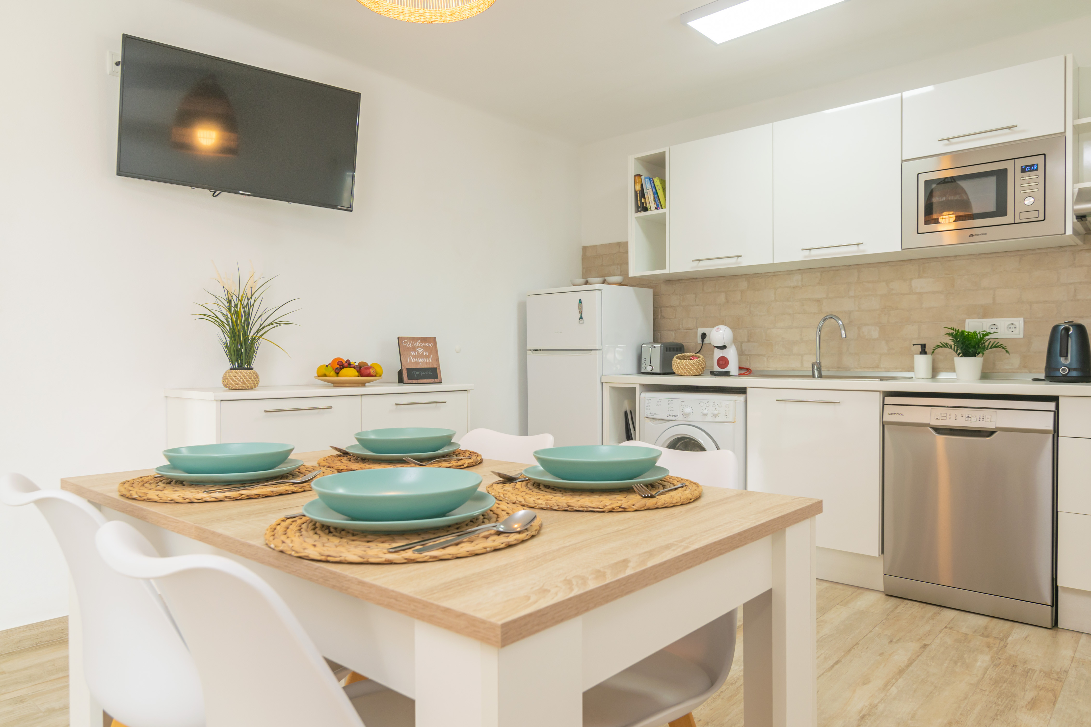 Gelegen op de begane grond van een gebouw is het gezellige interieur van het appartement smaakvol ingericht en ontworpen om u de rust te bieden die u verdient. De ruime woonkamer, uitgerust met airconditioning en een Smart-tv met satellietkanalen, staat in open verbinding met de keuken, die beschikt over een keramische kookplaat en alle benodigde keukengerei om comfortabel te koken.