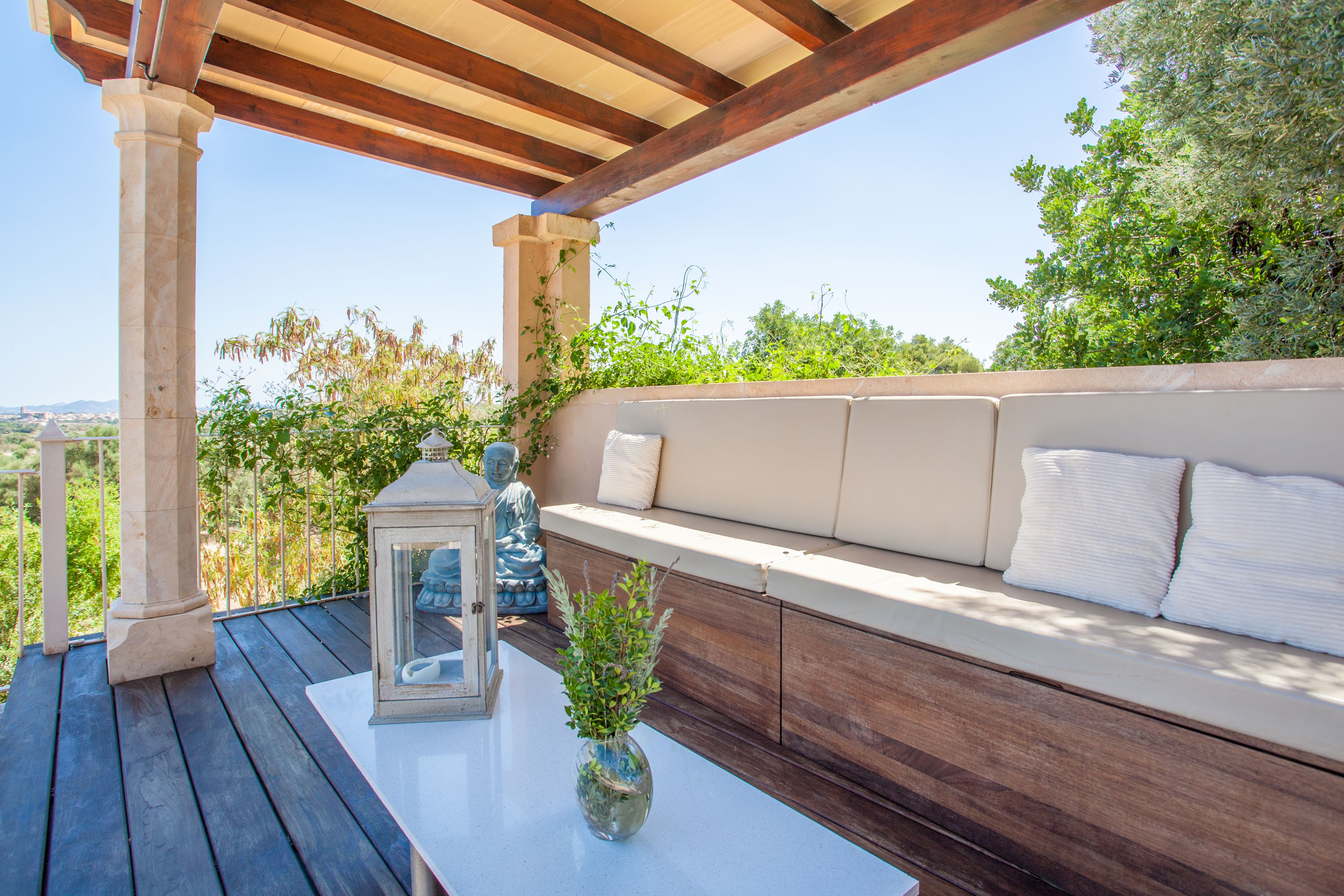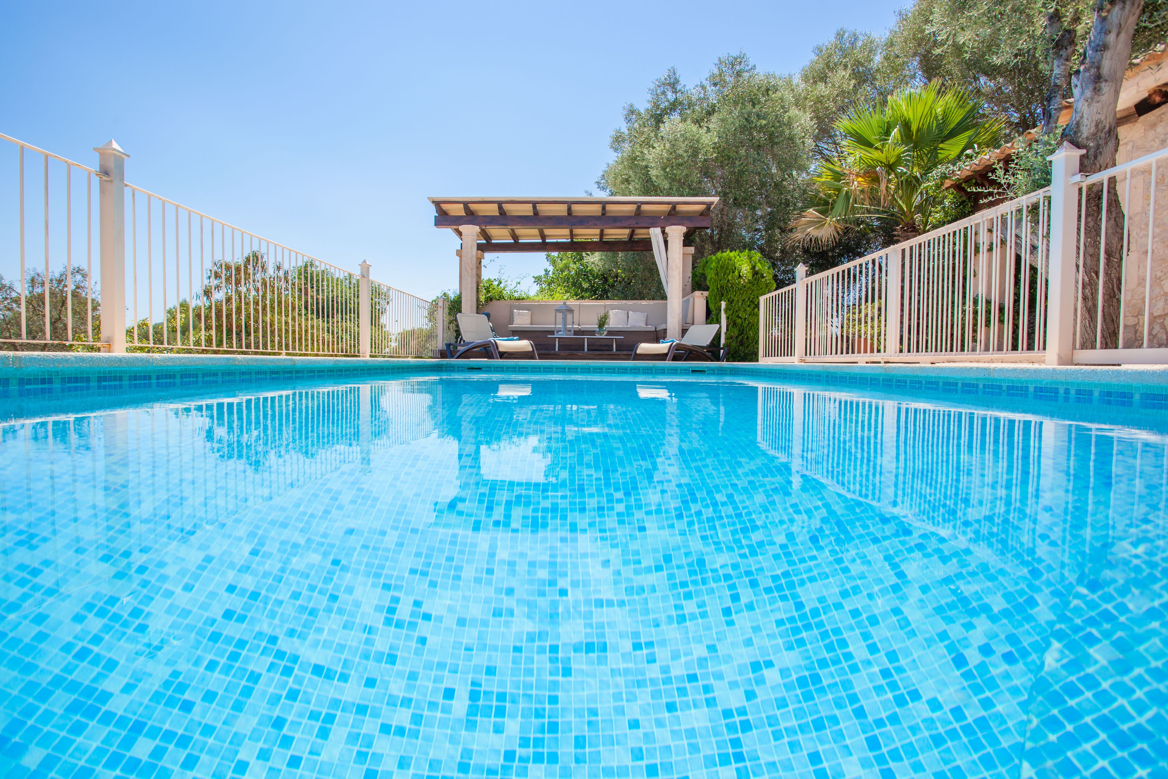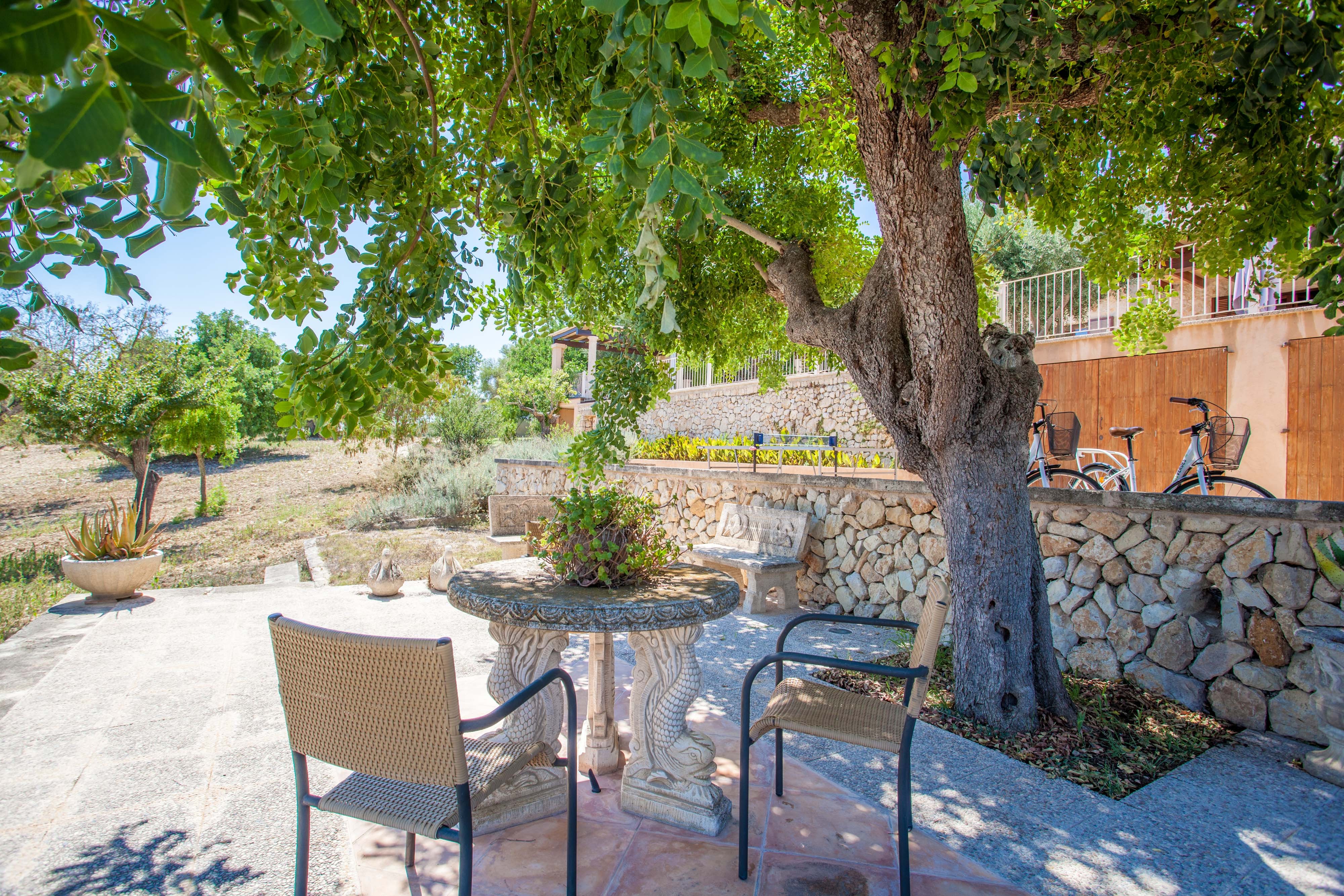 Buiten kunt u een verfrissende duik nemen in het prachtige chloorbad van 7,5 x 3,5 meter en met een diepte tussen de 1,2 en 1,6 meter. Ontspan daarna terwijl u zonnebaadt op de zonnebank of drink een cocktail in de prachtige ontspanningsruimte bij het zwembad. Er is ook een gemeubileerde veranda bij de ingang van het huis, waar u comfortabel kunt lunchen of dineren met het prachtige uitzicht op het Mallorcaanse platteland. Het pand beschikt ook over andere buitenhoeken waar u kunt uitrusten en de verbinding kunt verbreken in een prachtige omgeving. Het perceel is omheind en de privacy is totaal.