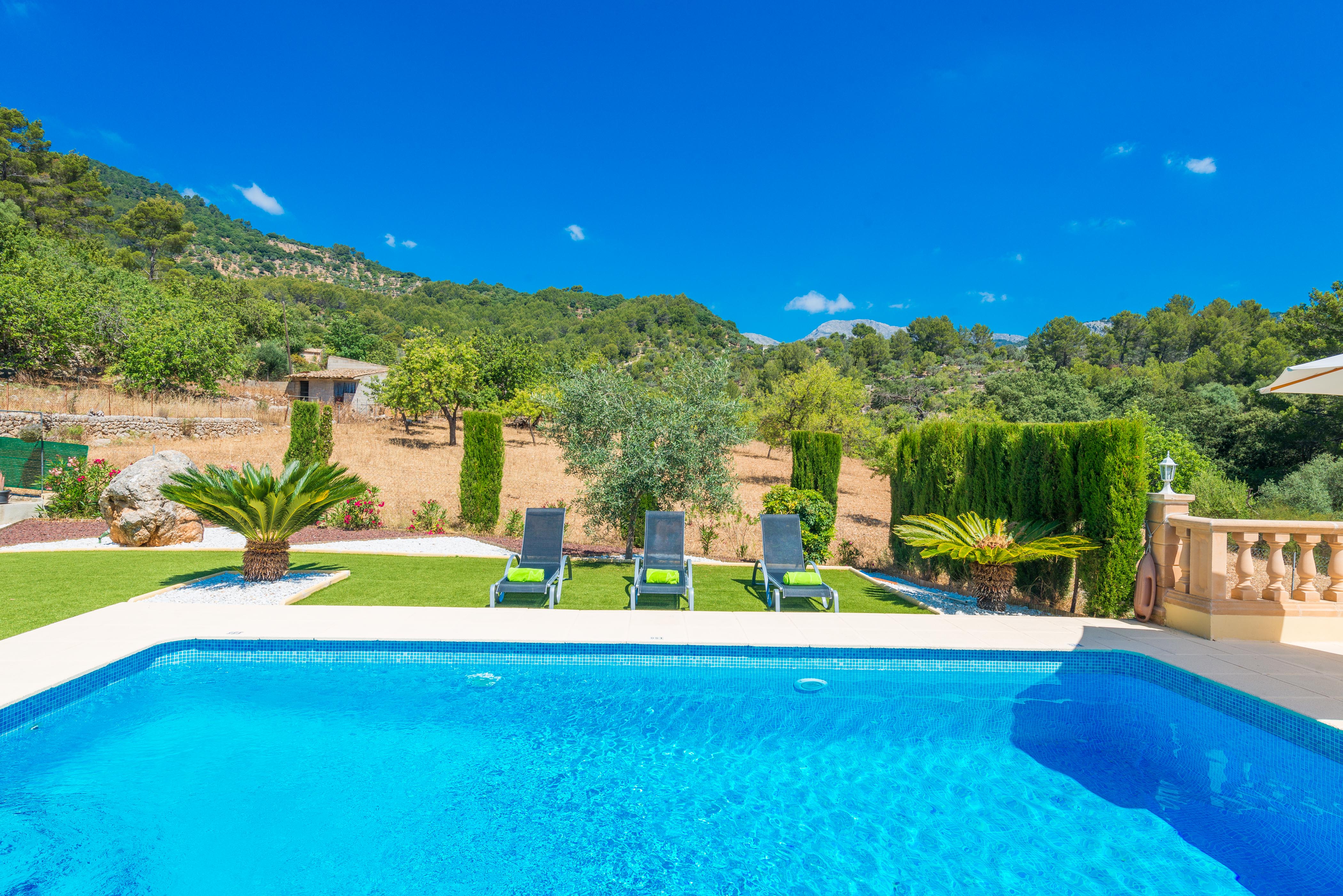 Dit huis met twee verdiepingen ligt vlakbij de berg, vlakbij de dorpen Inca en Caimari en wordt gekenmerkt door het prachtige zoutwaterzwembad omringd door gazon en 6 ligbedden, waar zonnebaden een genot zal worden. Het zwembad heeft een afmeting van 8x5m en een diepte van 1,10 tot 1,90m. In deze grote buitenruimte vind je een pingpongtafel, ideaal voor het vermaak van de gasten, en een grote veranda waar je zeker een heerlijke barbecue zult bereiden en ervan zult genieten met familie.