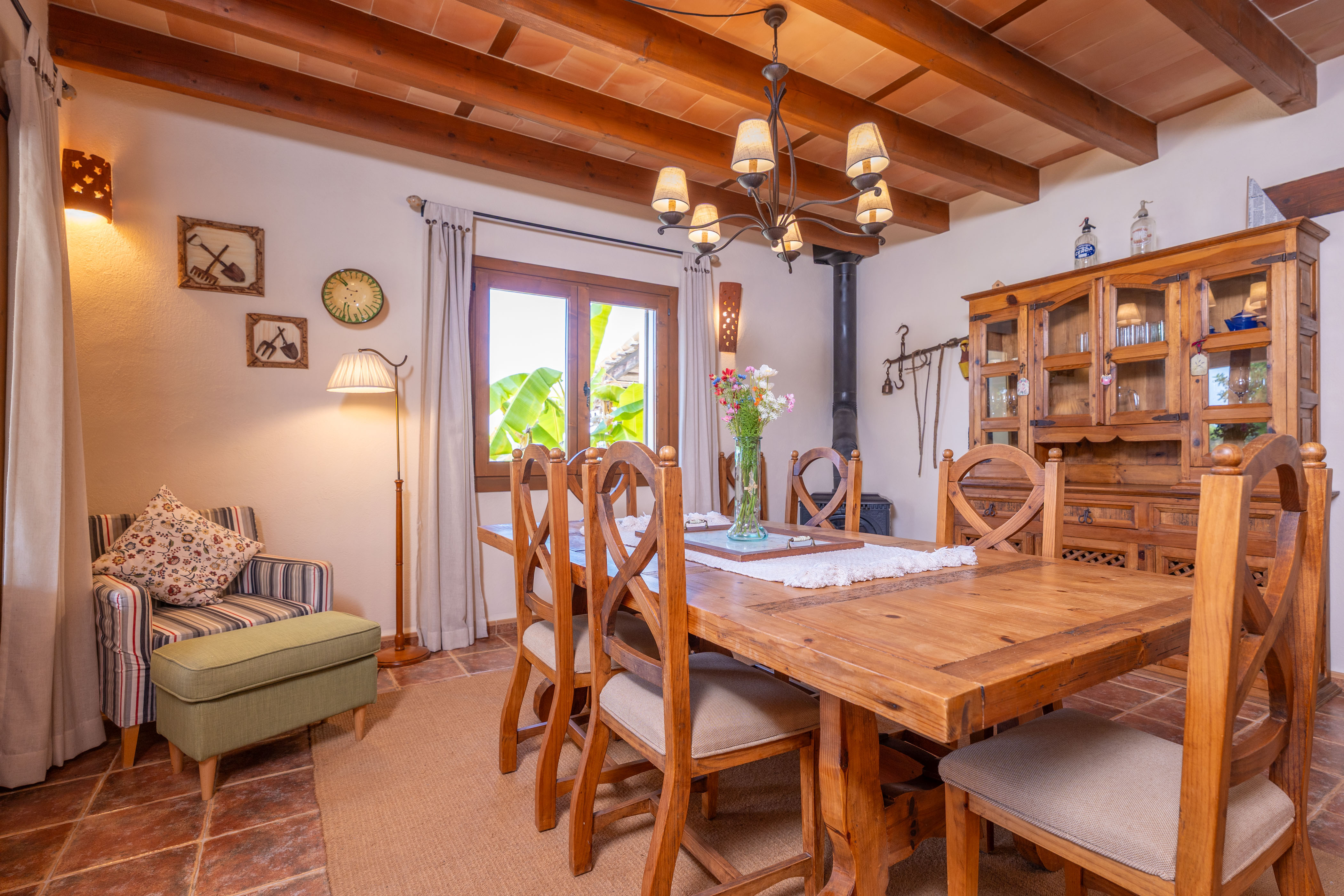Binnen is het huis verdeeld over twee verdiepingen en combineert het warmte met functionaliteit. Het interieur begint met een ruime eetkamer waar u met z'n allen kunt genieten van de heerlijke gerechten die worden bereid in de volledig uitgeruste inductiekeuken. Boven vindt u een kamer met airconditioning en een smart-tv, ideaal om 's middags te ontspannen. Op de begane grond bevinden zich de 3 slaapkamers, alle met airconditioning, waarvan 1 met twee eenpersoonsbedden en de andere 2 met een tweepersoonsbed. Eén van deze slaapkamers heeft een eigen badkamer met douche en het huis heeft een andere badkamer met bad.