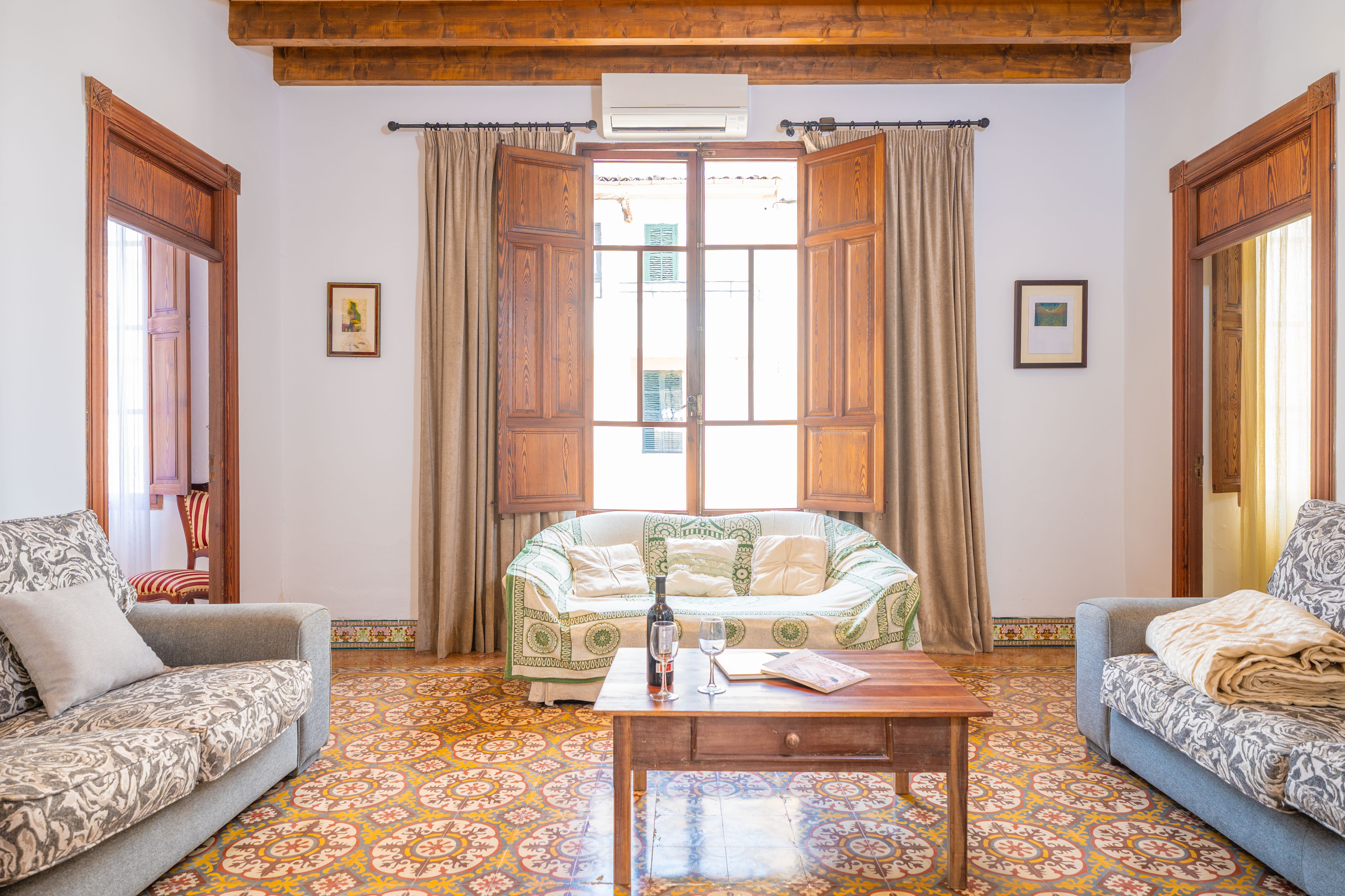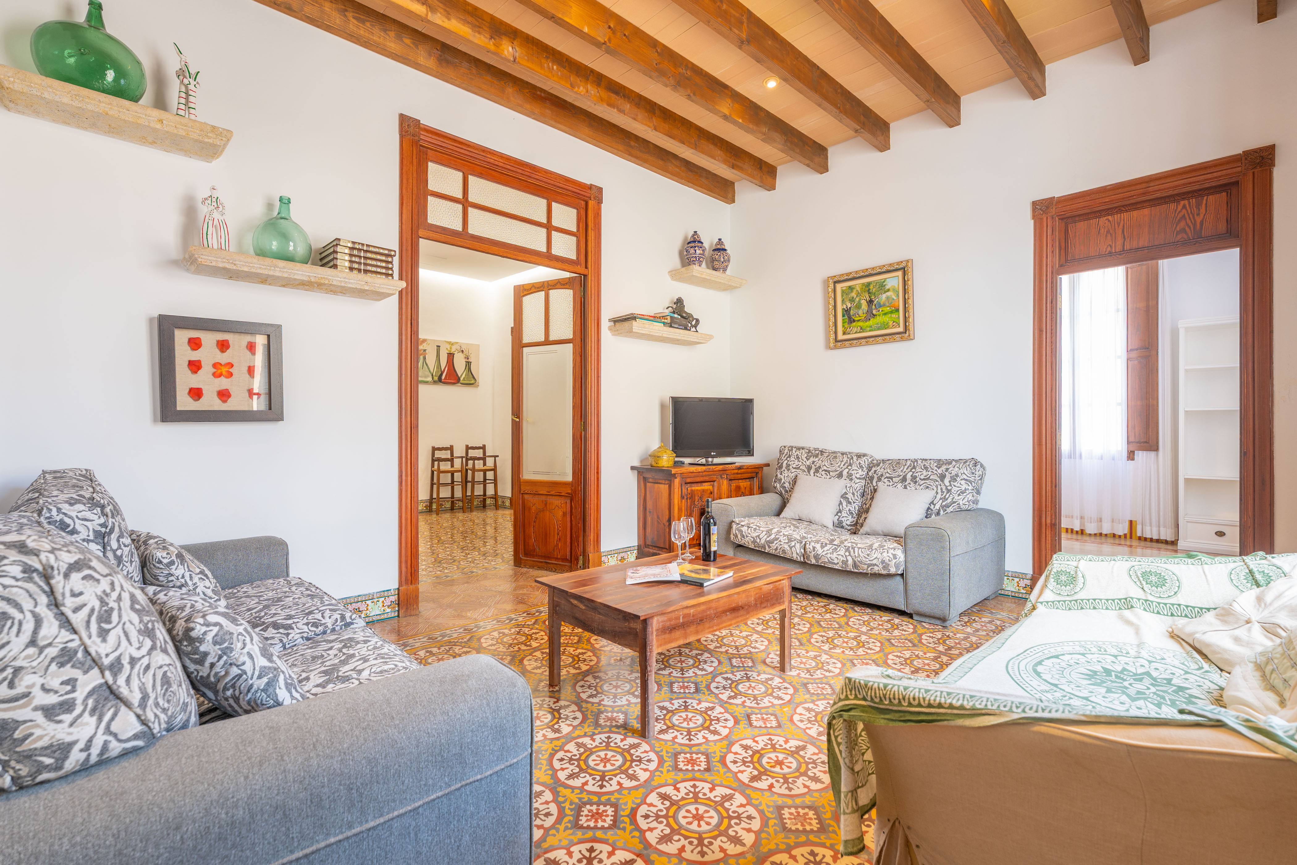 Dit 244m² grote huis met twee verdiepingen combineert de traditionele Mallorcaanse rustieke stijl met moderne elementen, waaronder hydraulische tegels. De accommodatie biedt 5 slaapkamers: 3 in het hoofdhuis en 2 in het bijgebouw, bereikbaar via de veranda.