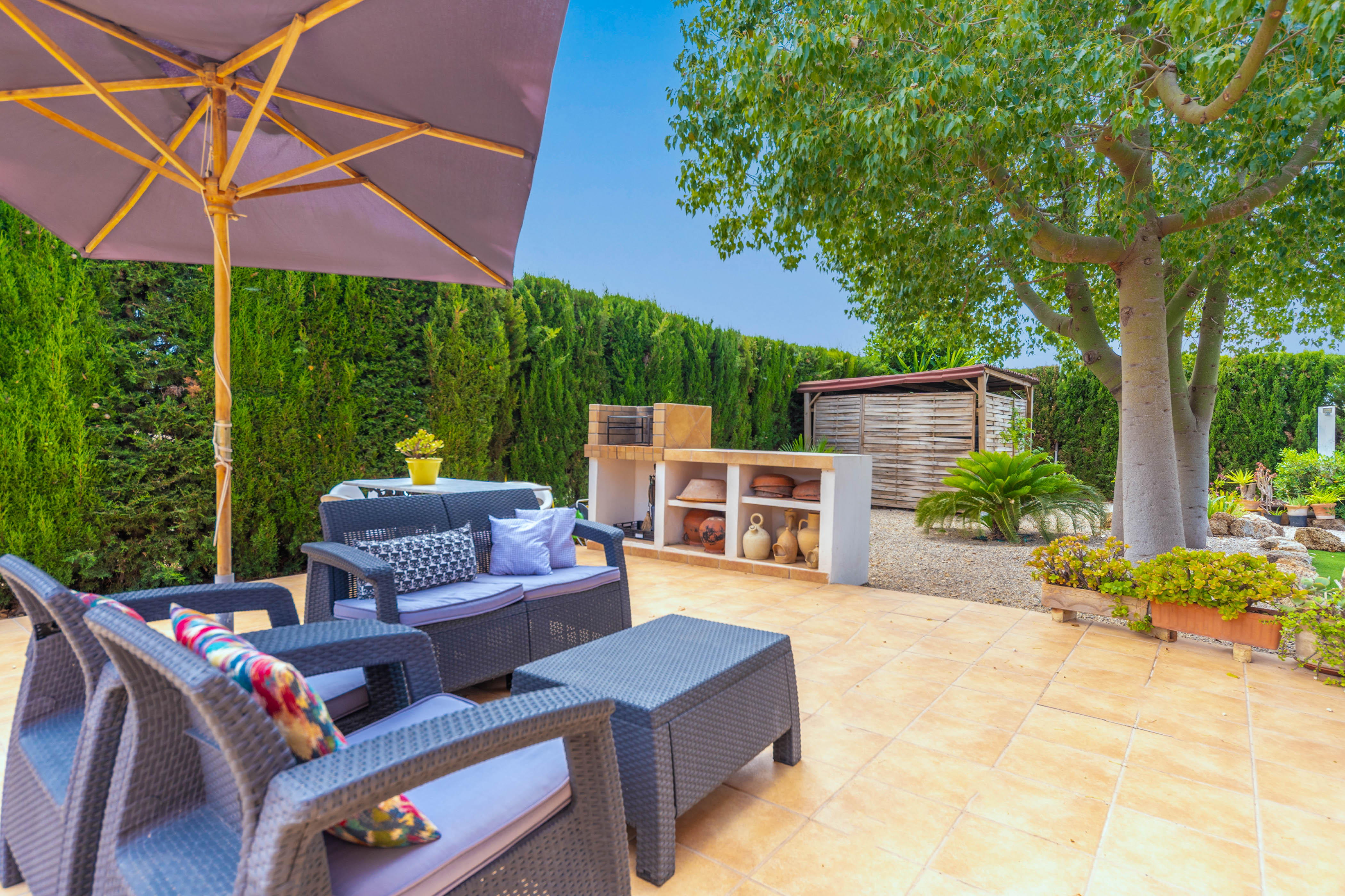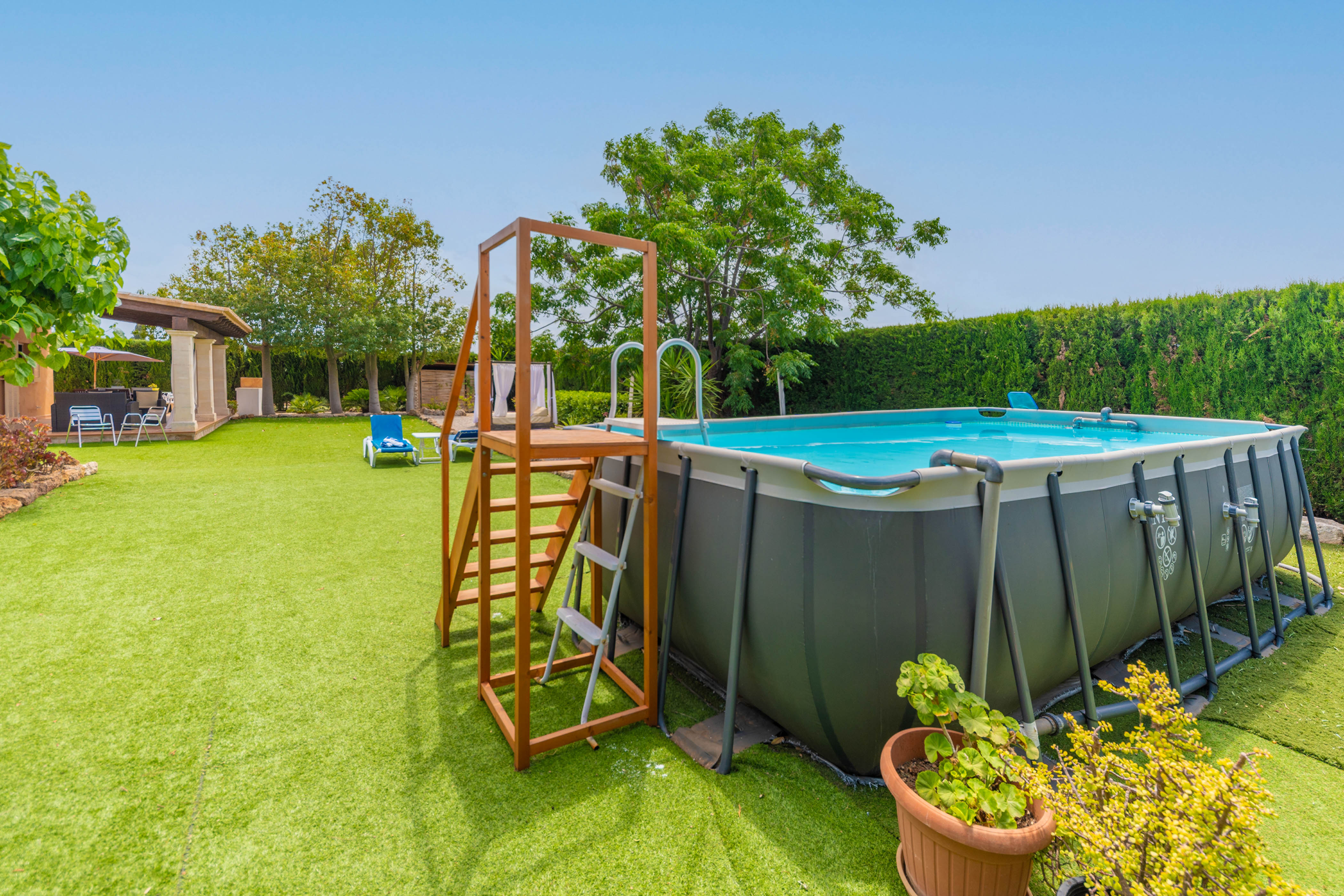 De buitenruimte is erg mooi. De prachtige kunstgrastuin omringt het bovengrondse chloorbad met een diameter van 5,5 meter en een diepte van 1,3 meter. Het is perfect om na een tijdje af te koelen en te ontspannen, terwijl u zonnebaadt op een van de 4 ligstoelen. Dan is er niet ver weg een terras met een pergola, een perfecte plek om te barbecueën. Tenslotte kunt u de rest van de avond op de veranda genieten van een drankje, omringd door totale rust en privacy.