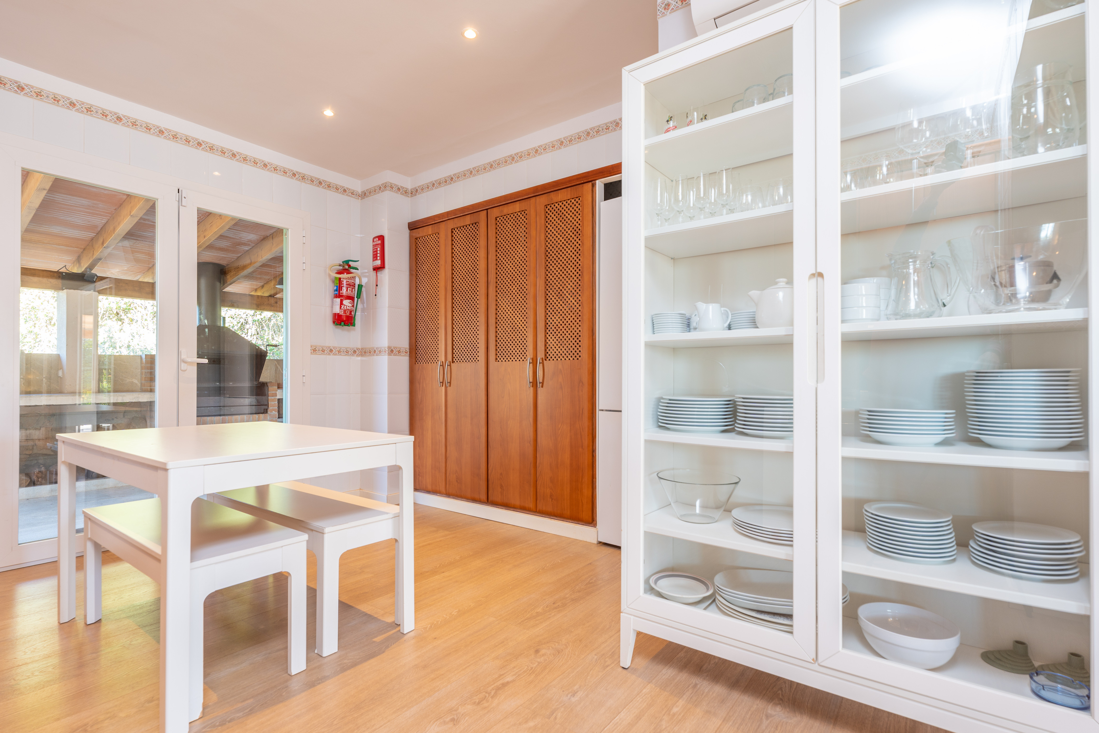 Deze stijlvolle en moderne villa strekt zich uit over twee verdiepingen en biedt comfort en gemak tijdens uw verblijf. Op de begane grond vindt u een lichte, open leefruimte met twee comfortabele banken, een Smart TV, en een eetgedeelte. Volledig voorzien van airconditioning is het de perfecte plek om 's avonds te ontspannen. De goed uitgeruste keuken heeft een inductiekookplaat en alle benodigde keukengerei om tijdens uw verblijf te koken.
